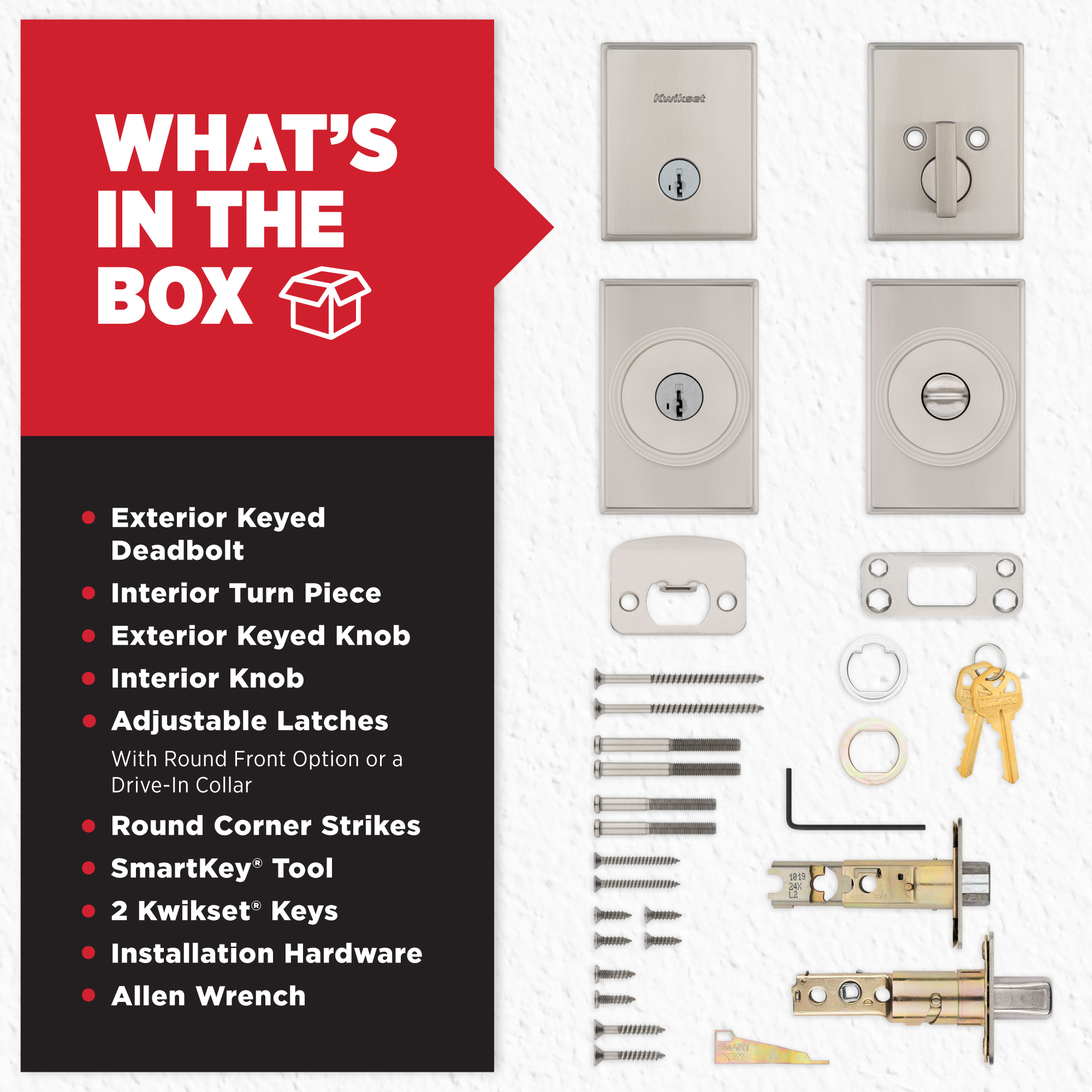 - Box Includes: Exterior Keyed Deadbolt, interior turn piece, exterior keyed knob, interiorknob, Adjustable Latches, strikes, SmartKey tool, 2 Kwikset keys, installation hardware andAllen wrench
