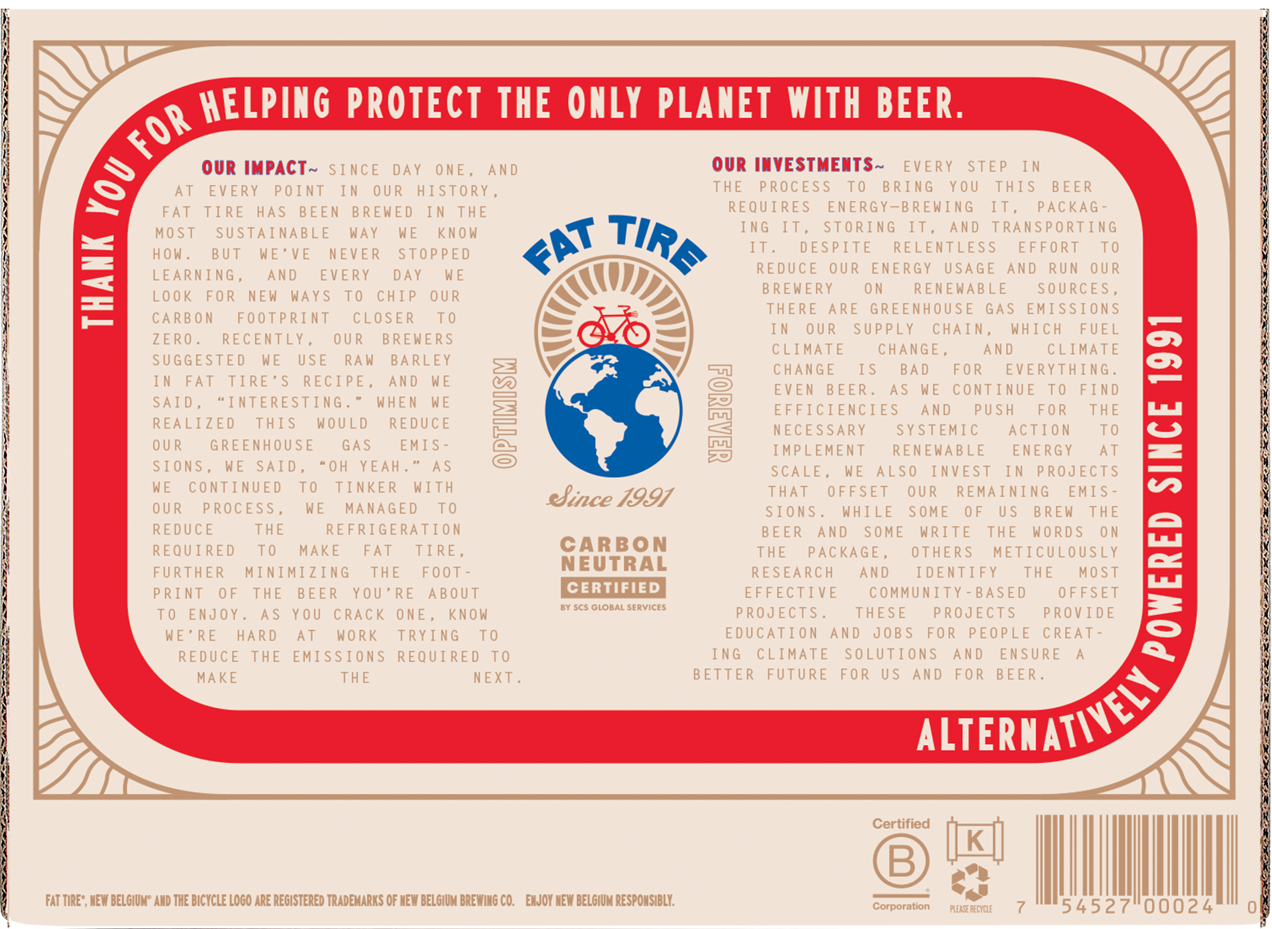 Made with premium ingredients, Fat Tire is a bright and balanced beer that's certified carbon neutral. This crisp, premium ale has a nice, rich golden pour. It also has subtle malty notes and hints of caramel that go down smooth. Fat Tire is an easy-drinking, classic craft beer that you can’t help but return to. Since 1991, Fat Tire has been working very hard to reduce our environmental impact, while investing a portion of every Fat Tire you buy in community-based climate action. From certified B-Corp New Belgium Brewing, this ale is easy-drinking and easy on the planet. 5.2% ABV. UOM is 12 fluid ounces. Count per pack: twelve bottles.