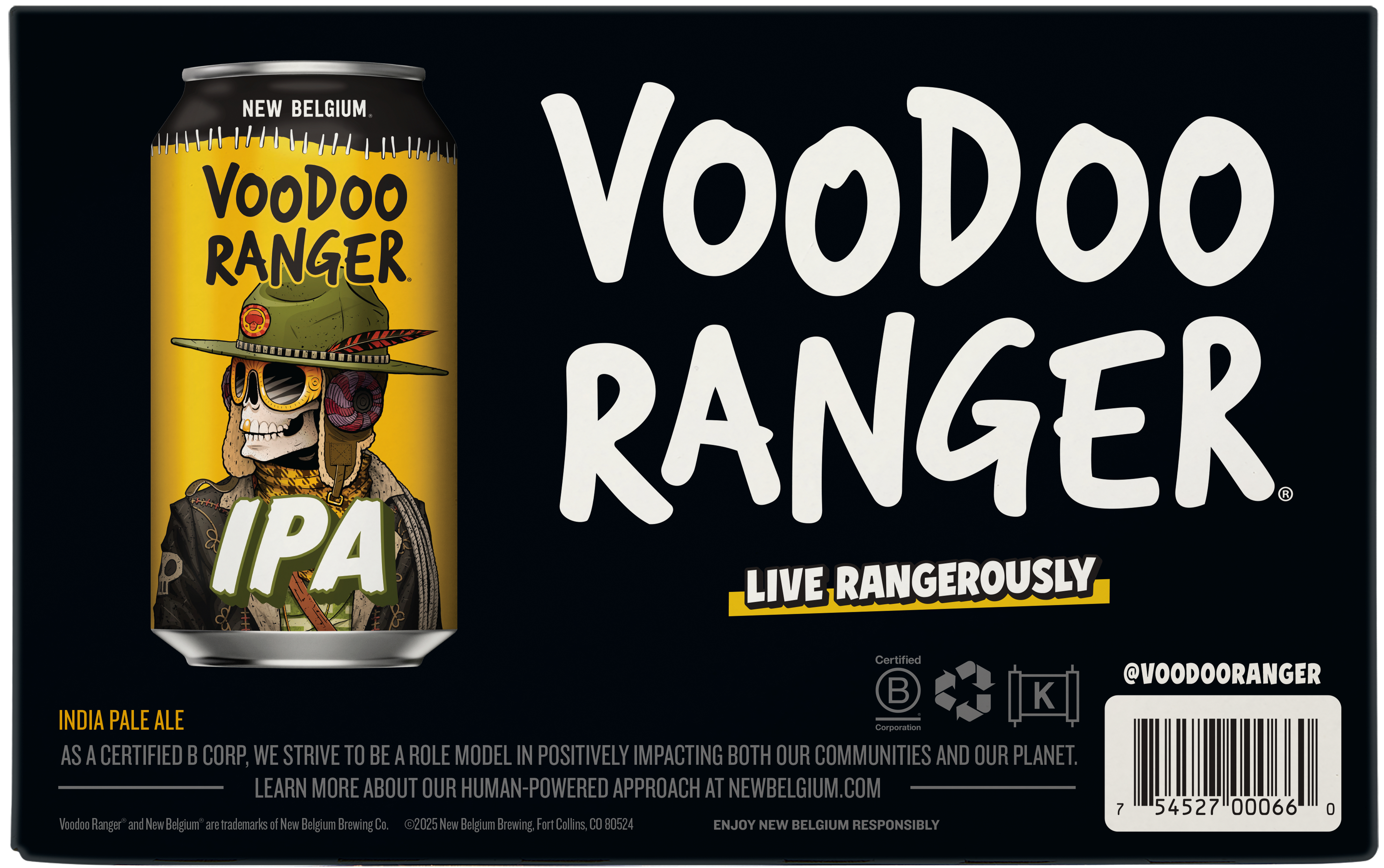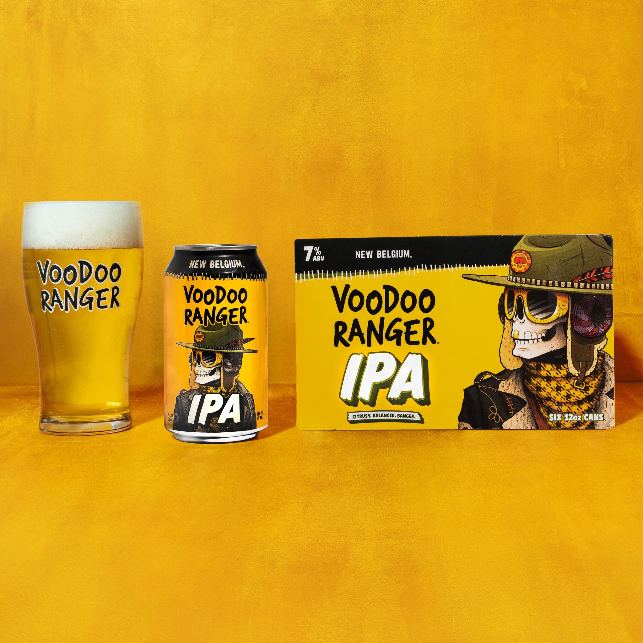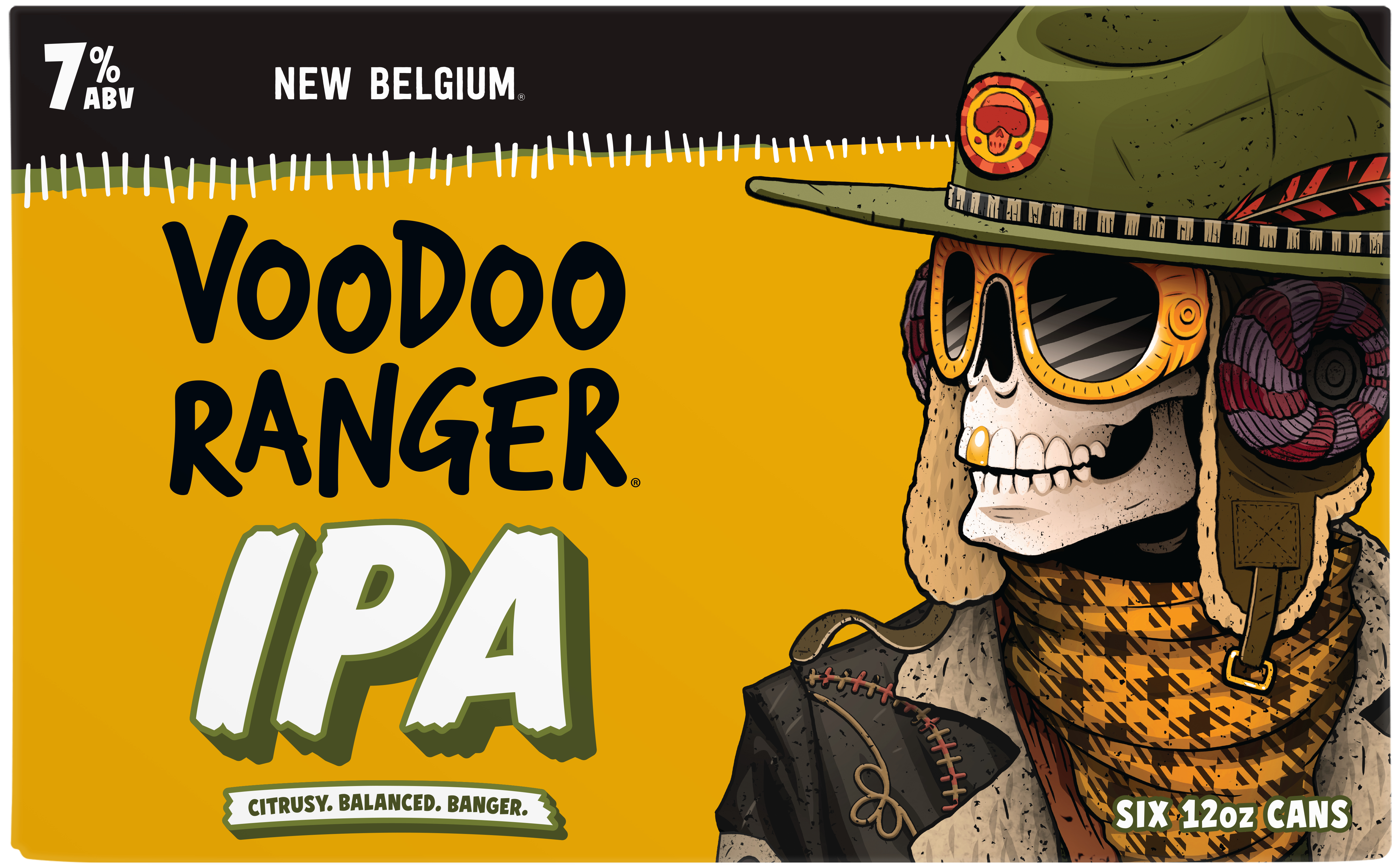 Voodoo Ranger IPA is a beer bursting with tropical aromas and fruit flavors from Mosaic and Amarillo hops. This juicy, golden IPA is perfectly bitter with a refreshing, sublime finish. It's a classic craft beer that's equal parts hoppy and bright. Crafted with precision by skilled brewers, Voodoo Ranger IPA is the embodiment of hoppy artistry. Its well-balanced profile caters to both seasoned hop-heads and newcomers to the IPA scene. Plus, it has a 7% ABV, making it a fan-favorite beer on the Voodoo Ranger roster. If you’re looking for innovative IPAs that are hop forward, bold, and occasionally hazy, the Voodoo Ranger fam has your back. Brewed by New Belgium Brewing, a certified B-Corp and proud member of 1% for the Planet. UOM is 12 fluid ounces. Count per pack: six cans.
