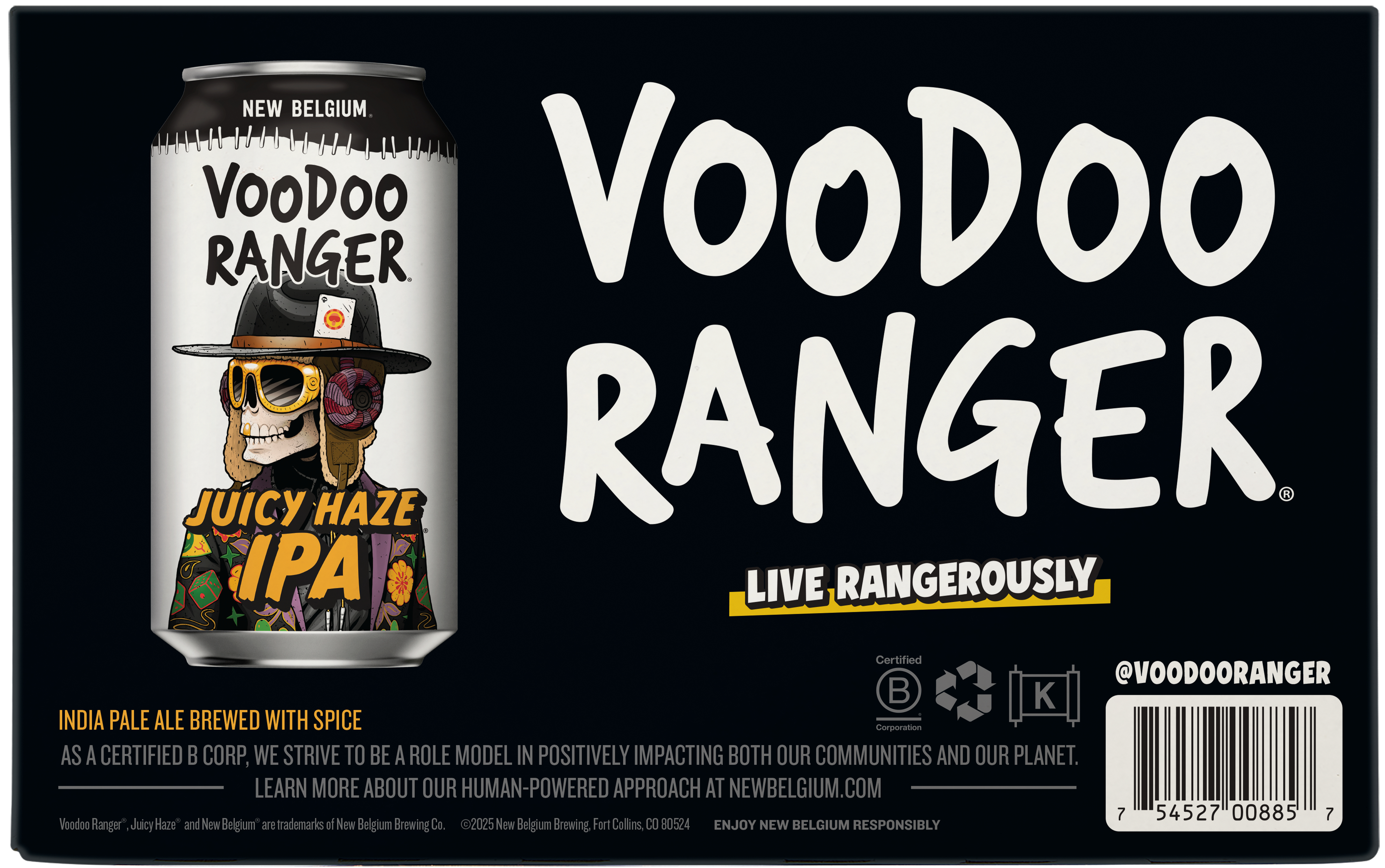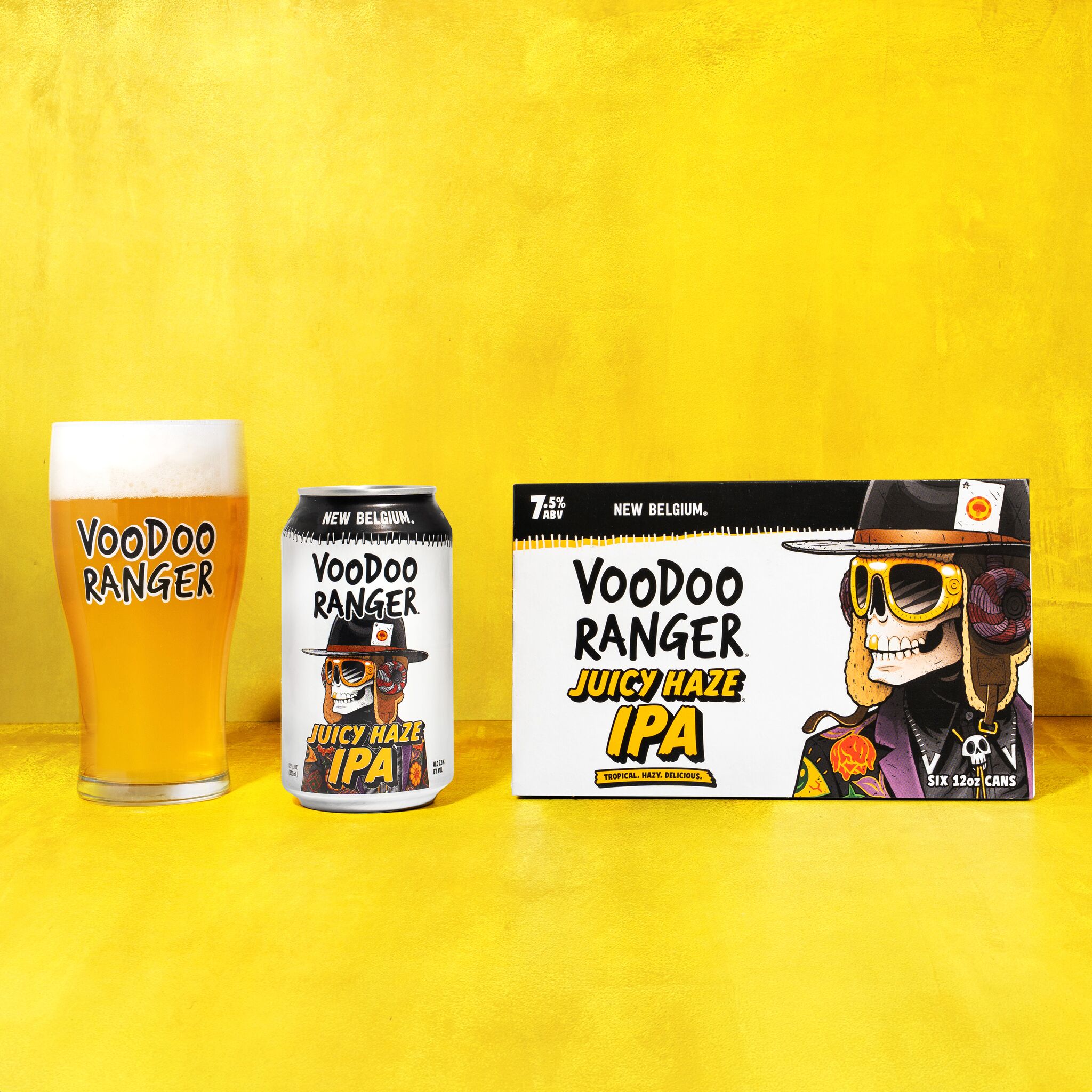 Voodoo Ranger Juicy Haze IPA is a beer packed with bright tropical aromas and brilliant citrusy flavors. It's a bold, juicy IPA with just the right amount of haze and fruity aromas. Juicy Haze is the kind of craft beer that'll punch your tastebuds, but then hit you with a surprising and pleasantly smooth finish. It’s like a satisfying and refreshing rollercoaster of fruit-forward flavor. With a 7.5% ABV, a seriously juicy IPA never tasted so good. Brewed by New Belgium Brewing, a certified B-Corp and proud member of 1% for the Planet. If you’re looking for innovative IPAs that are hop forward, bold, and occasionally hazy, the Voodoo Ranger fam has your back. UOM is 12 fluid ounces. Count per pack: six pack, cans.
