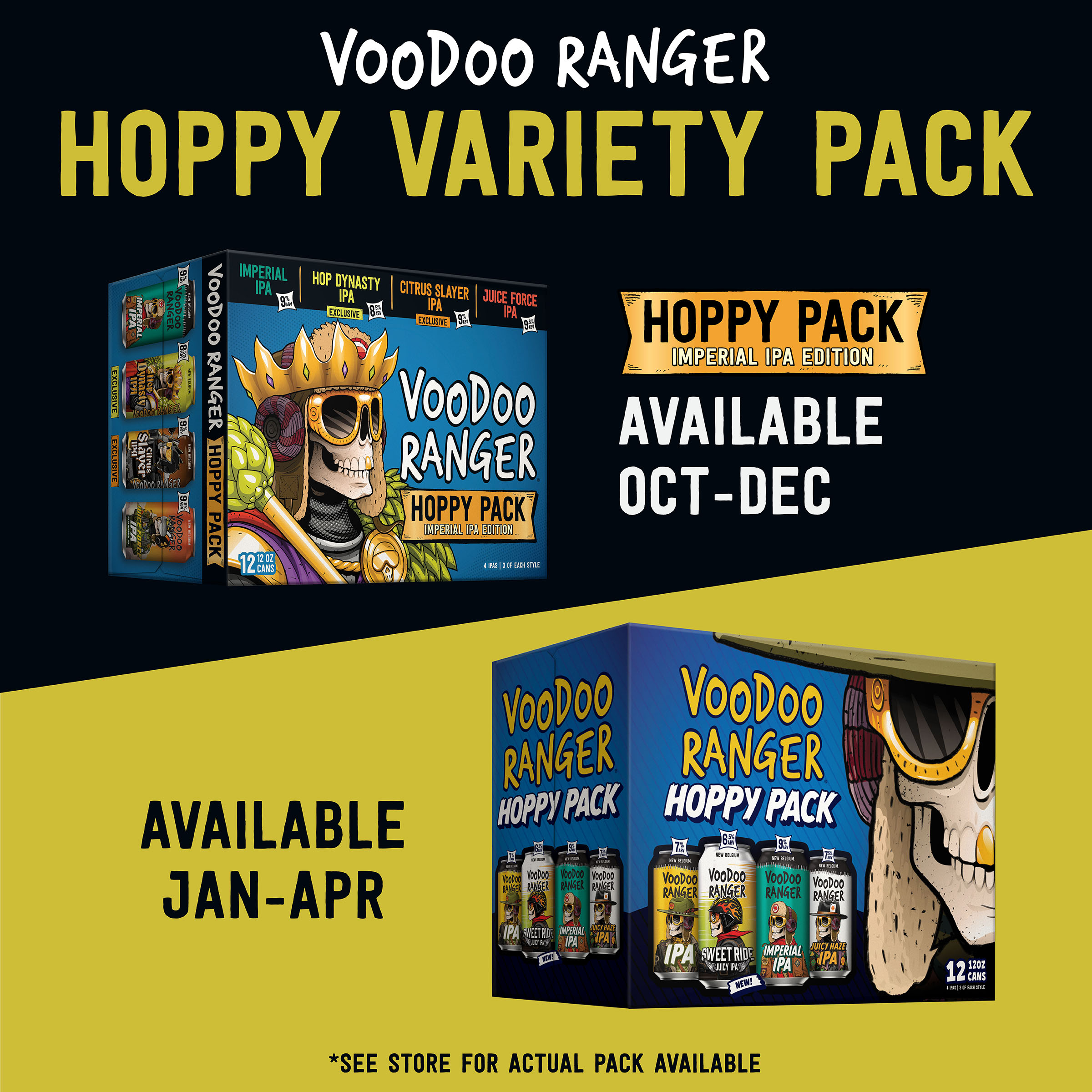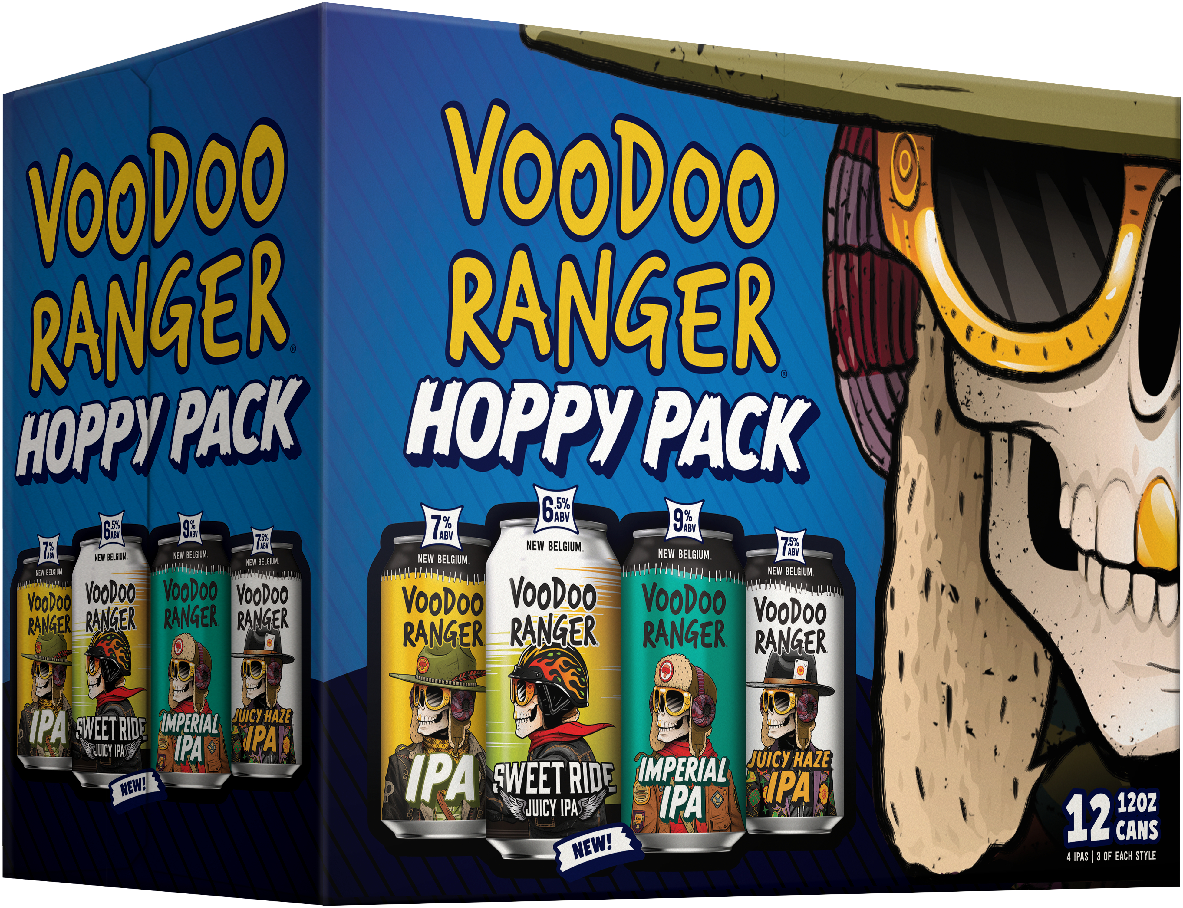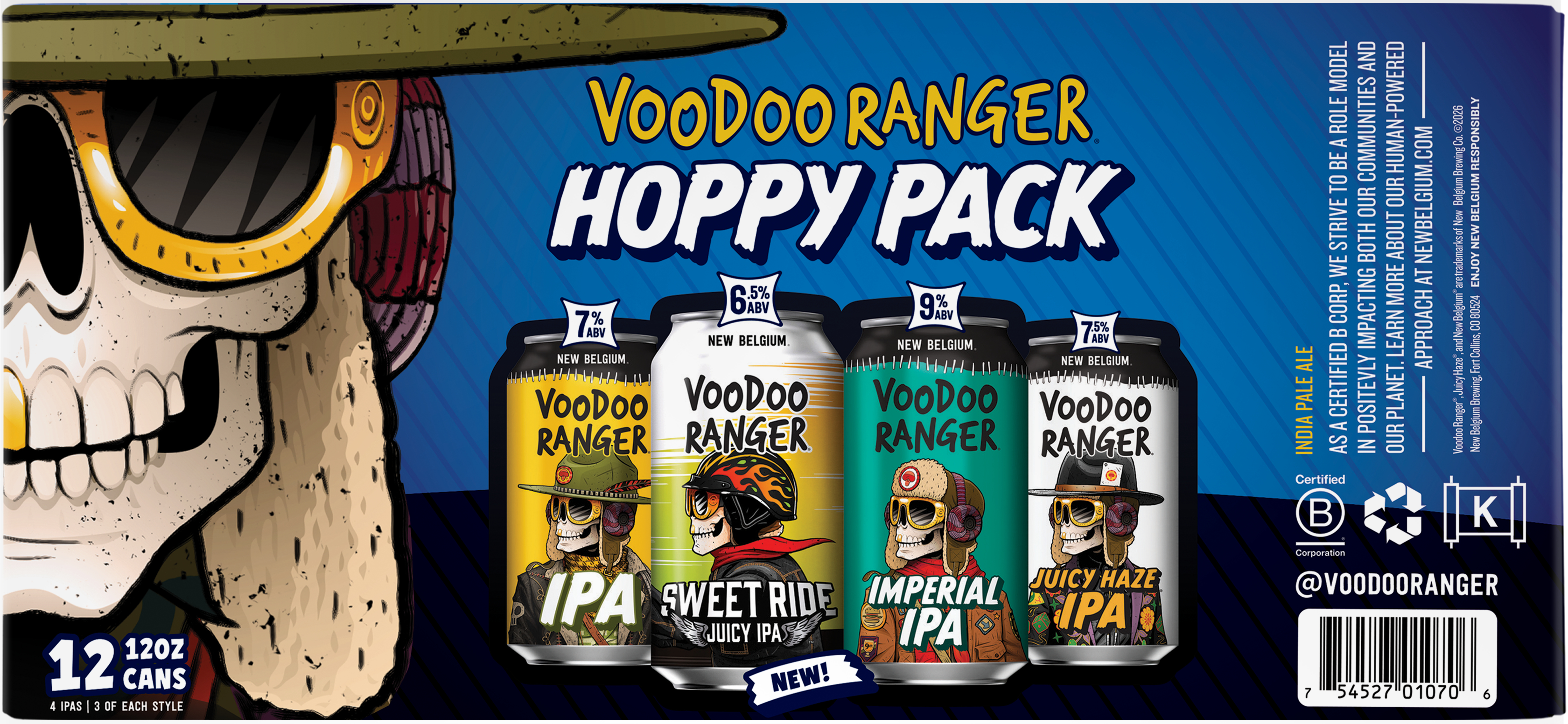 Voodoo Ranger IPA Variety Pack has a perfect mix of fan favorites and exclusive releases. These premium craft beers are innovative, hoppy and delicious. It's the perfect pack for those who seek a bit of adventure in their beer choices. Whether you're an IPA enthusiast, Voodoo Ranger die-hard, or just hop curious, there's something in this variety pack for you. Who knows, maybe you’ll even find your new favorite beer. Will it be a hazy IPA with fruit-forward flavors? There’s only one way to find out (aka drink up)! Please note, it’s possible that you may get a different Voodoo Ranger Variety pack than the one shown on the website if your store is transitioning from one variety pack to another. ABV varies. Brewed by New Belgium Brewing, a certified B-Corp and proud member of 1% for the Planet. UOM is 12 fluid ounces. Count per pack: twelve pack, cans.