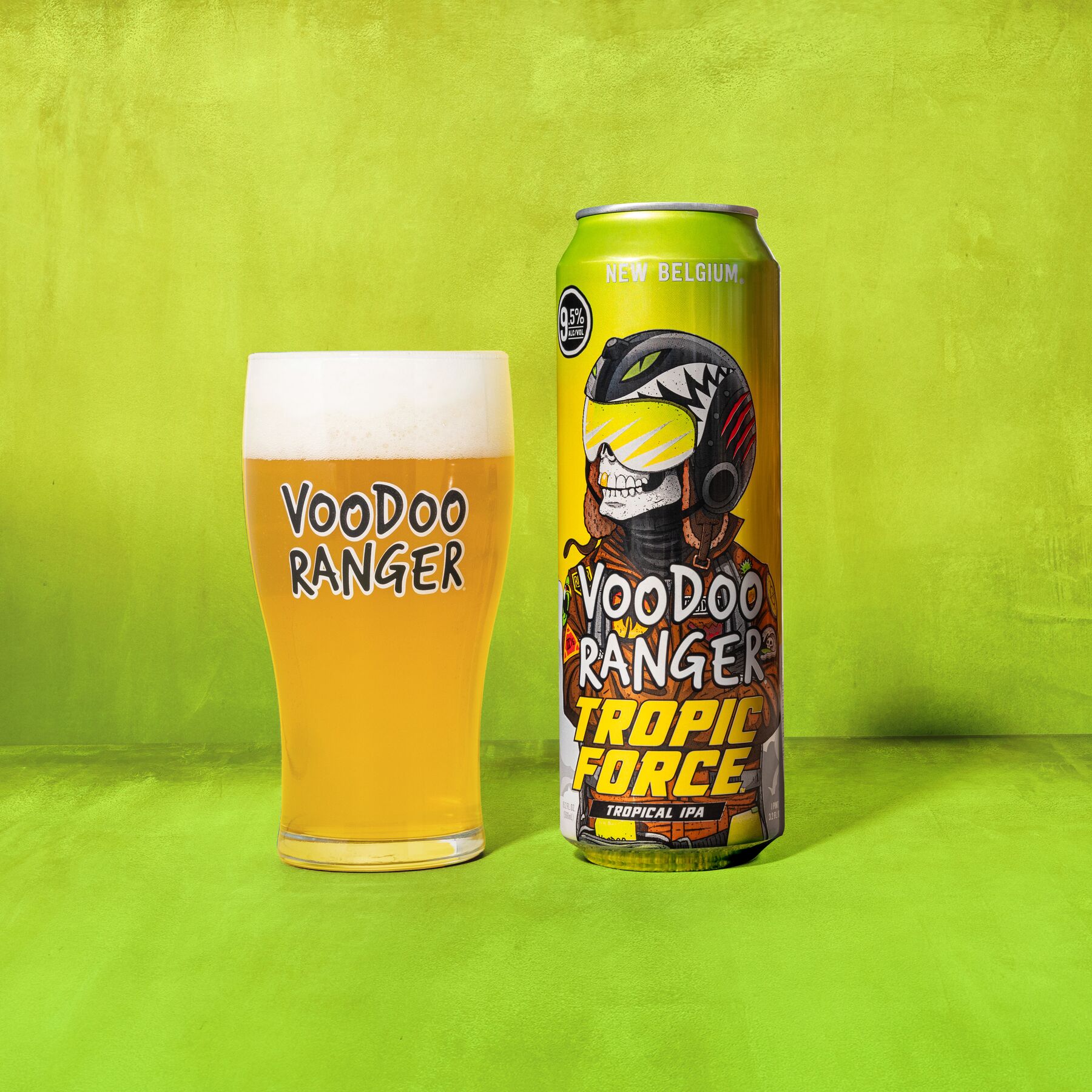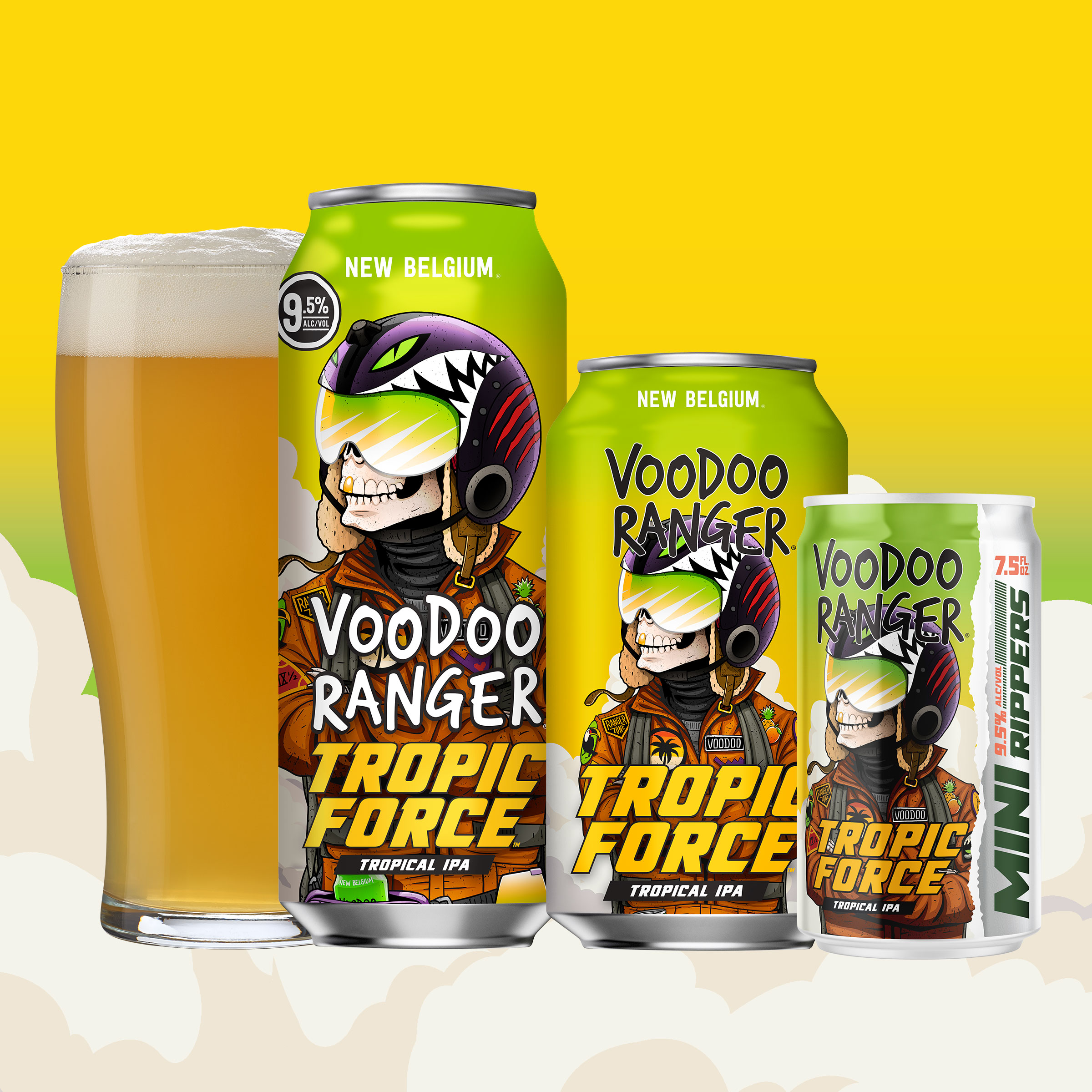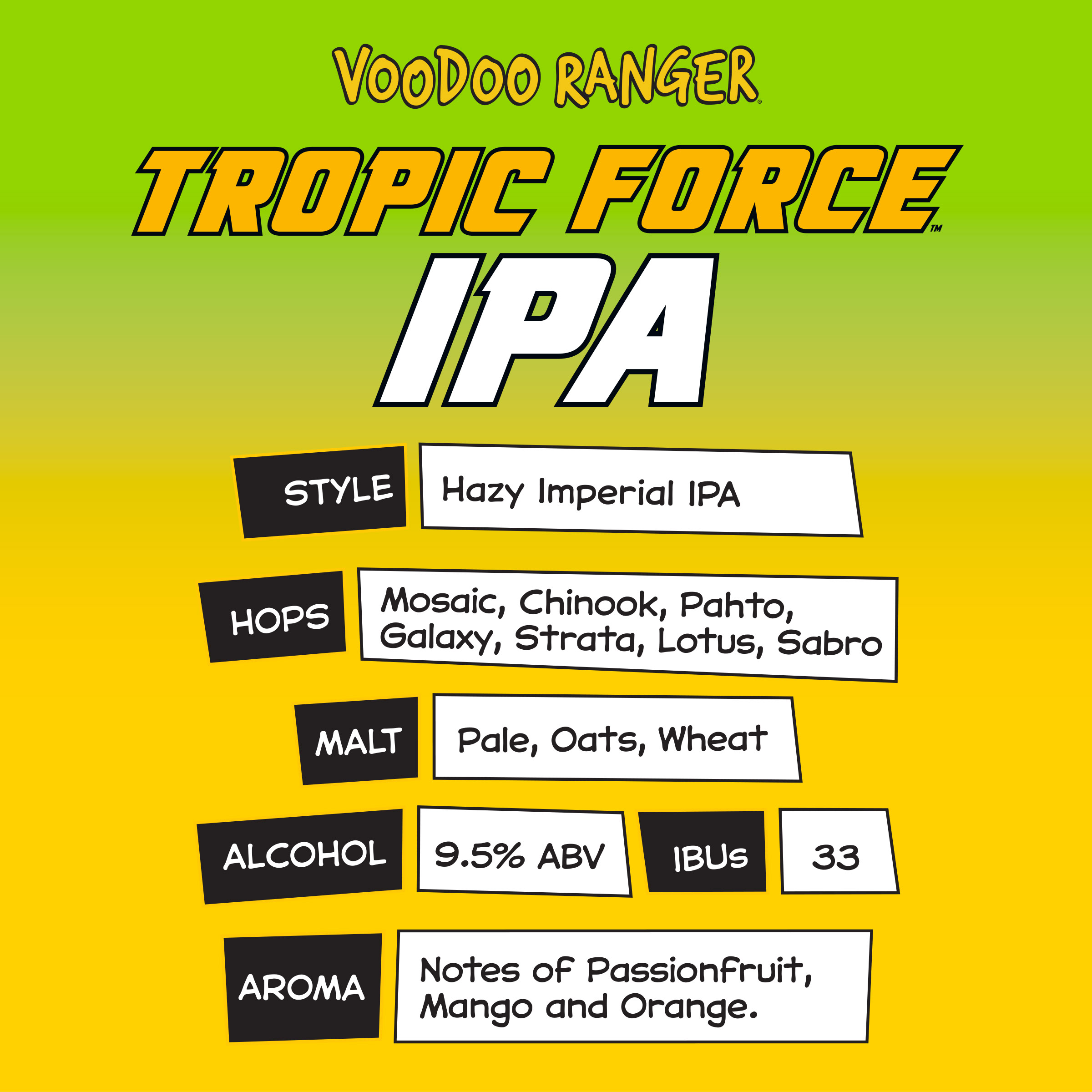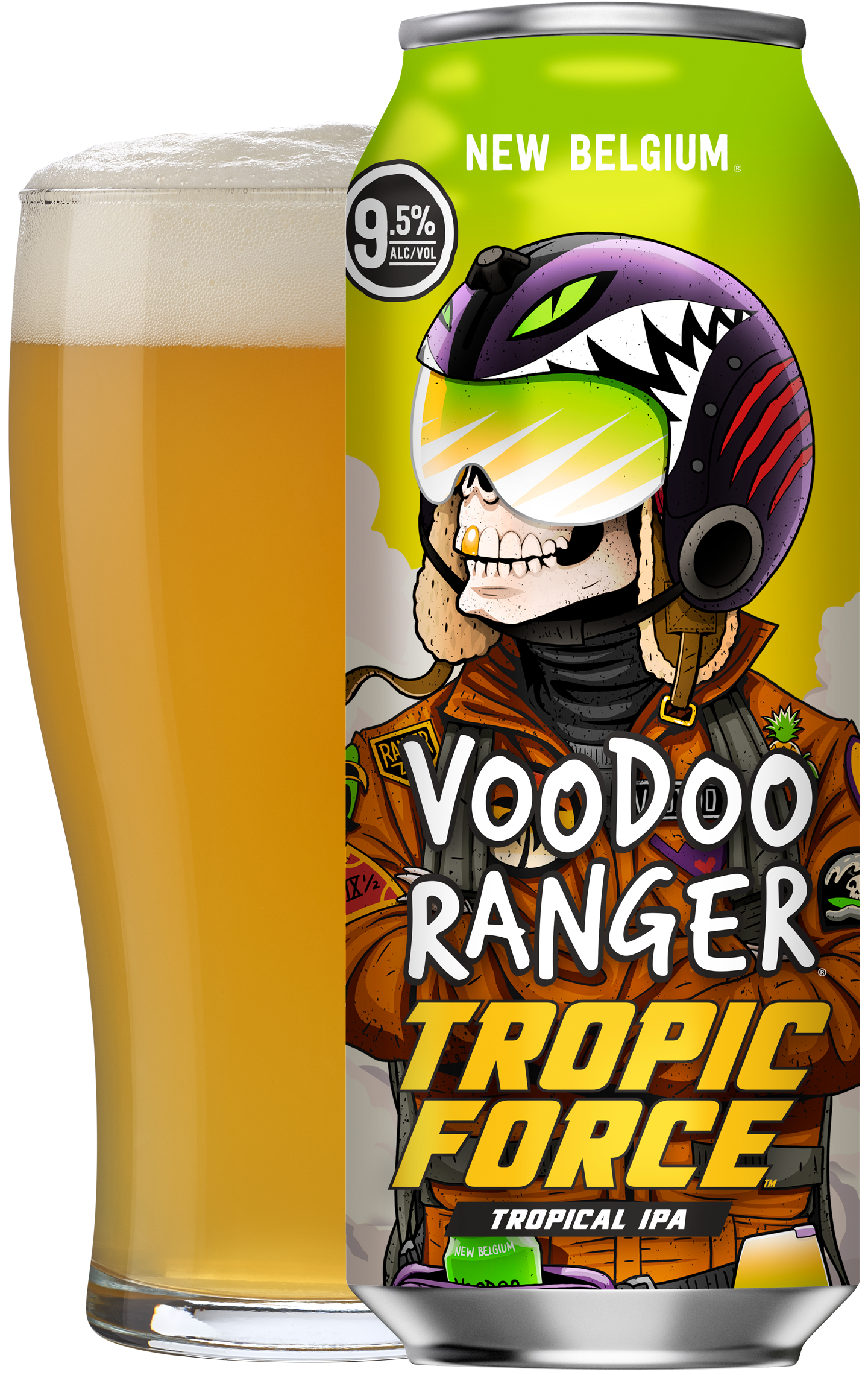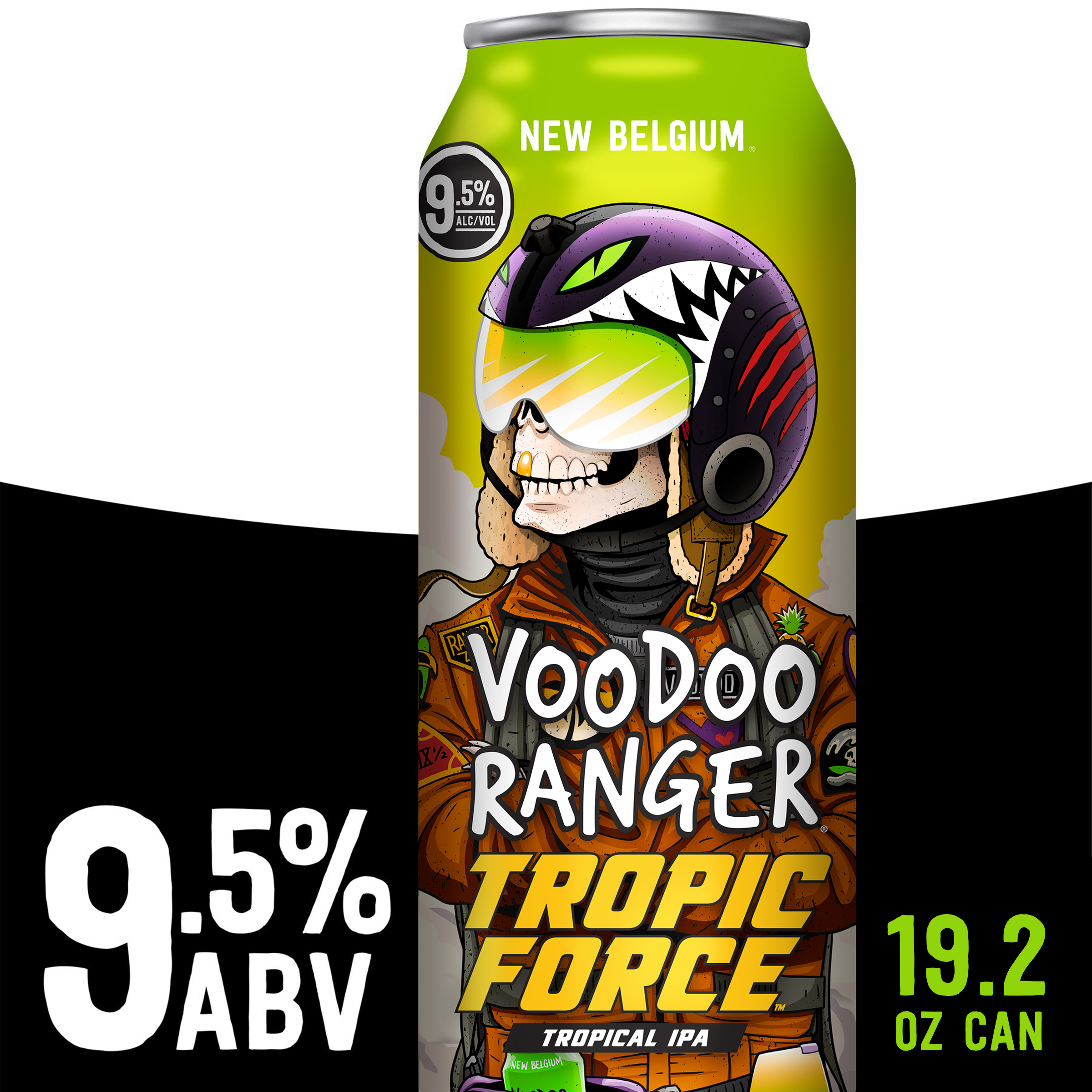 Voodoo Ranger Tropic Force Tropical IPA delivers hard hitting pineapple and mango at a full throttle 9.5% ABV. This hazy IPA is packed with tropical flavor that’s juicy and delicious. It’s a bright and bold IPA that’ll have your taste buds soaring. Prepare for take-off and hold on to your aviators cause this high-flying craft beer also has a helluva tropical bite. If you’re looking for innovative craft IPAs that are hop forward, bold, and occasionally hazy, the Voodoo Ranger fam has your back. Brewed by New Belgium Brewing, a certified B-Corp and proud member of 1% for the Planet. UOM is 19.2 fluid ounces. Count: one can.