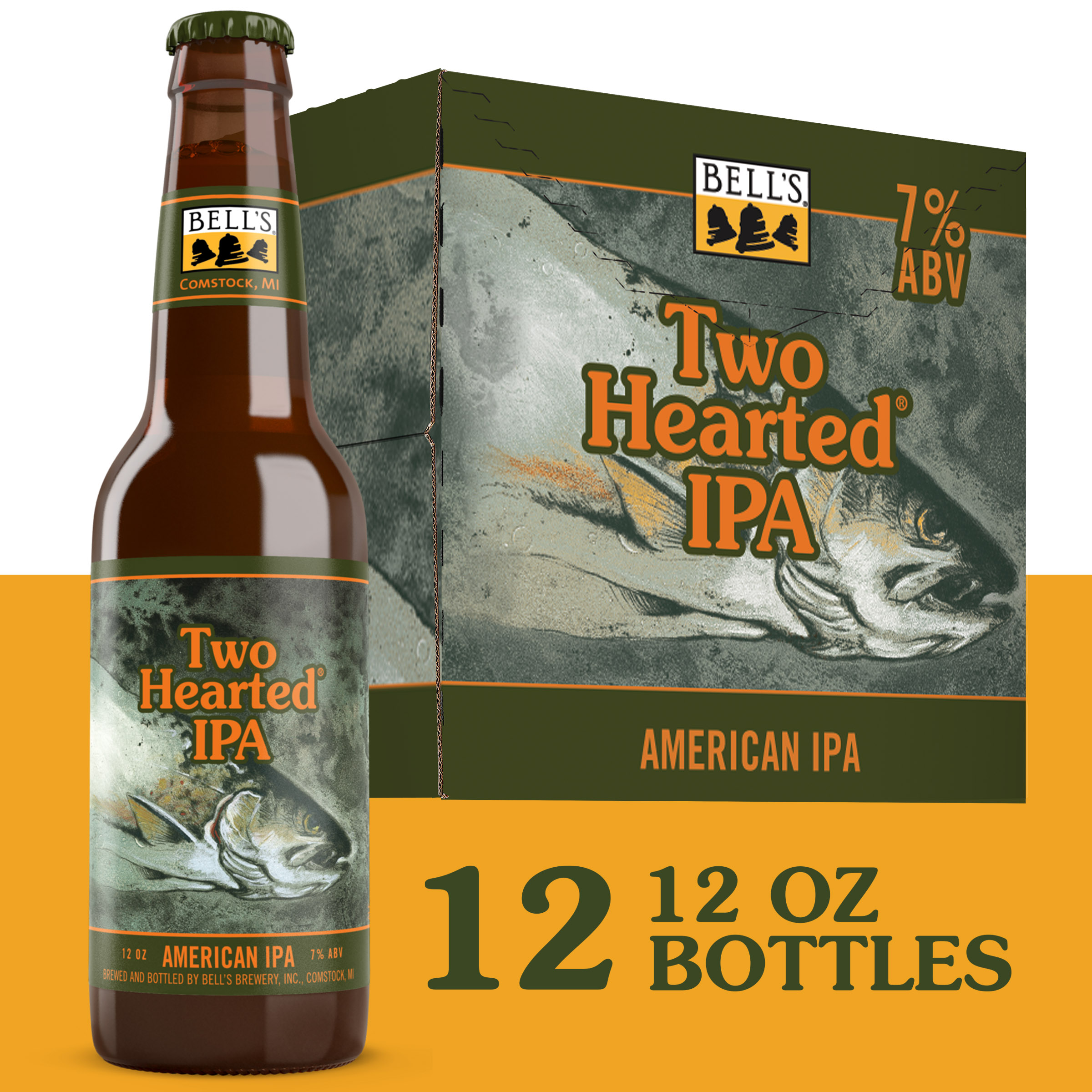 Two Hearted IPA from Bell's Brewery is an iconic American IPA suited for adventures everywhere. It's bursting with fresh hop aromas from 100% Centennial hops. It features bright, satisfying flavors that are smooth and refreshing. Two Hearted is piney, malty and bitter-forward, with hints of citrus. Overall, it is a very classic, balanced, and drinkable IPA. Named after fishing waters in Michigan's Upper Peninsula, Two Hearted is beloved by longtime and new craft beer drinkers alike. Two Hearted IPA is proudly brewed by Bell’s Brewing. Since 1985, Bell’s has been committed to quality and flavor. 7% ABV. UOM is 12 fluid ounces. Count per pack: twelve bottles.