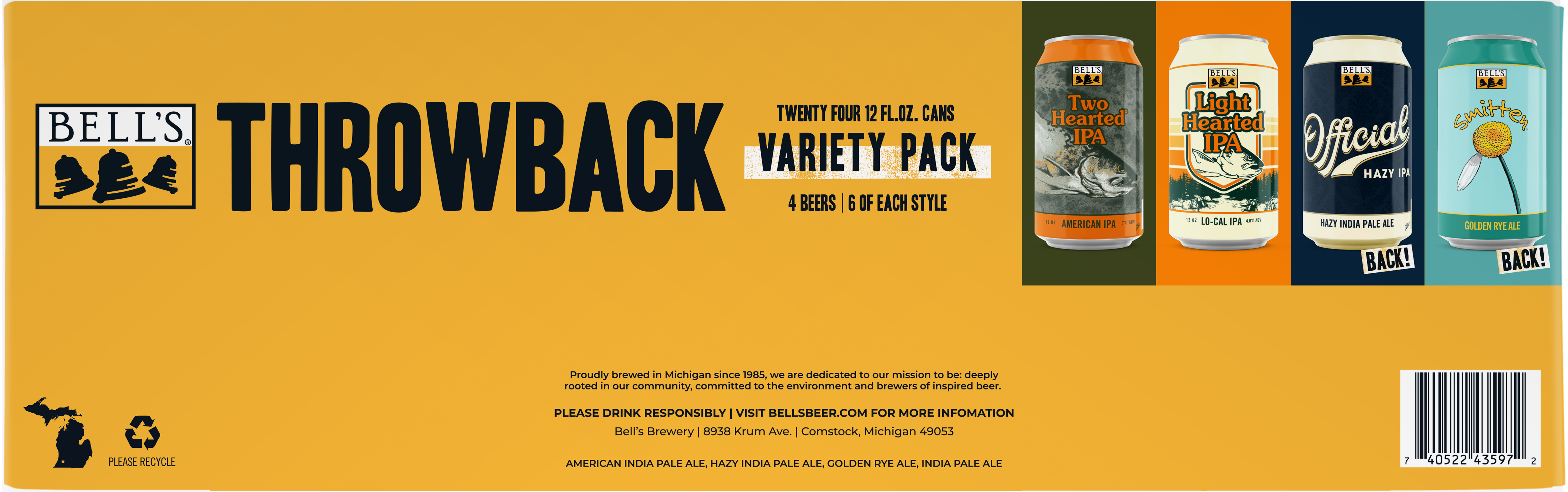 Meet the Throwback Variety Pack from Bell’s Brewery. Featuring current favorites as well as past brews available for a limited time and only in this variety pack. Proudly brewed by Bell’s Brewing, which has been creating high quality craft beers in Michigan since 1985 and is a Certified B-Corp. ABV Varies. Please note that it’s possible you may bet a different variety pack than the one shown on the website if your store is transitioning from one variety pack to the next. UOM is 12 fluid ounces. Count per pack: twenty-four pack, cans.