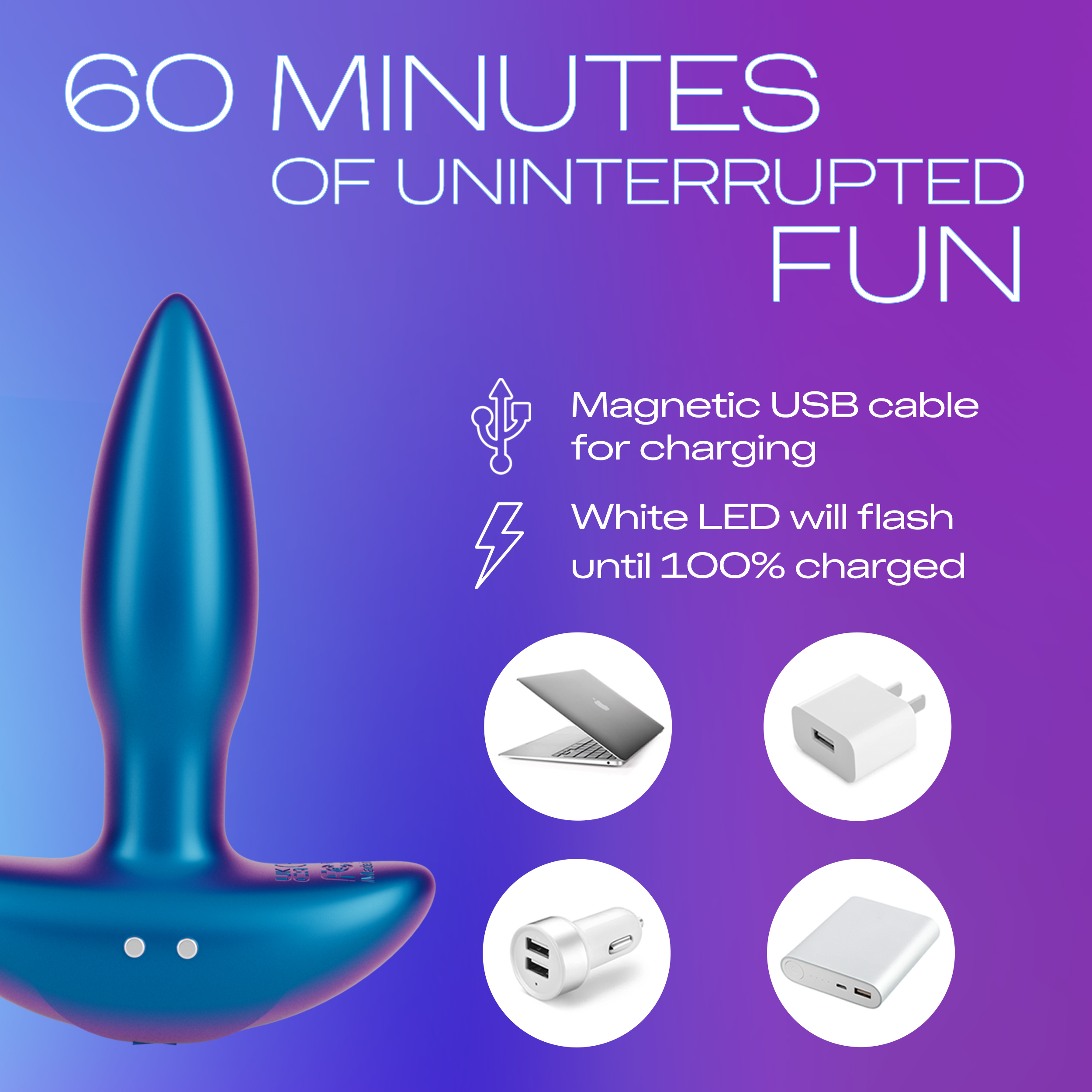 - USB RECHARGEABLE ANAL SEX TOY: USB charging cable included; Anal toy lasts for at least 60 minutes on a single charge