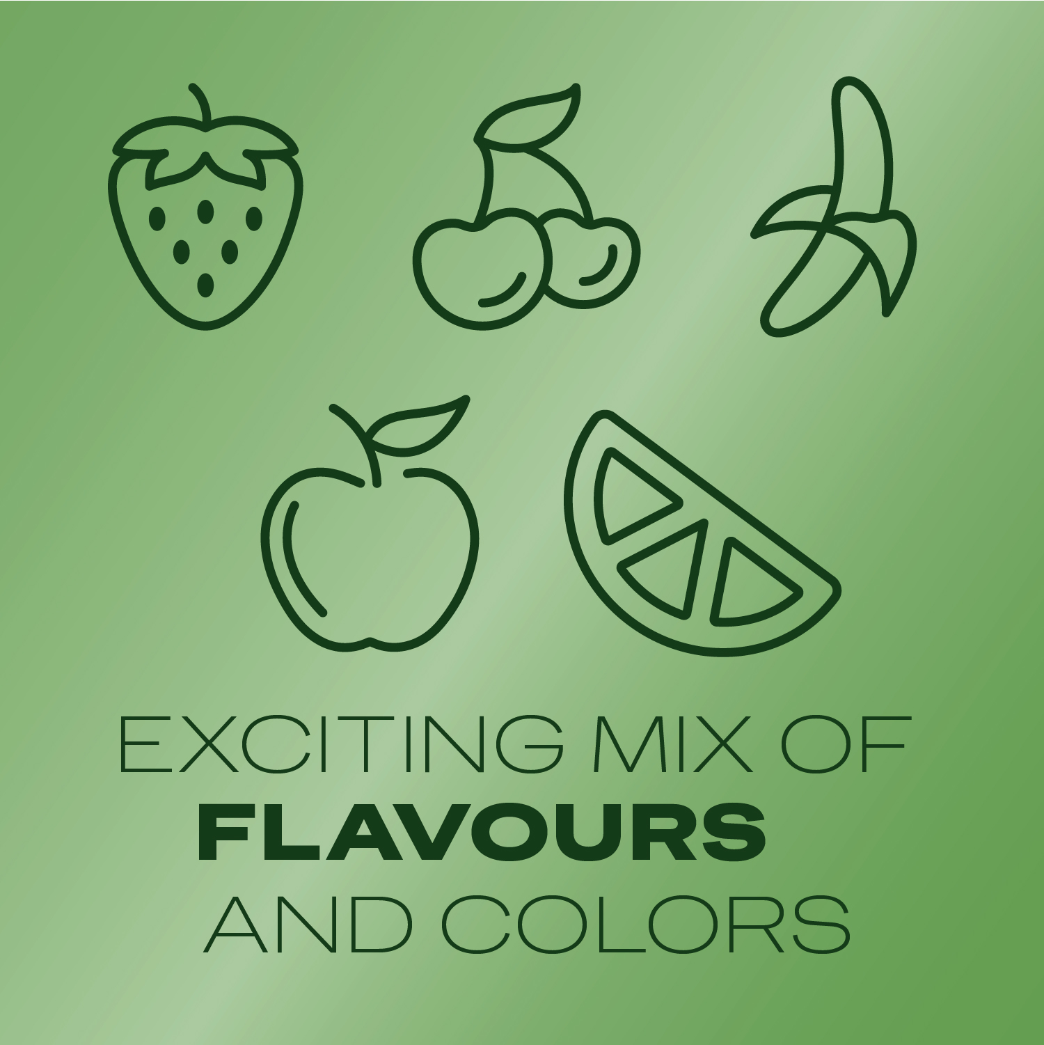 - FLAVORS: Multi-colored with several exciting flavors such as apple, orange, strawberry or banana