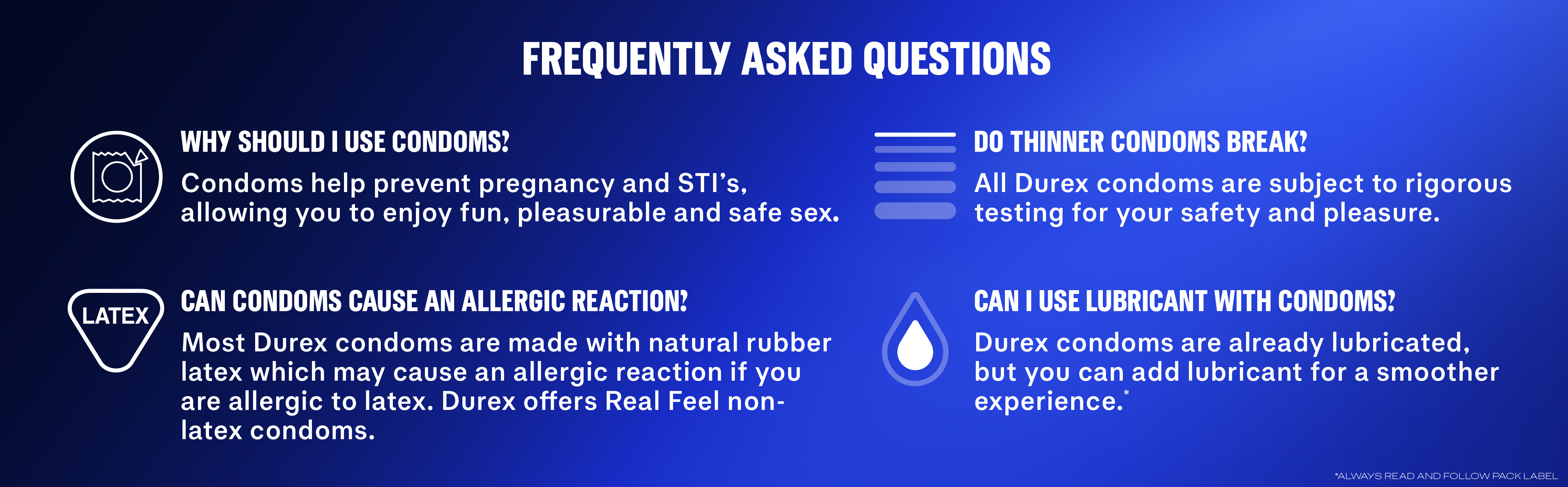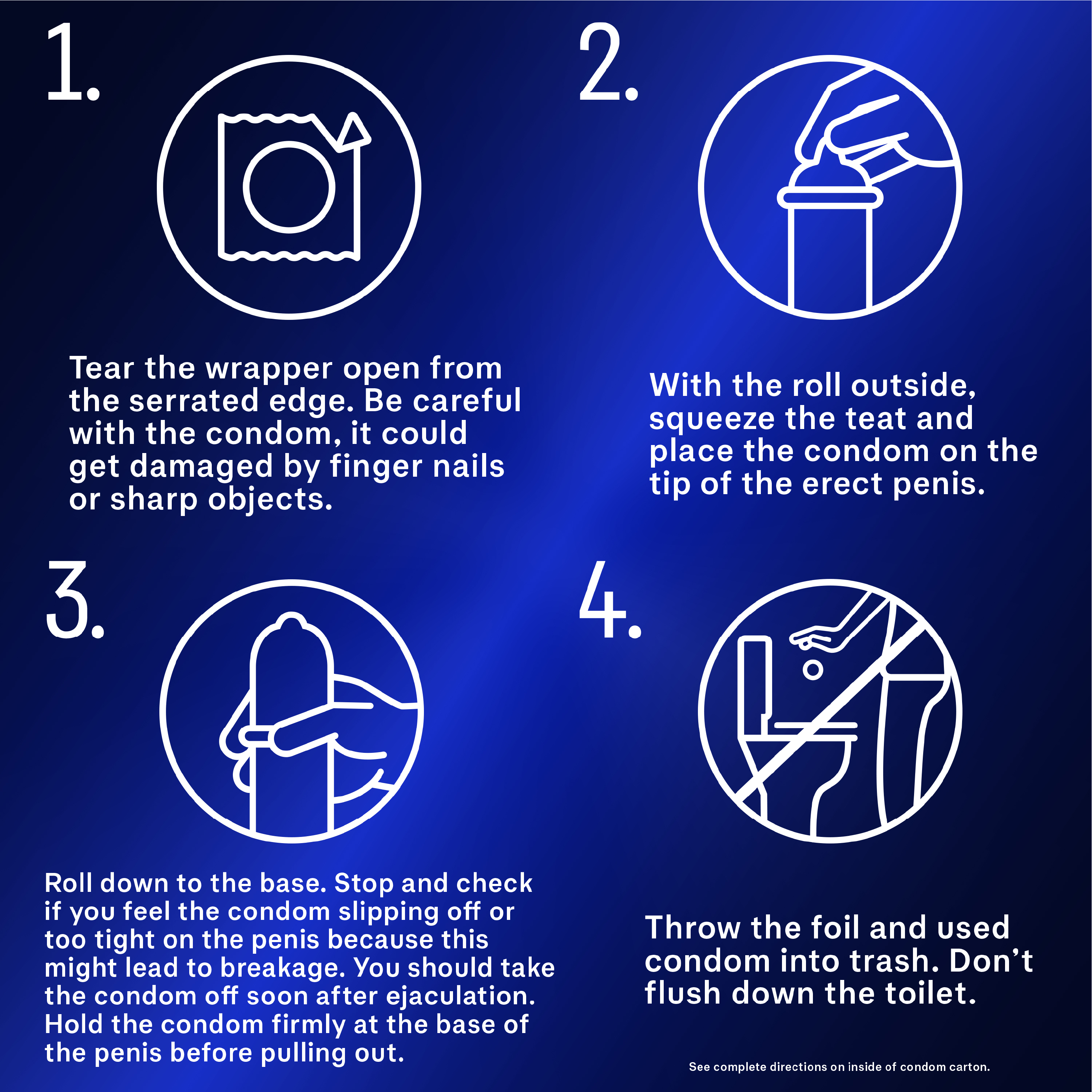 For maximum benefit, carefully follow the condom instructions on the inner side of this package. It helps provide protection against pregnancy, HIV/AIDS and other sexually transmitted infections (STIs).
