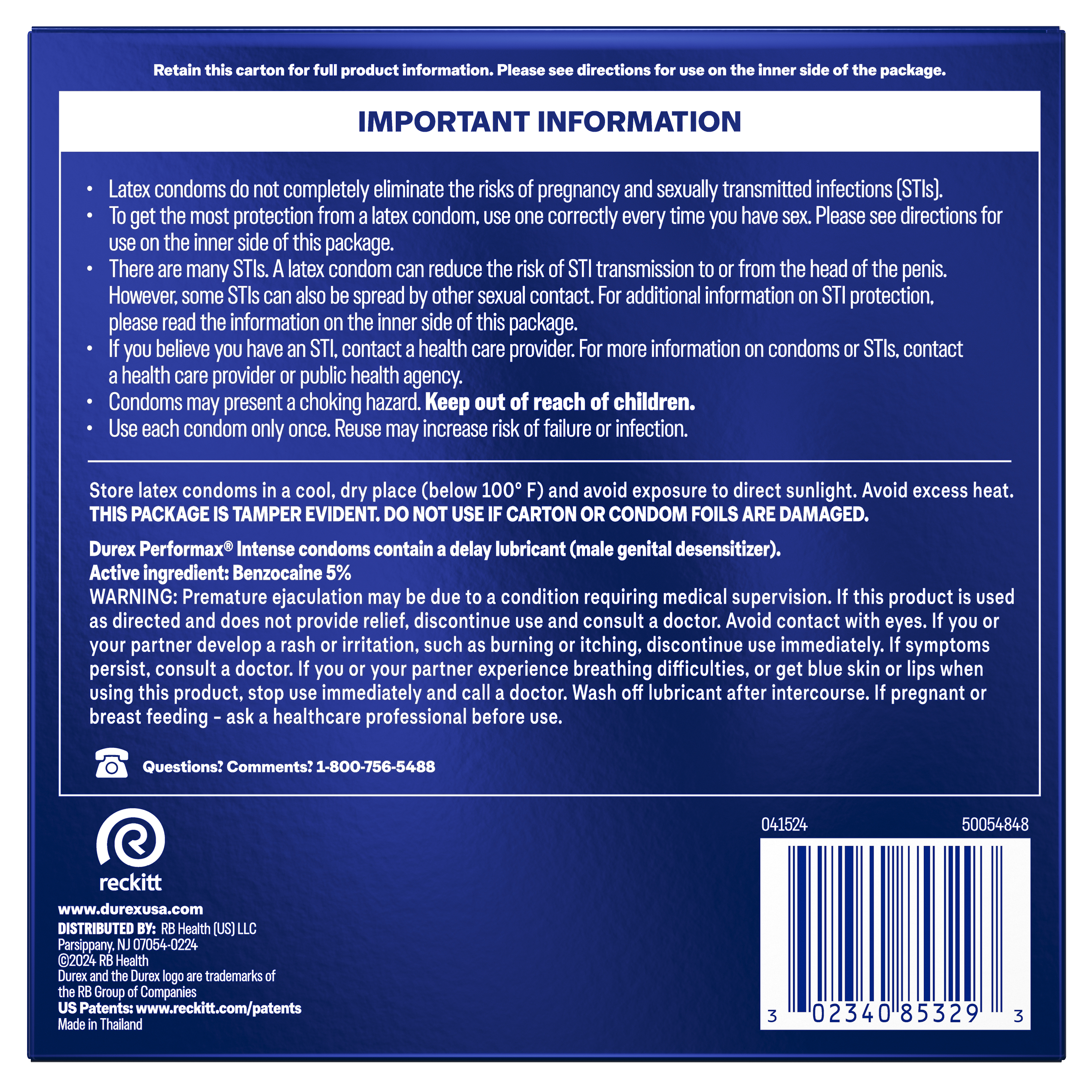 | Product Description | Durex Performax Intense Condoms are delay condoms for men are made with a desensitizing lubricant to help him last longer and are textured and designed to help speed her up. Condoms contain climax control lube on the inside made with the active ingredient: Benzocaine (5 percent) for him and have a ribbed and dotted texture designed for added sensation and are lubricated on the outside to intensify sensation for her. Regular fit condoms, our standard girth, designed for a close and comfortable fit, with a nominal width of 56mm. FSA (Flexible Spending Account) and HSA (Health Savings Account) eligible. Durex is the world's #1 condom brand* trusted over 80 years. Each Durex condom for men is 100 percent electronically tested for strength, flexibility and reliability and features a pleasant scent.