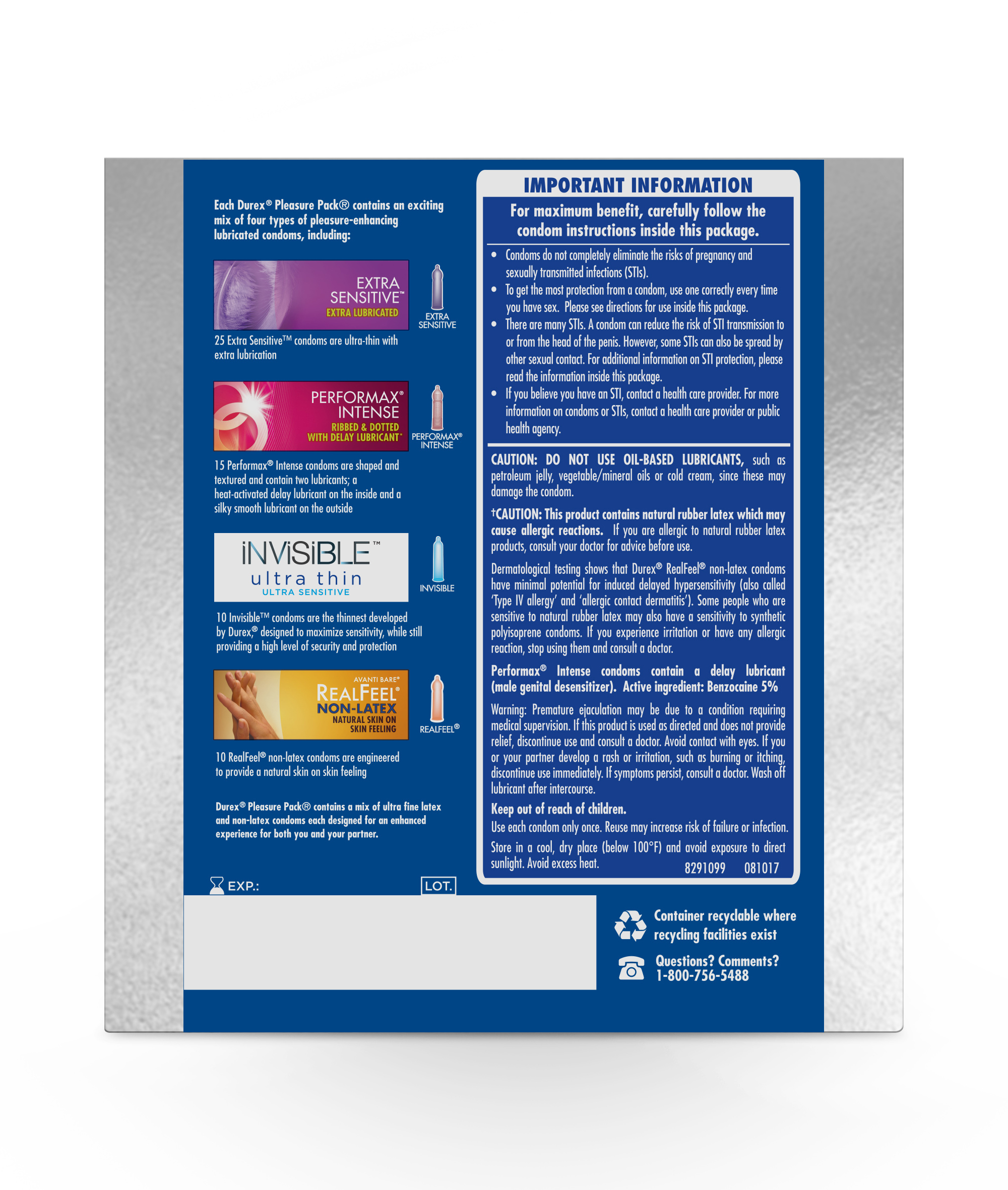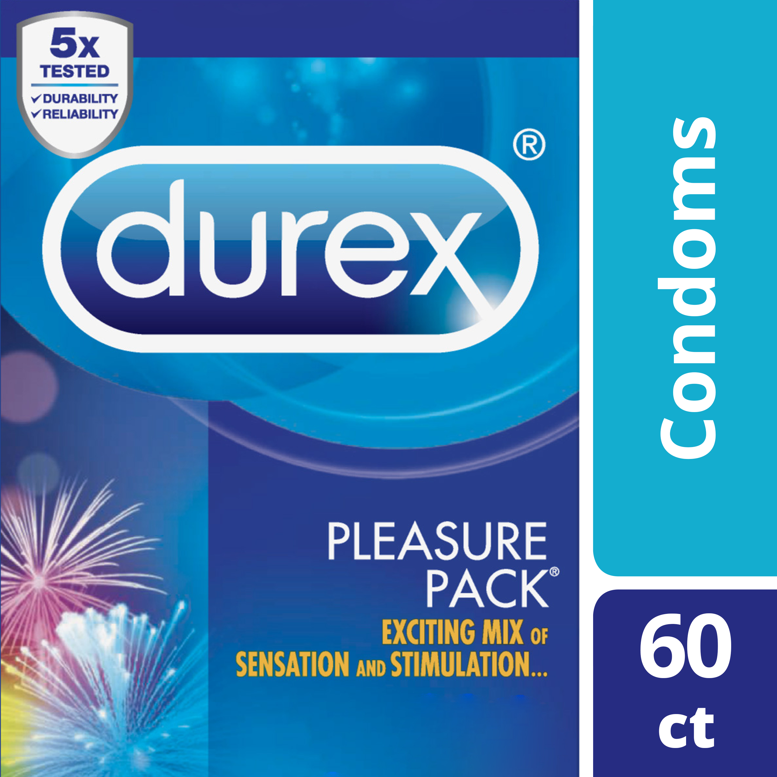 - DUREX CONDOM PLEASURE PACK: Features 4 types of assorted lubricated, natural latex male condoms including Extra Sensitive condoms, Tropical flavored condoms, Performax Intense ribbed and dotted condoms and Intense Sensation dotted condoms
