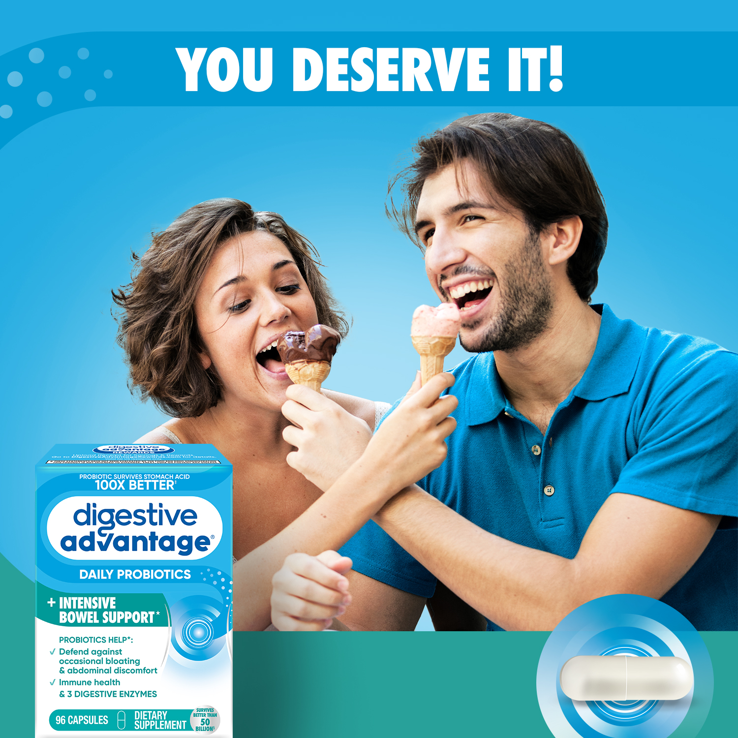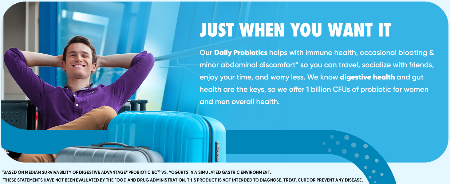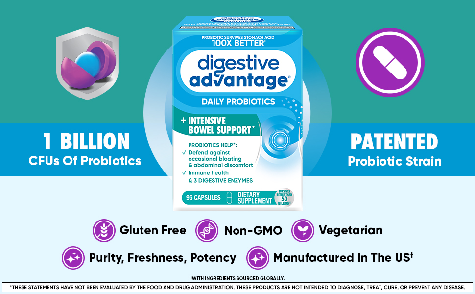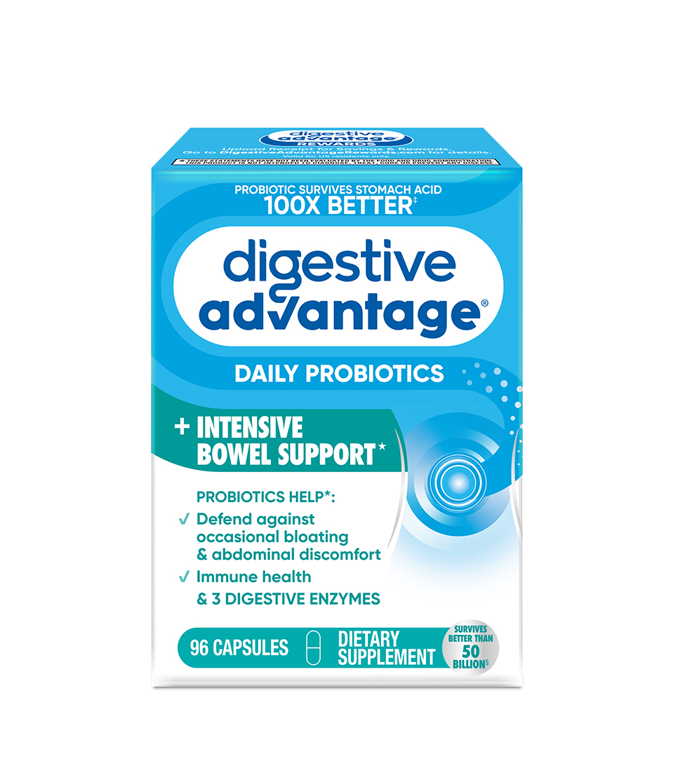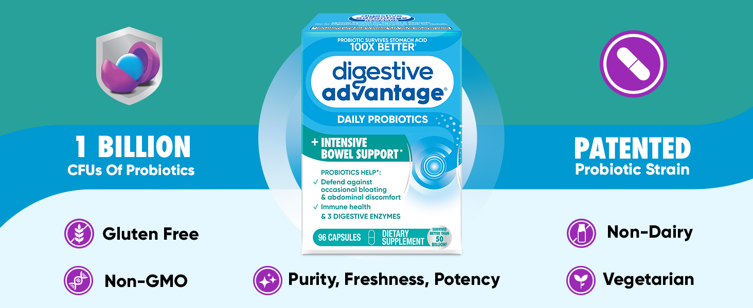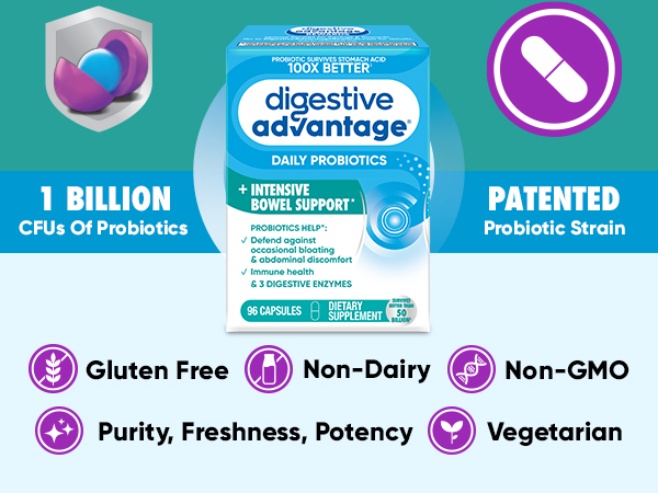 - DAILY PROBIOTICS FOR WOMEN & MEN: Digestive Advantage Daily Probiotics + Intensive Bowel Support IBS supplement with 3 Digestive Enzymes are crafted to help support your digestive health and immune health.*