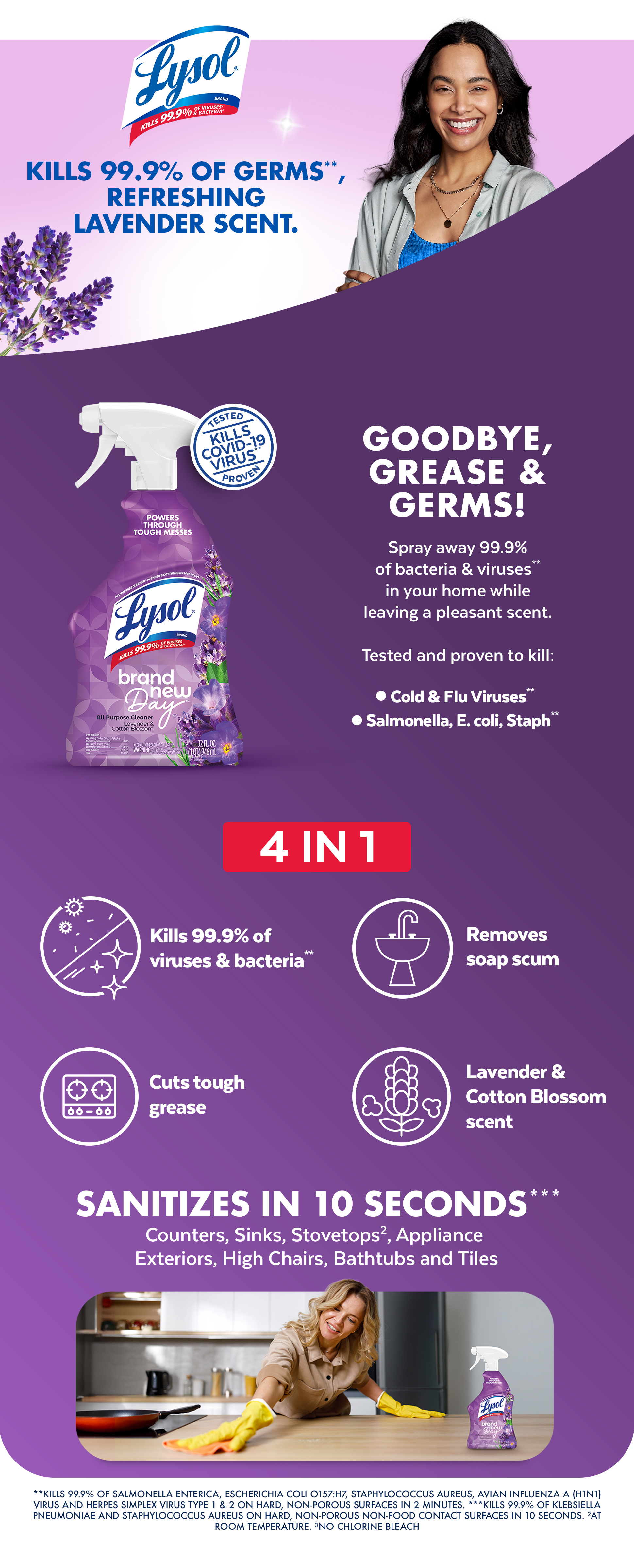 - WELCOMING FRAGRANCE: Lysol all purpose cleaner spray provides the disinfection you trust & leaves a refreshing lavender & cotton blossom scent you'll love