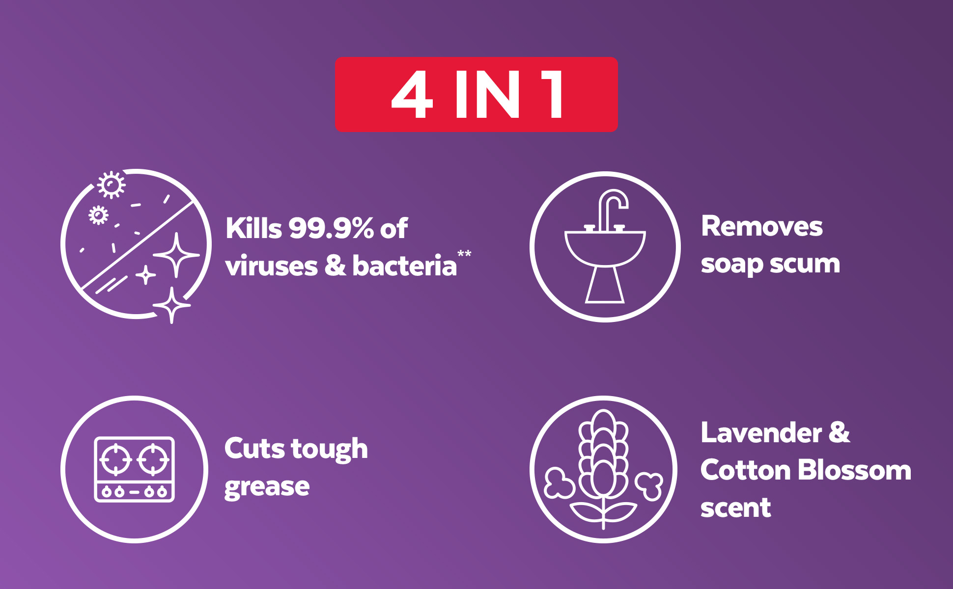 - KILLS 99.9% OF GERMS* FOR A DEEP CLEAN: This disinfectant spray kills 99.9% of germs*, removes soap scum and cuts through tough grease and grime — a versatile, multipurpose cleaner you can count on