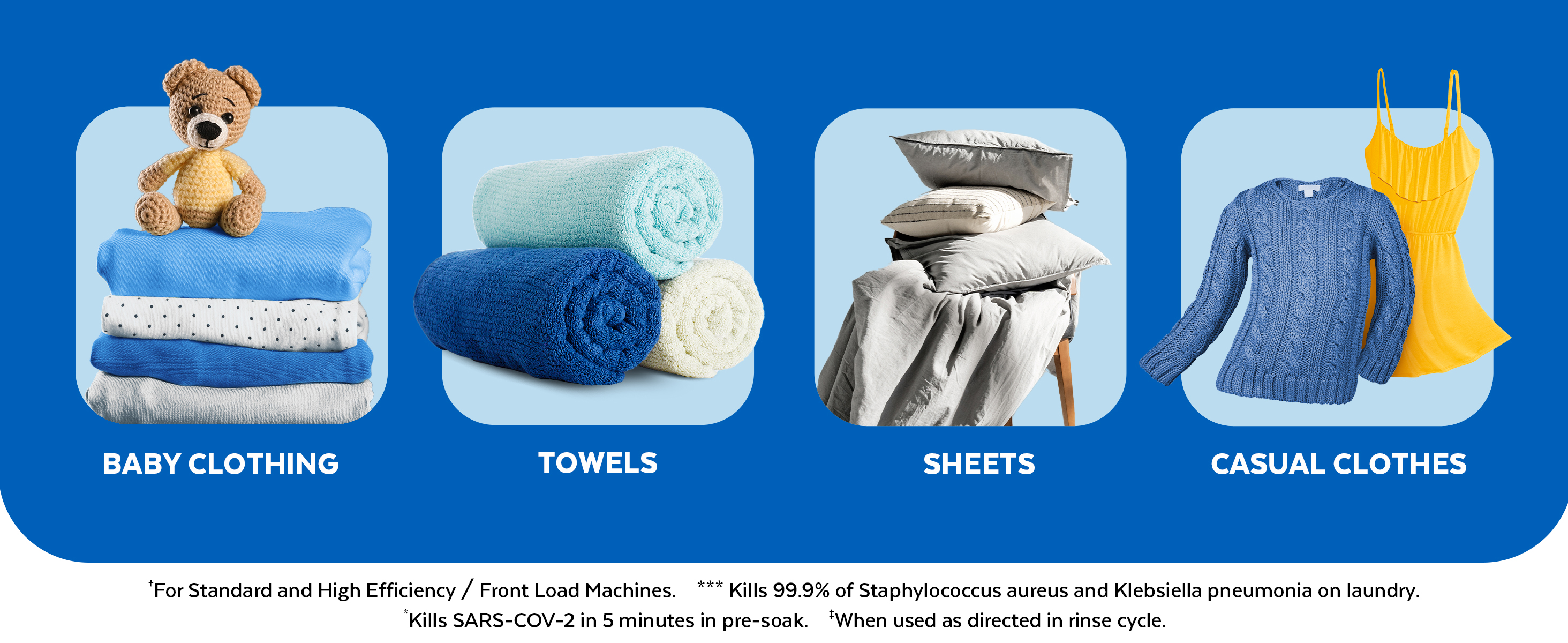 - ***Kills 99.9% of Staphylococcus aureus and Klebsiella pneumonia on laundry.