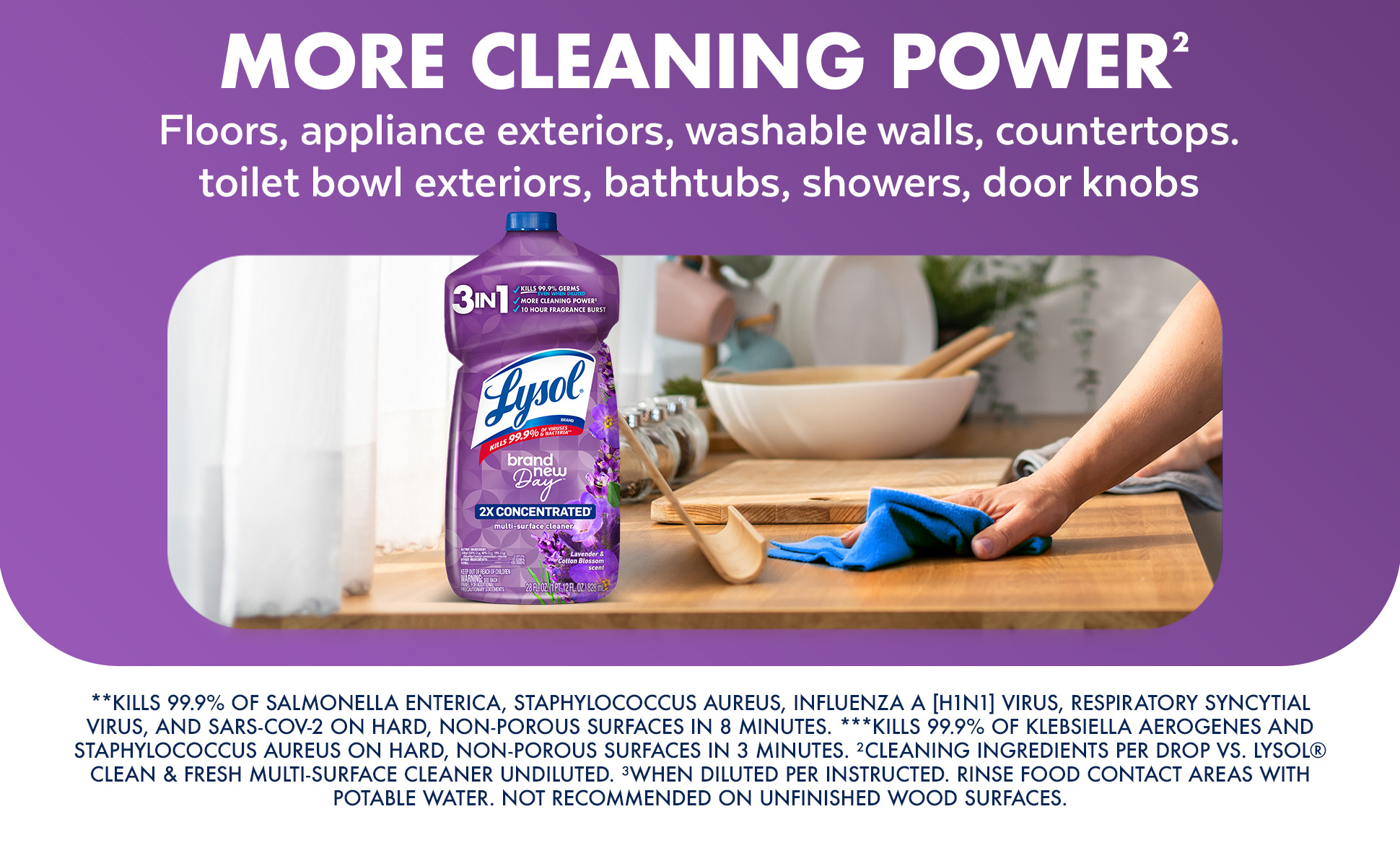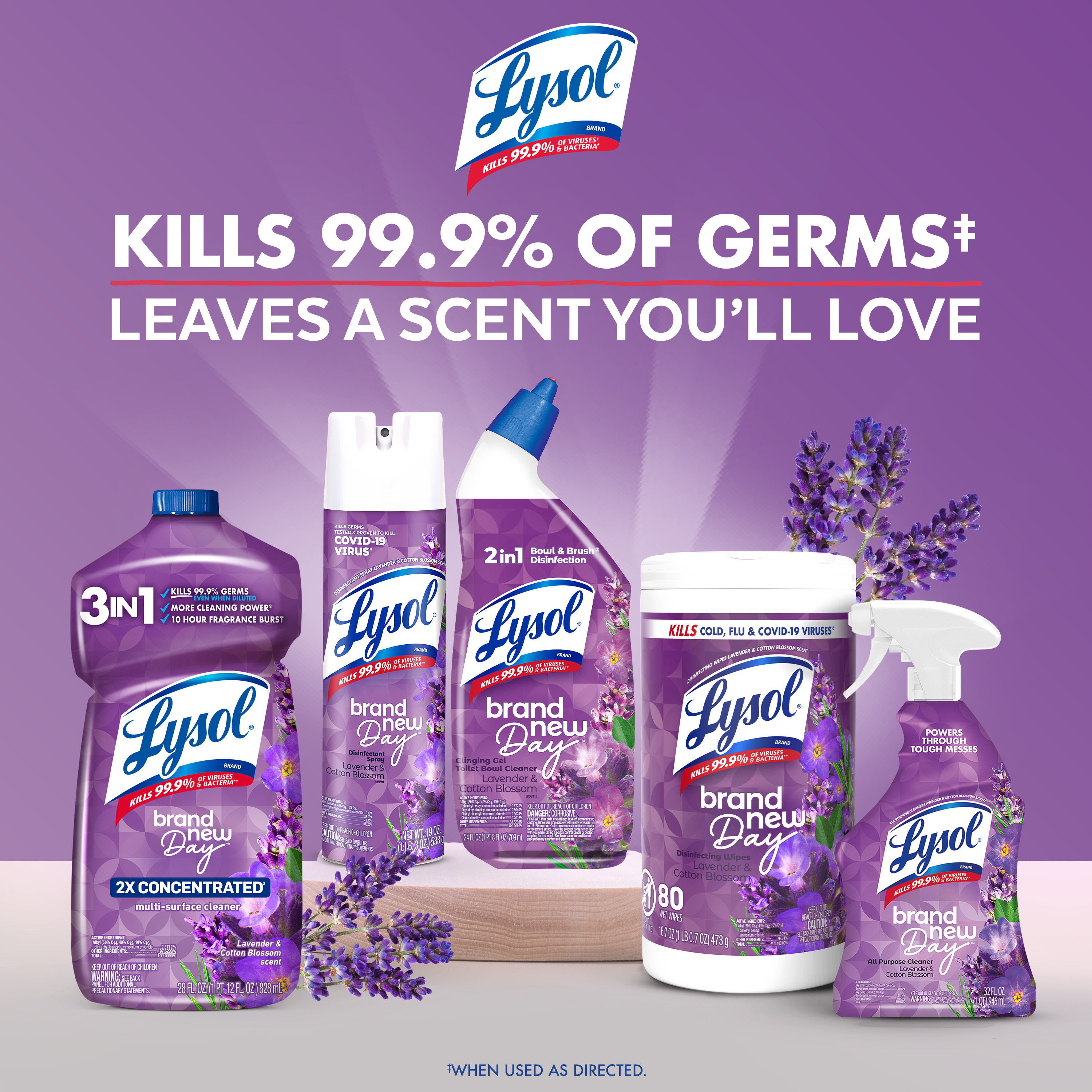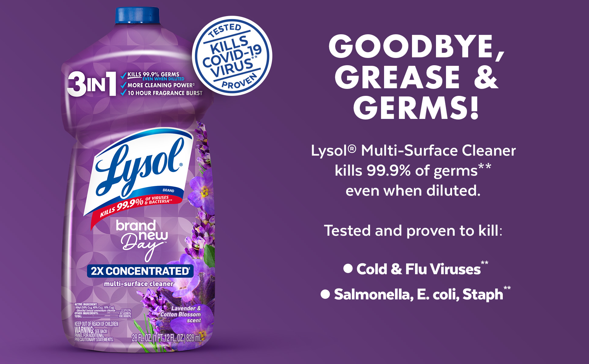 - LYSOL MULTI-SURFACE CLEANER: Lysol Brand New Day™ all purpose cleaner concentrate eliminates 99.9% of viruses and bacteria including the Covid-19 virus and RSV*
