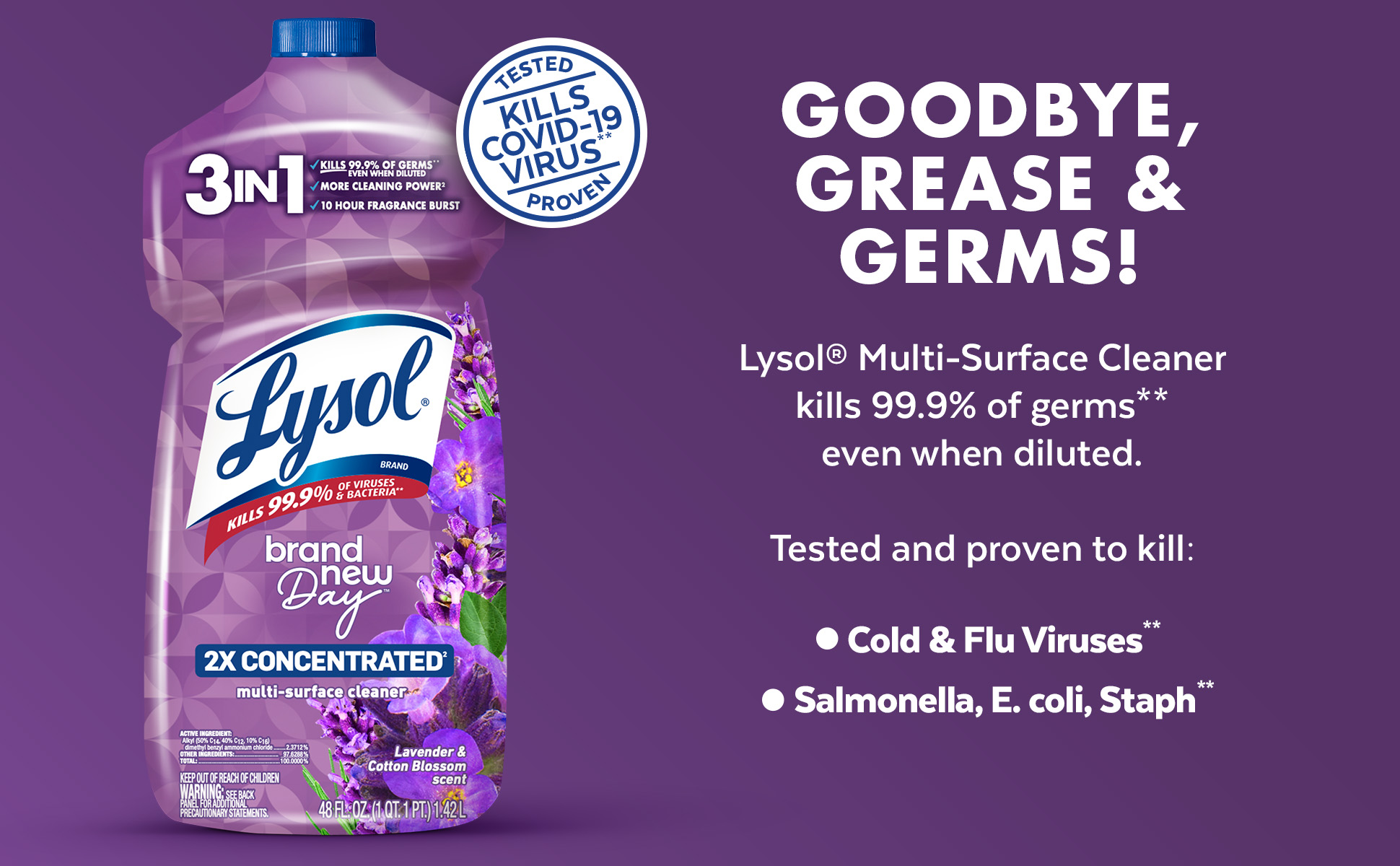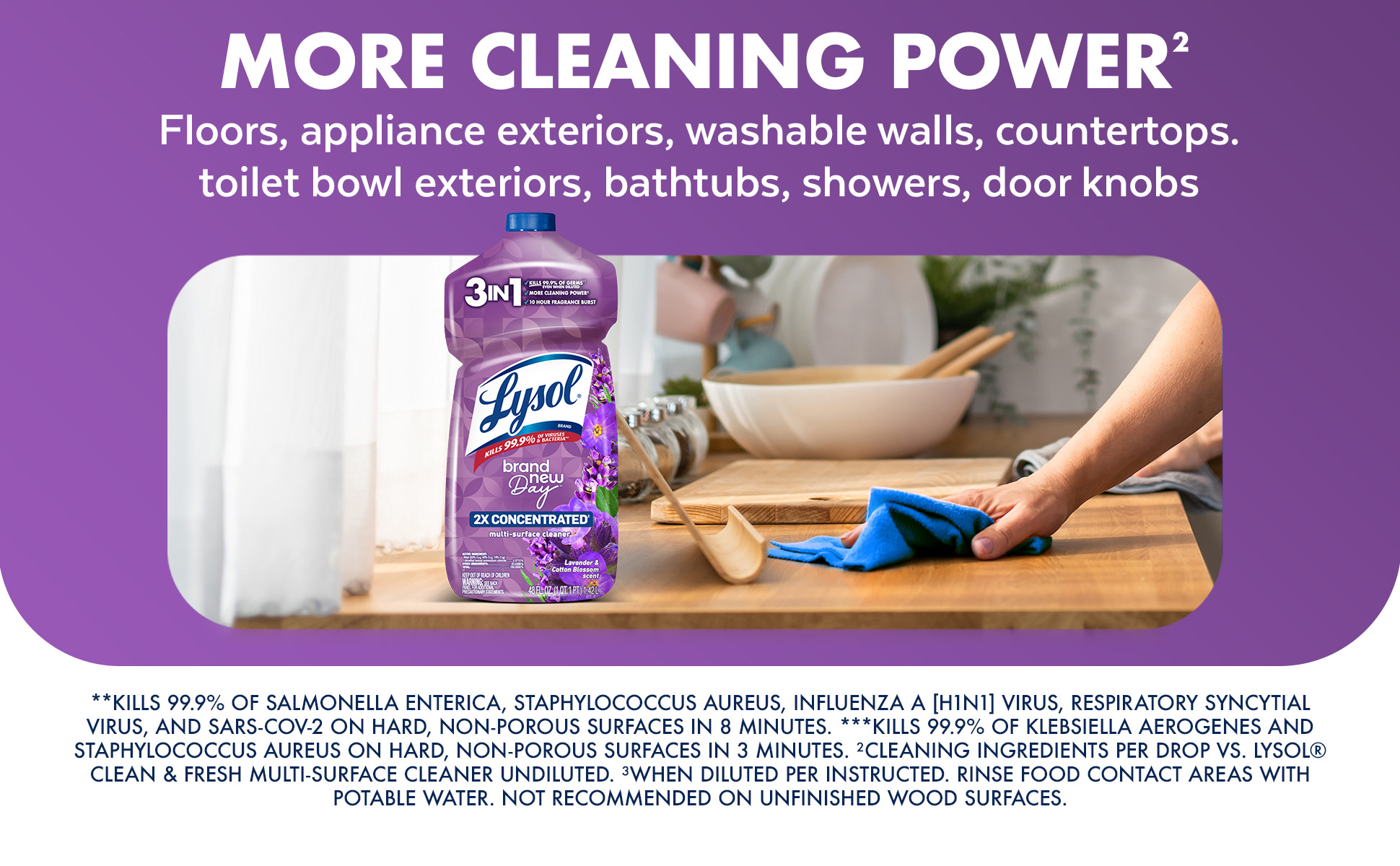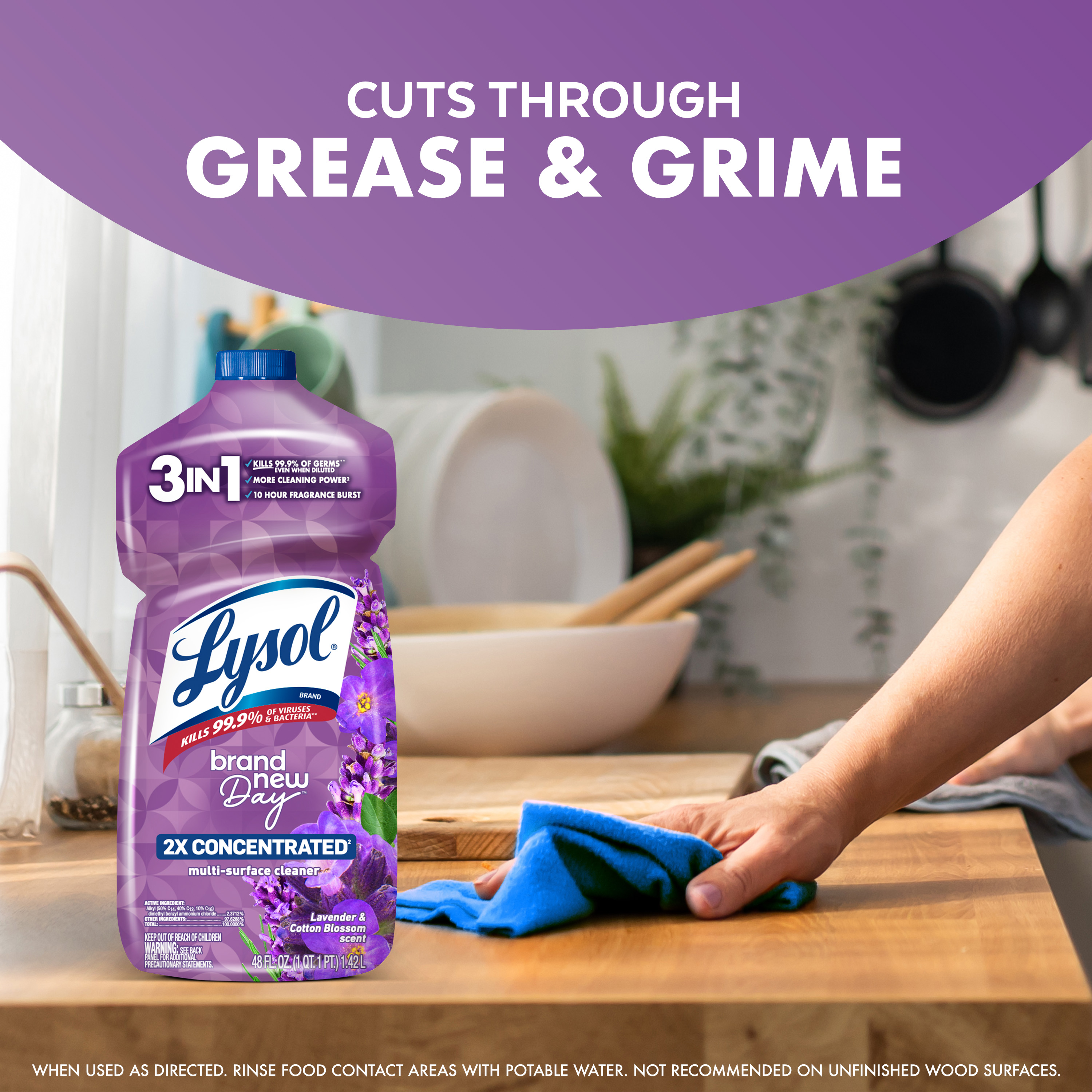 - LYSOL MULTI-SURFACE CLEANER: Lysol Brand New Day™ all purpose cleaner concentrate eliminates 99.9% of viruses and bacteria including the Covid-19 virus and RSV*