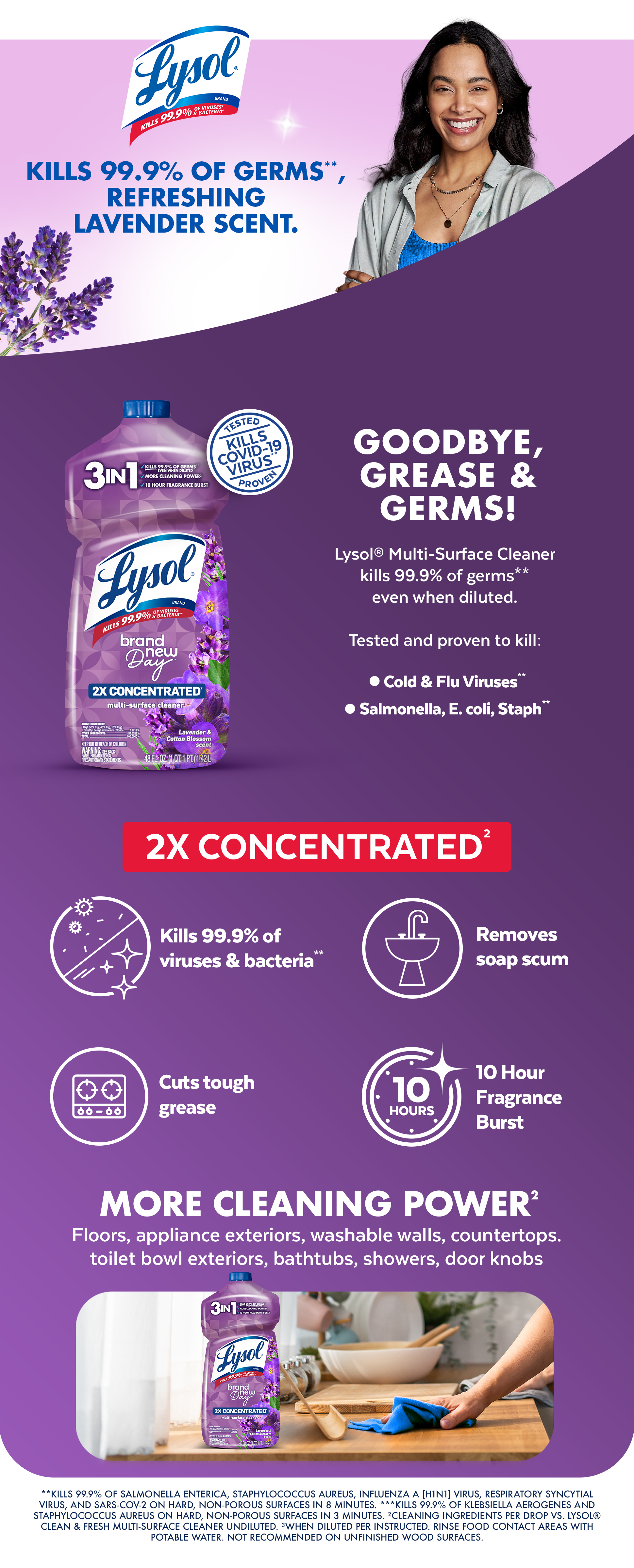 - WELCOMING FRAGRANCE: Lysol all purpose cleaner concentrate leaves a 10 hour burst of refreshing lavender & cotton blossom scent you'll love