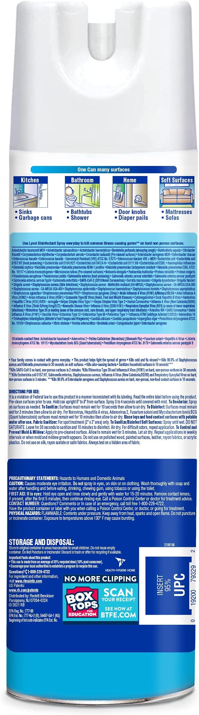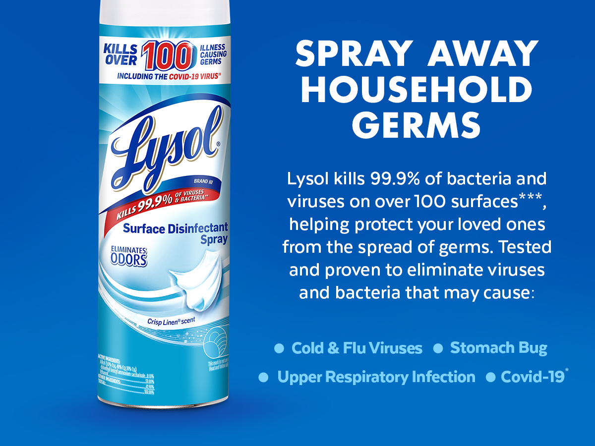 - DISINFECTANT SPRAY KILLS 99.9% OF VIRUSES AND BACTERIA: Lysol Disinfectant Spray is tested and proven to kill 99.9% of viruses and bacteria, including COVID-19/Coronavirus (when used as directed); EPA Reg No.777-99.