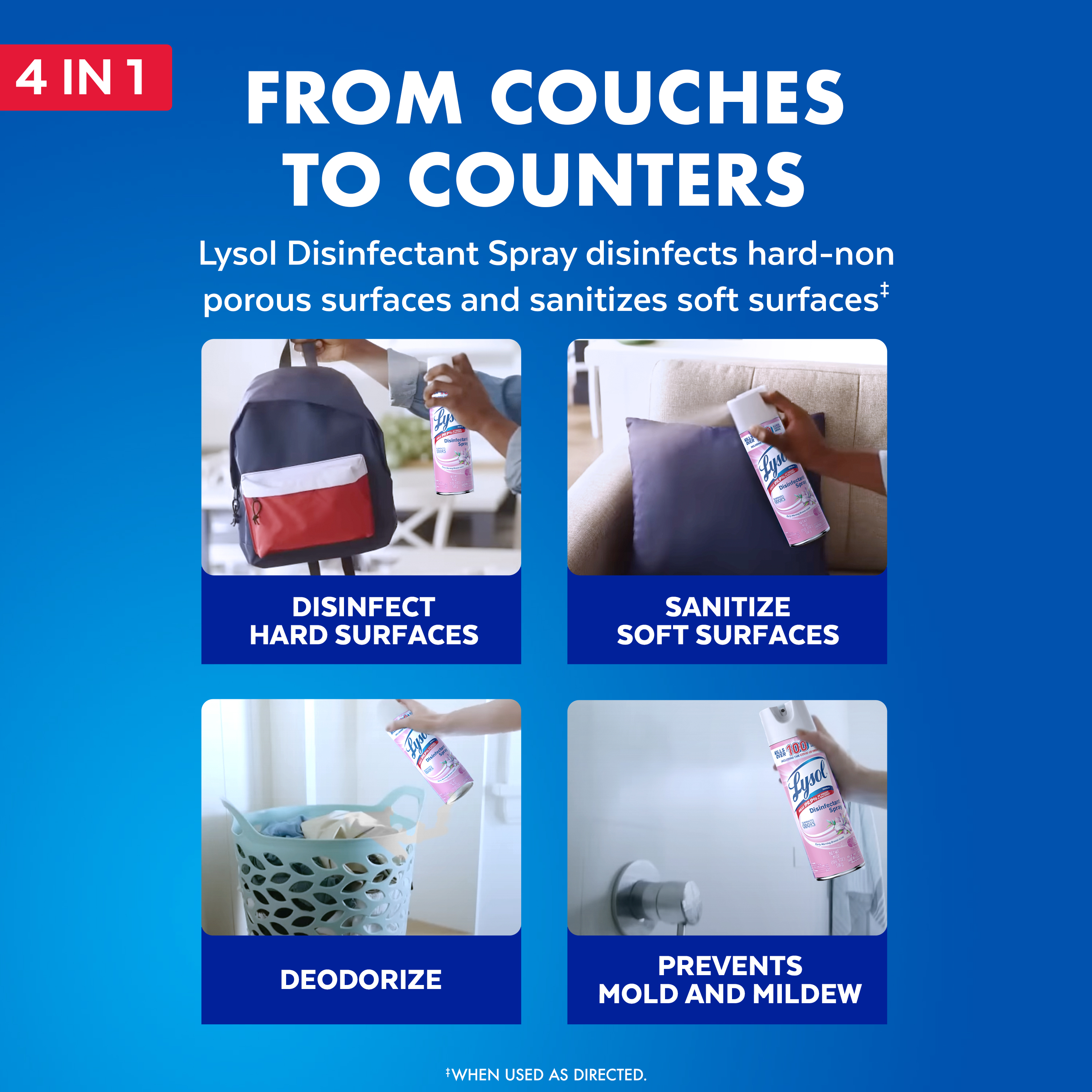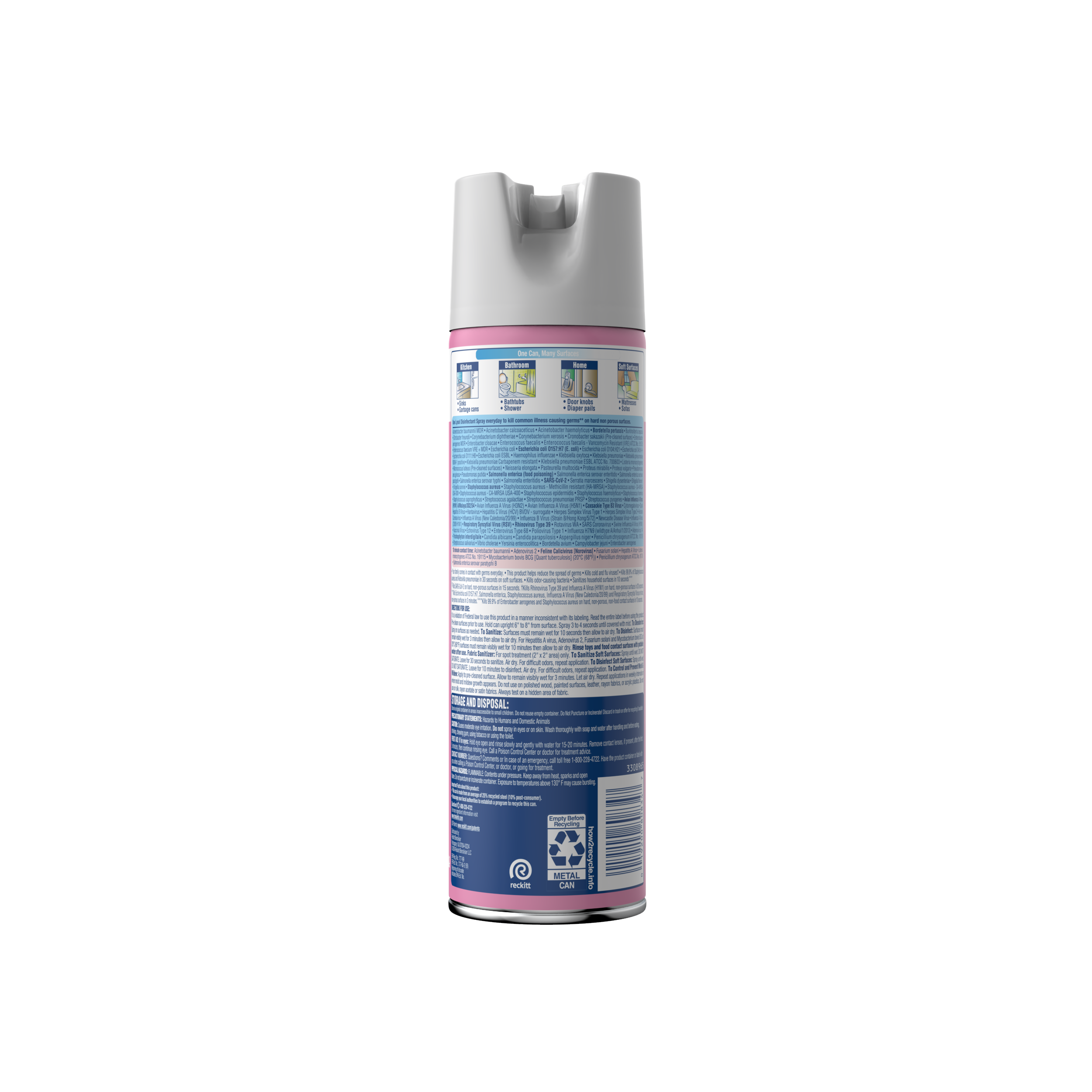 - DISINFECTING AND SANITIZING SPRAY: Lysol disinfects hard non-porous contact surfaces and sanitizes soft surfaces. This multi-purpose spray can be used in the home and kitchen, to disinfect kids' toys, couches, counters, bathrooms, and over 100 more surfaces.