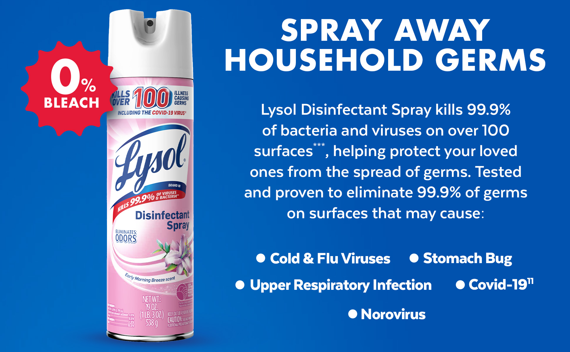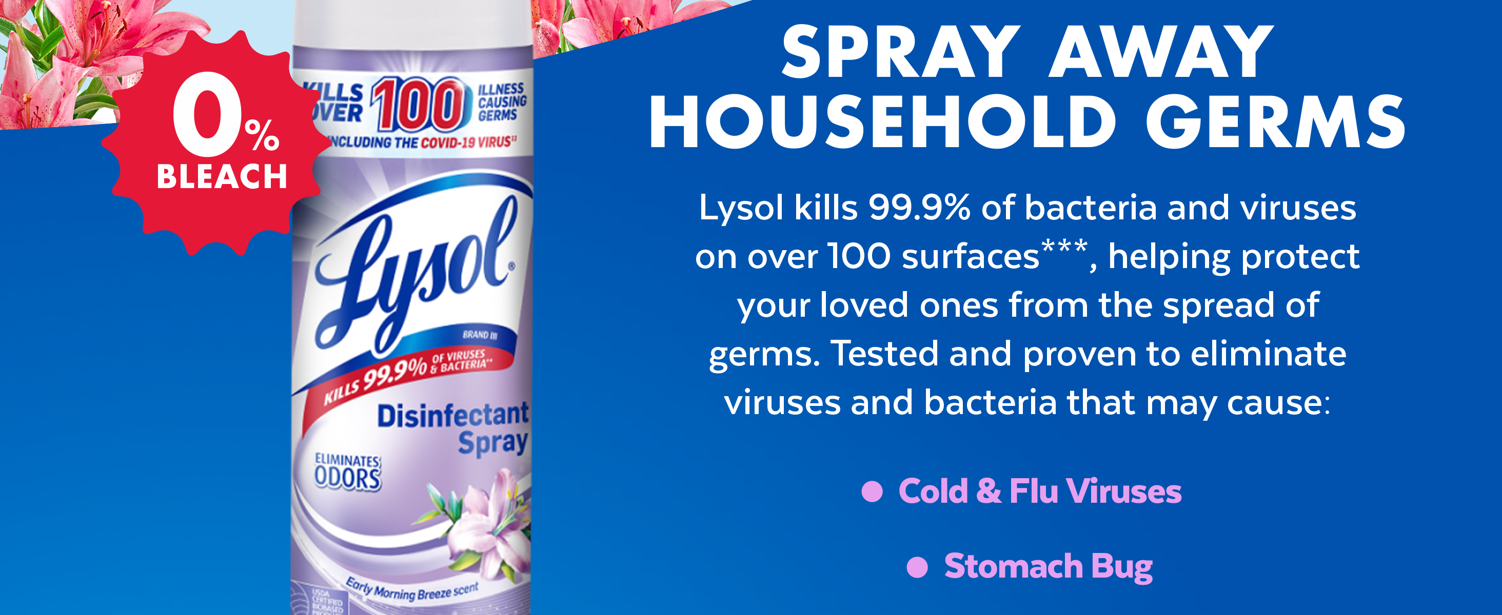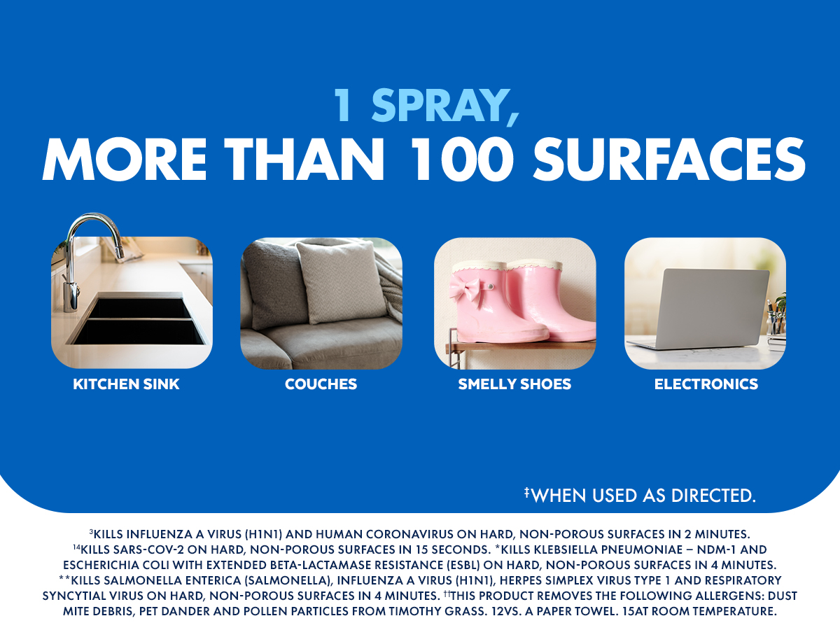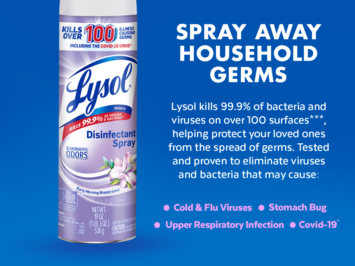 - LYSOL DISINFECTANT SPRAY: This household essential is tested and proven to kill 99.9% of viruses and bacteria, including the Covid-19 virus and cold and flu. Perfect for any room, this Lysol spray will sanitize, disinfect, and deodorize your home.
