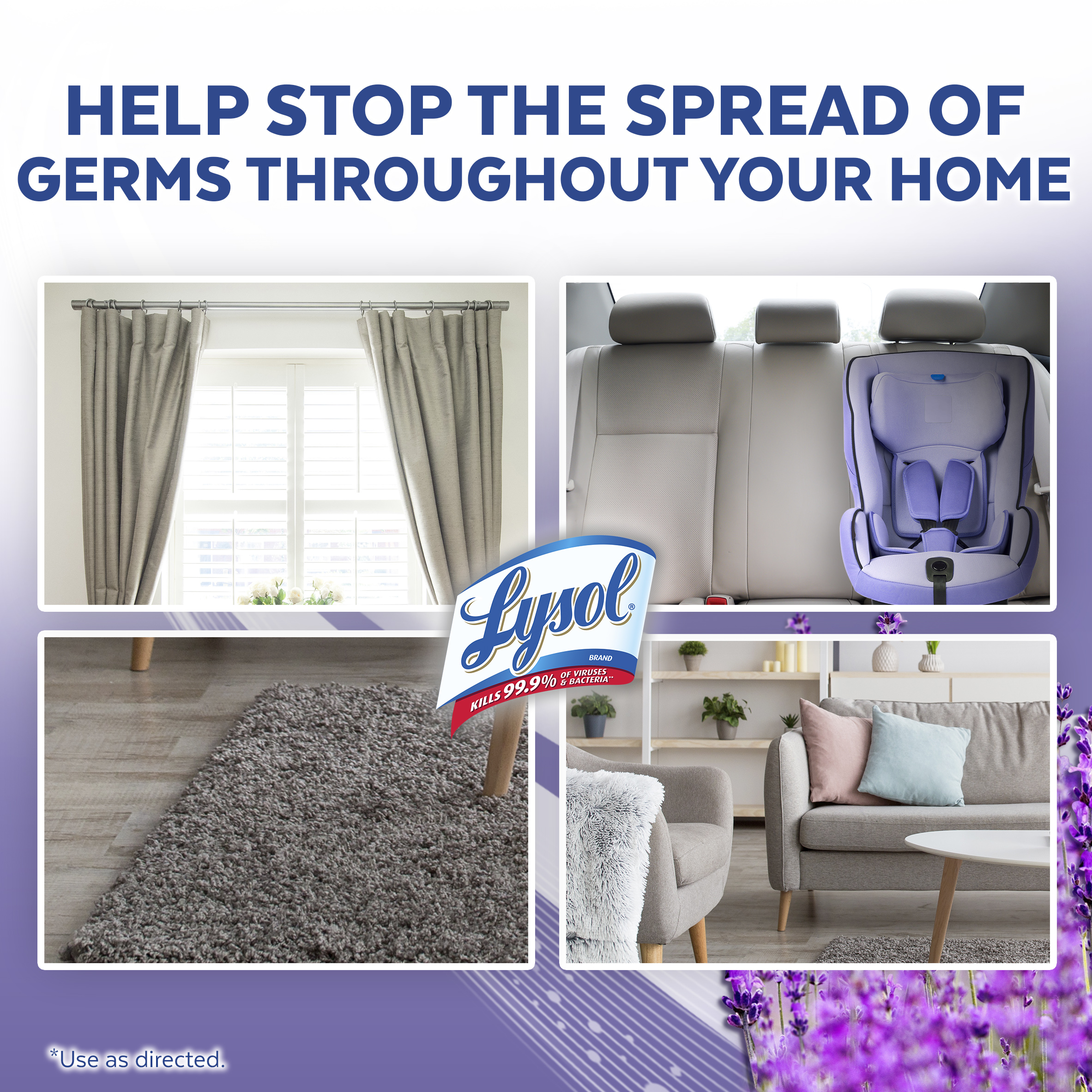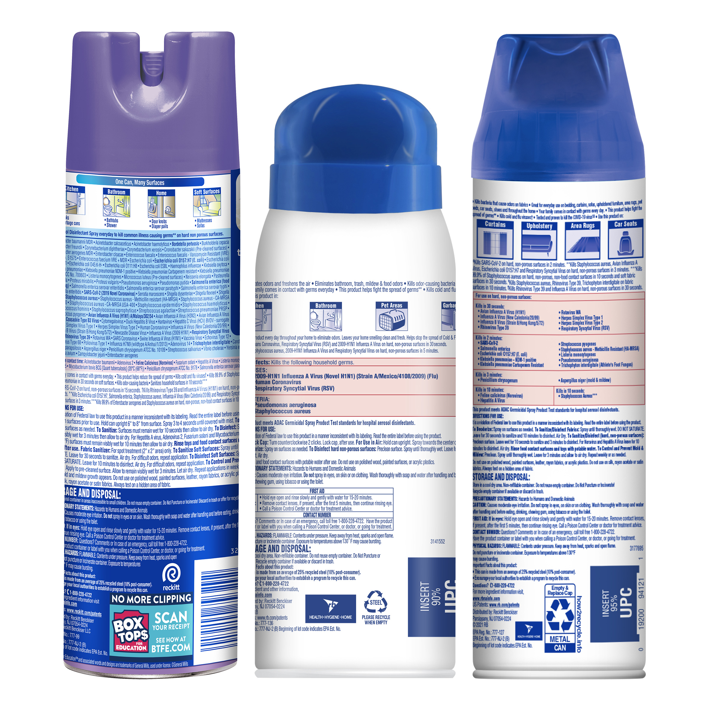 | Product Description | Lysol Disinfecting Spray: Lysol Disinfecting Spray helps protect your family and helps keep them healthy. Our products are designed to provide germ protection and can kill 99.9% of viruses and bacteria on hard surfaces, when used as directed. From counters to couches, you can depend on Lysol to kill 99.9 percent of bacteria. This spray eliminates odors and kills 99.9 percent of mildew, mold, viruses on most household surfaces. Sanitizes soft surfaces and deodorizes the air. EPA #777-99. Lysol Neutraair 2 in 1 Spray: The new Lysol Disinfectant Spray 2 in 1 combines effective germ-killing and odor elimination. Our products are designed to provide germ protection and can kill 99.9% of viruses and bacteria on hard surfaces, when used as directed. From counters to couches, you can depend on Lysol to kill 99.9 percent of bacteria. This spray eliminates odors and prevents mildew, mold, viruses on most household surfaces. Disinfects hard surfaces and deodorizes the air. EPA#777-136. Lysol Fabric Disinfectant Spray: Bacteria are hanging out on your homes' big soft surfaces. Kill 99.9% of them with the New Lysol Fabric Disinfectant Spray. Its unique cap with 2X Wider coverage (vs. Regular Disinfectant Spray) completely and evenly covers large areas without over wetting, making it ideal for Soft Surfaces like your mattress, sofa, pet beds etc. With Malodor counteracting technology, it neutralizes odors to leave behind a surprisingly light, fresh scent. EPA #777-127. |