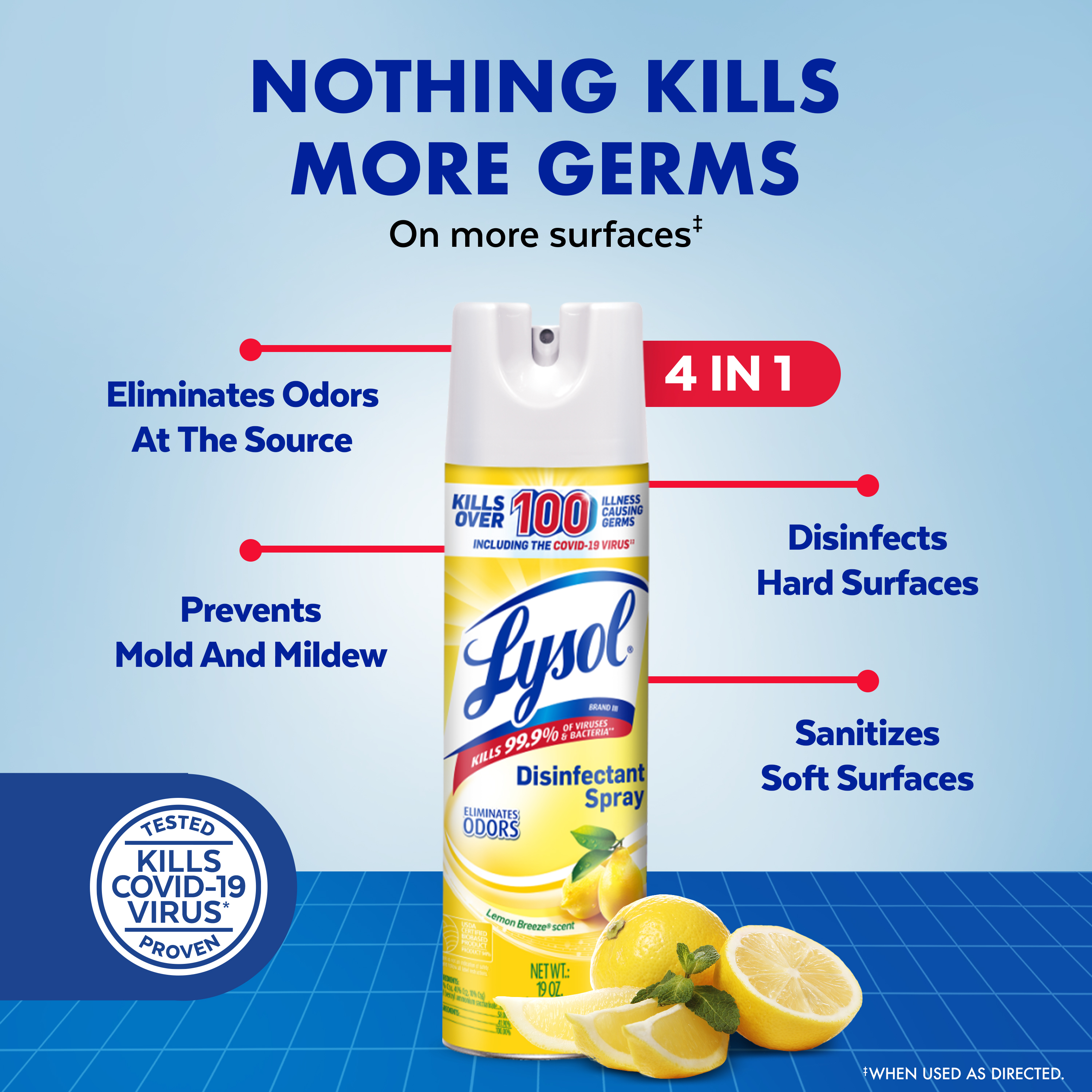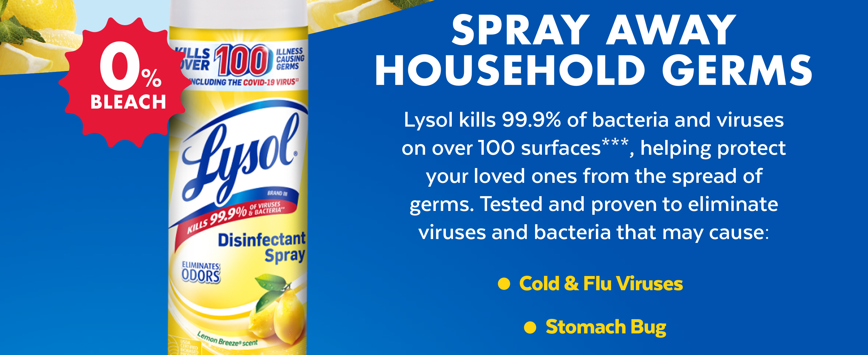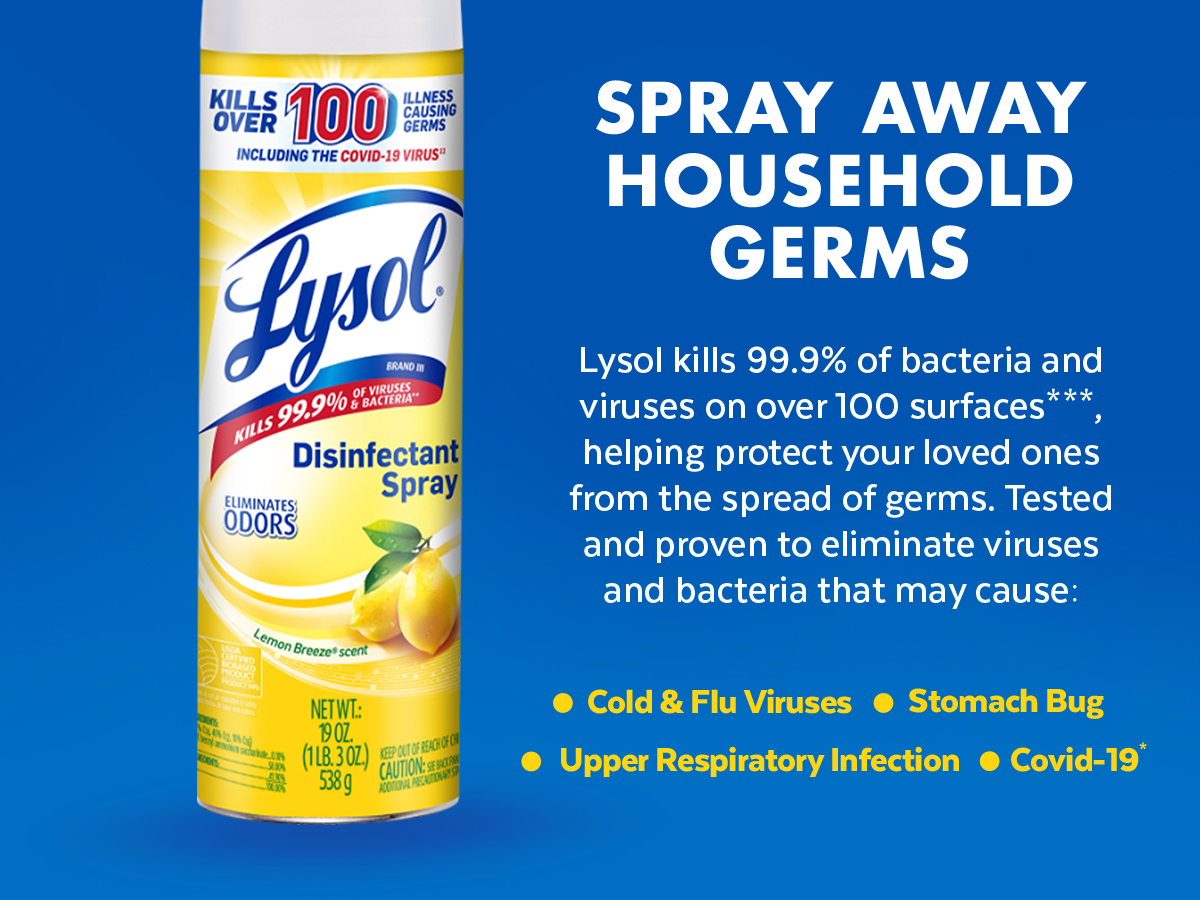 - LYSOL DISINFECTANT SPRAY: This household essential is tested and proven to kill 99.9% of viruses and bacteria, including the Covid-19 virus and cold and flu. Perfect for any room, this Lysol spray will sanitize, disinfect, and deodorize your home.