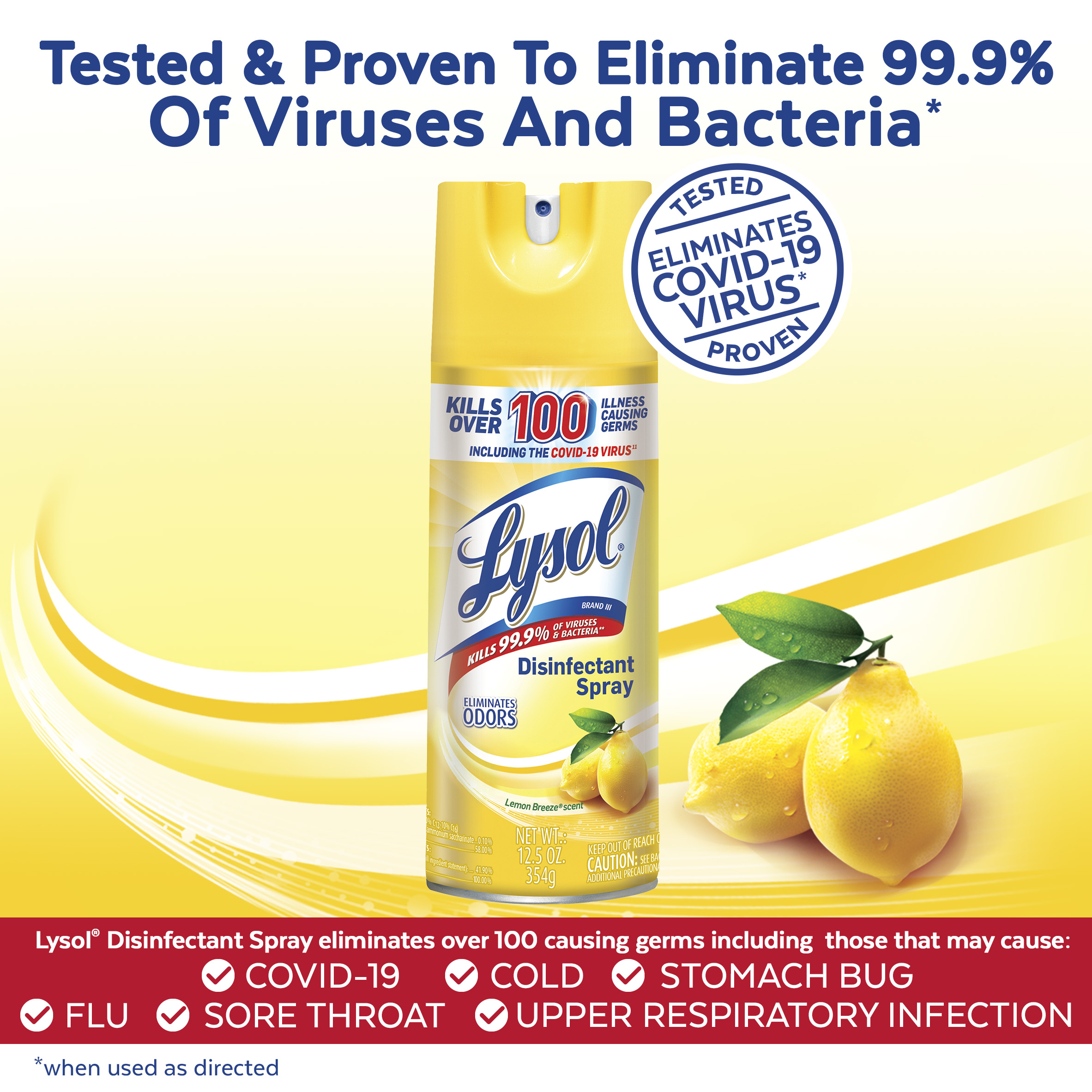 - DISINFECTANT SPRAY KILLS 99.9% OF VIRUSES AND BACTERIA: Lysol Disinfectant Spray is tested and proven to kill 99.9% of viruses and bacteria, including COVID-19/Coronavirus* (when used as directed); EPA Reg #777-99.