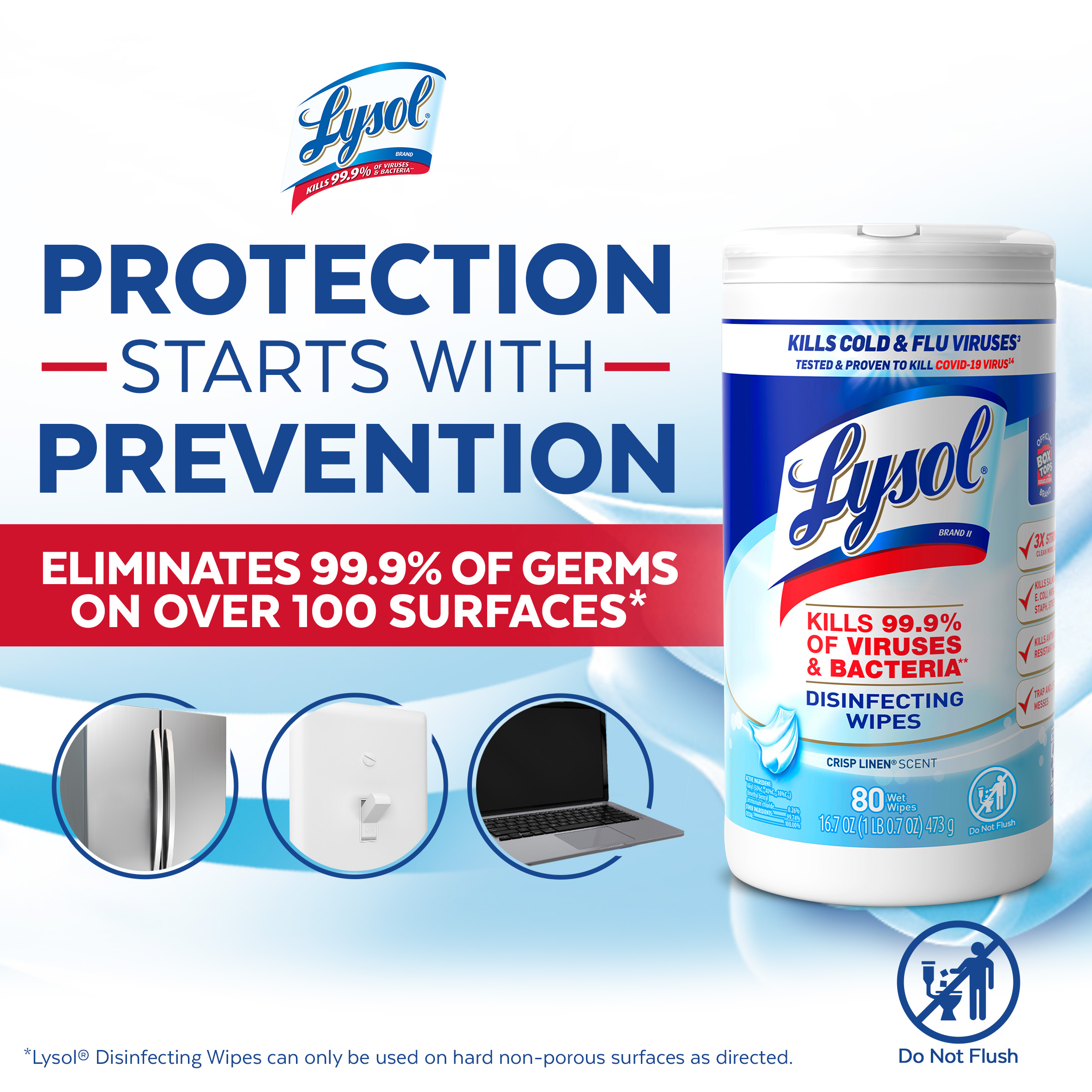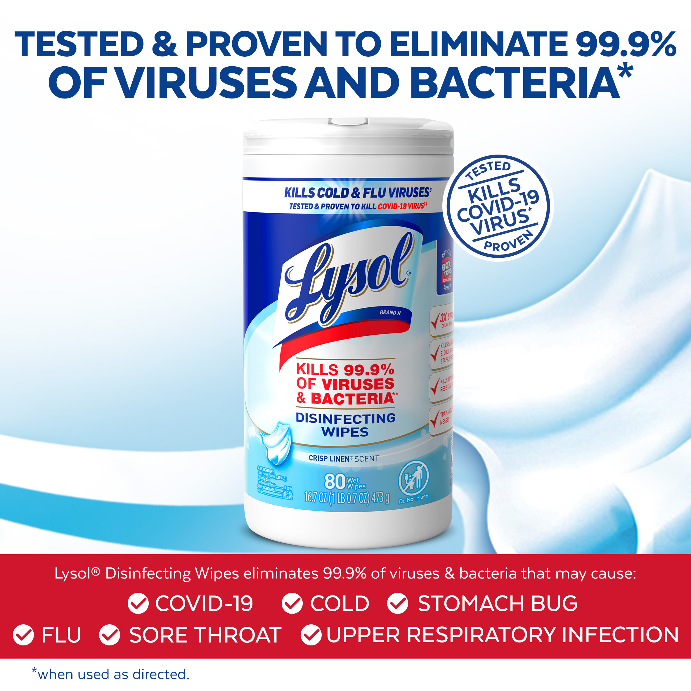 - DISINFECTING WIPES KILLS 99.9% OF VIRUSES AND BACTERIA: Lysol Disinfecting Wipes are tested and proven to clean and kill 99.9% of viruses and bacteria, including 8 cold and flu viruses* (when used as directed).