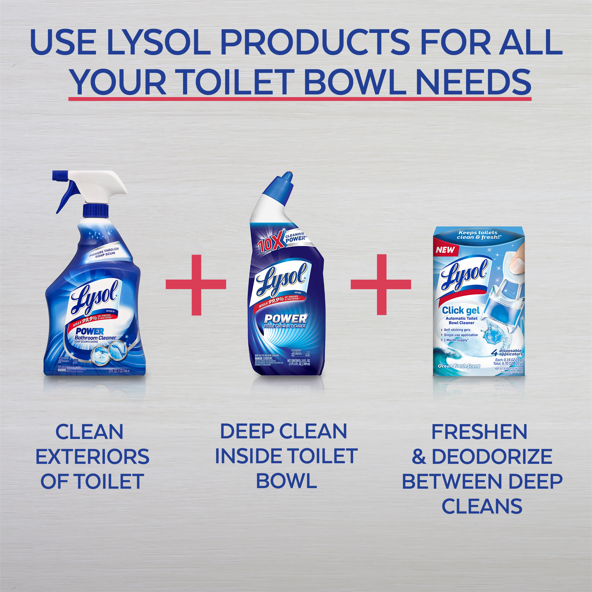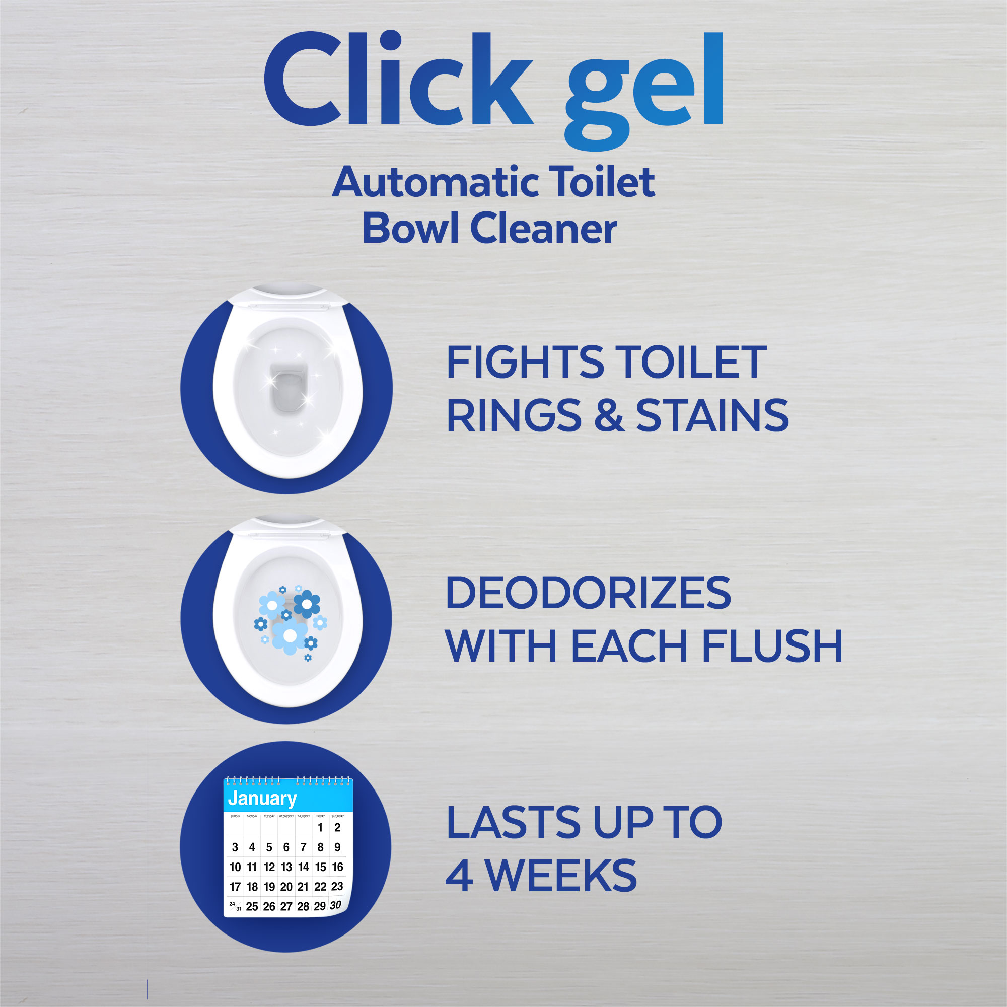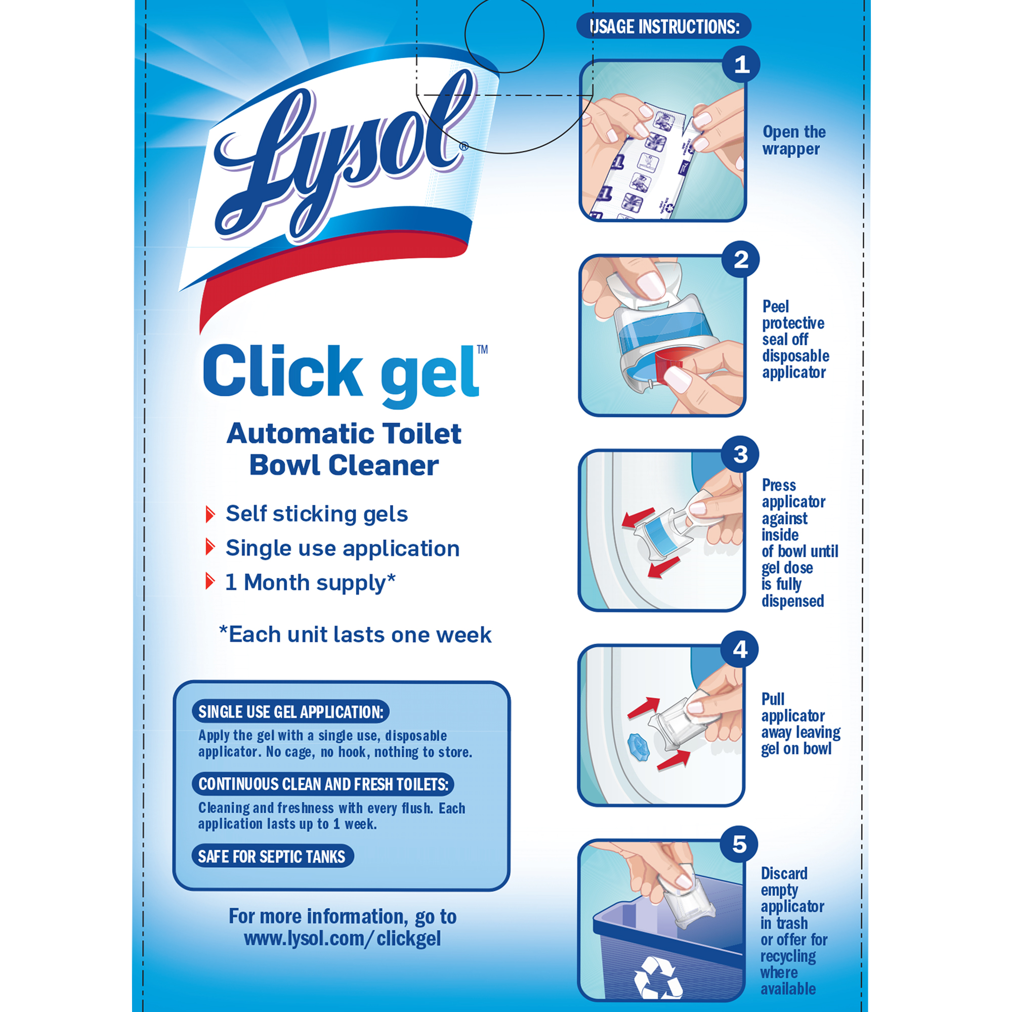 Keeping your toilet clean and fresh has never been easier. Simply press the Lysol Click Gel applicator against the inside of your toilet bowl until it clicks, and let Lysol do the cleaning for you. With every flush, this product delivers continuous clean and freshness for up to 1 week.
