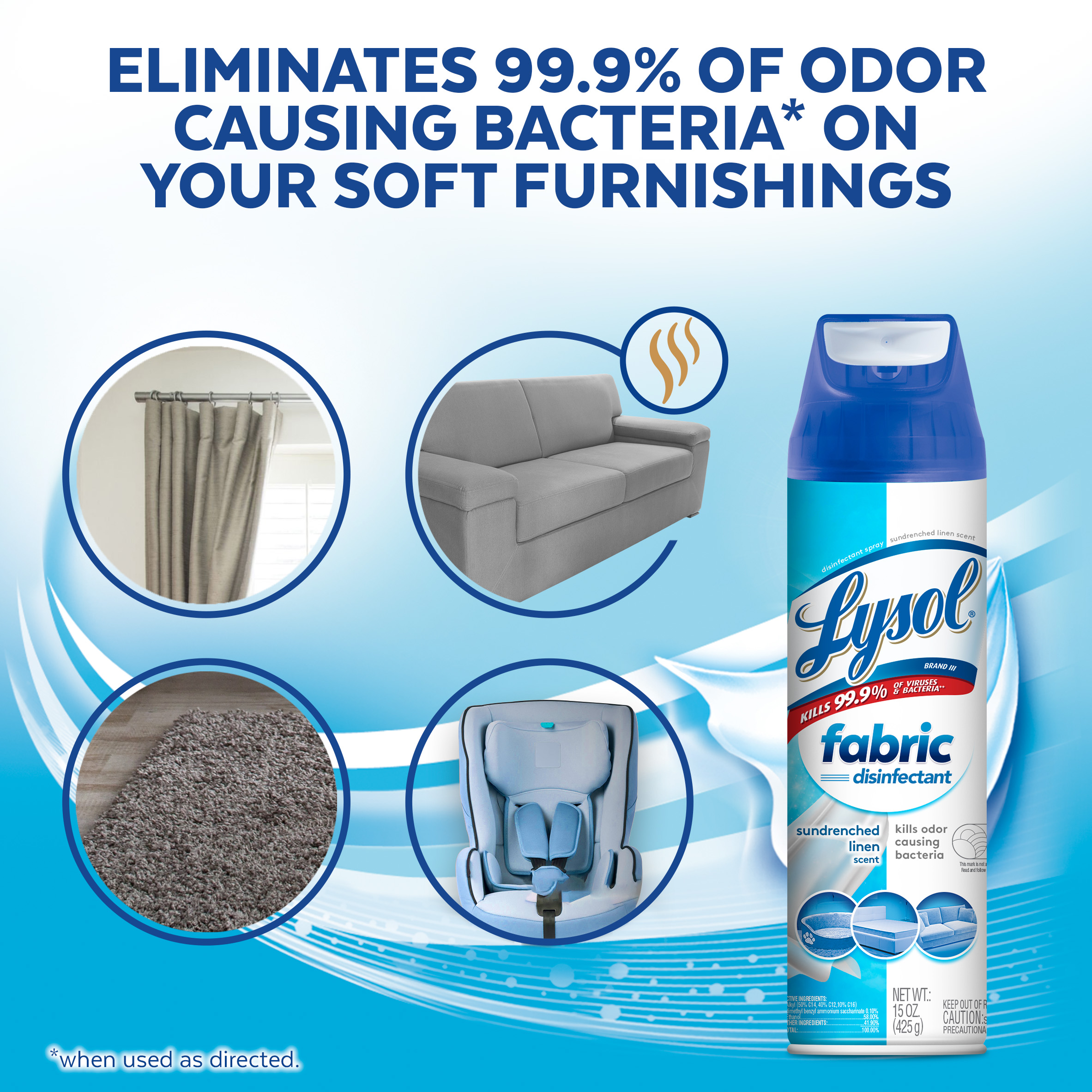 - ELIMINATES 99.9% OF ODOR CAUSING BACTERIA: This Lysol Fabric Disinfectant Spray eliminates odor causing bacteria from your soft furnishings, leaving nothing behind but a fresh linen scent.