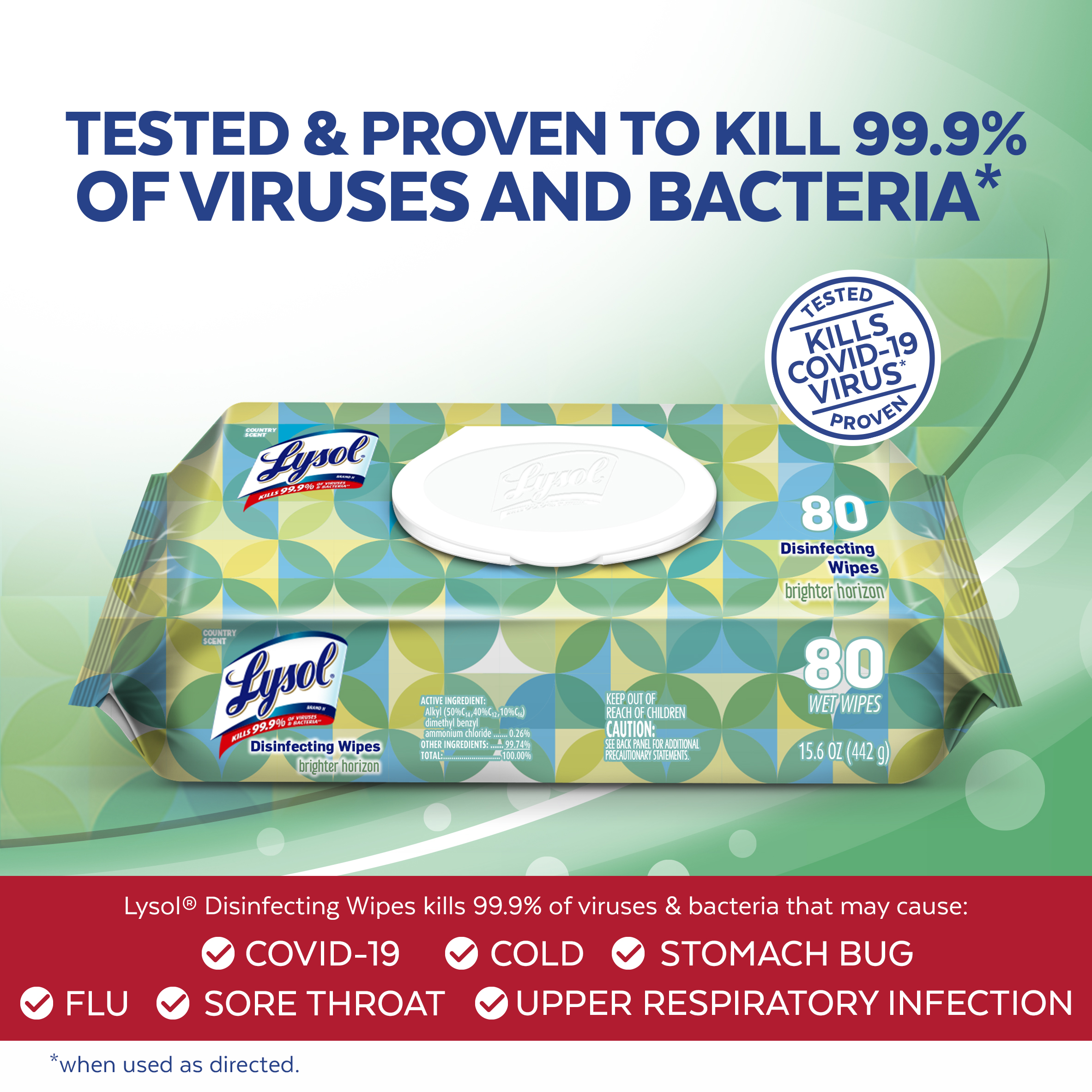 - Kills 99.9% of viruses and bacteria, including 8 cold and flu viruses** (**when used as directed)