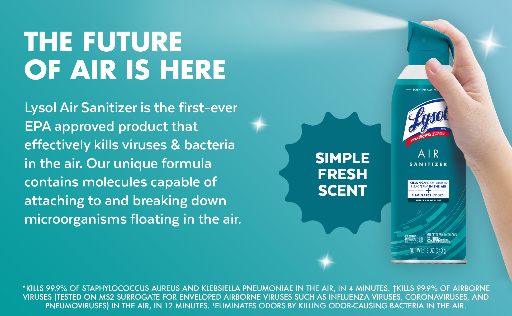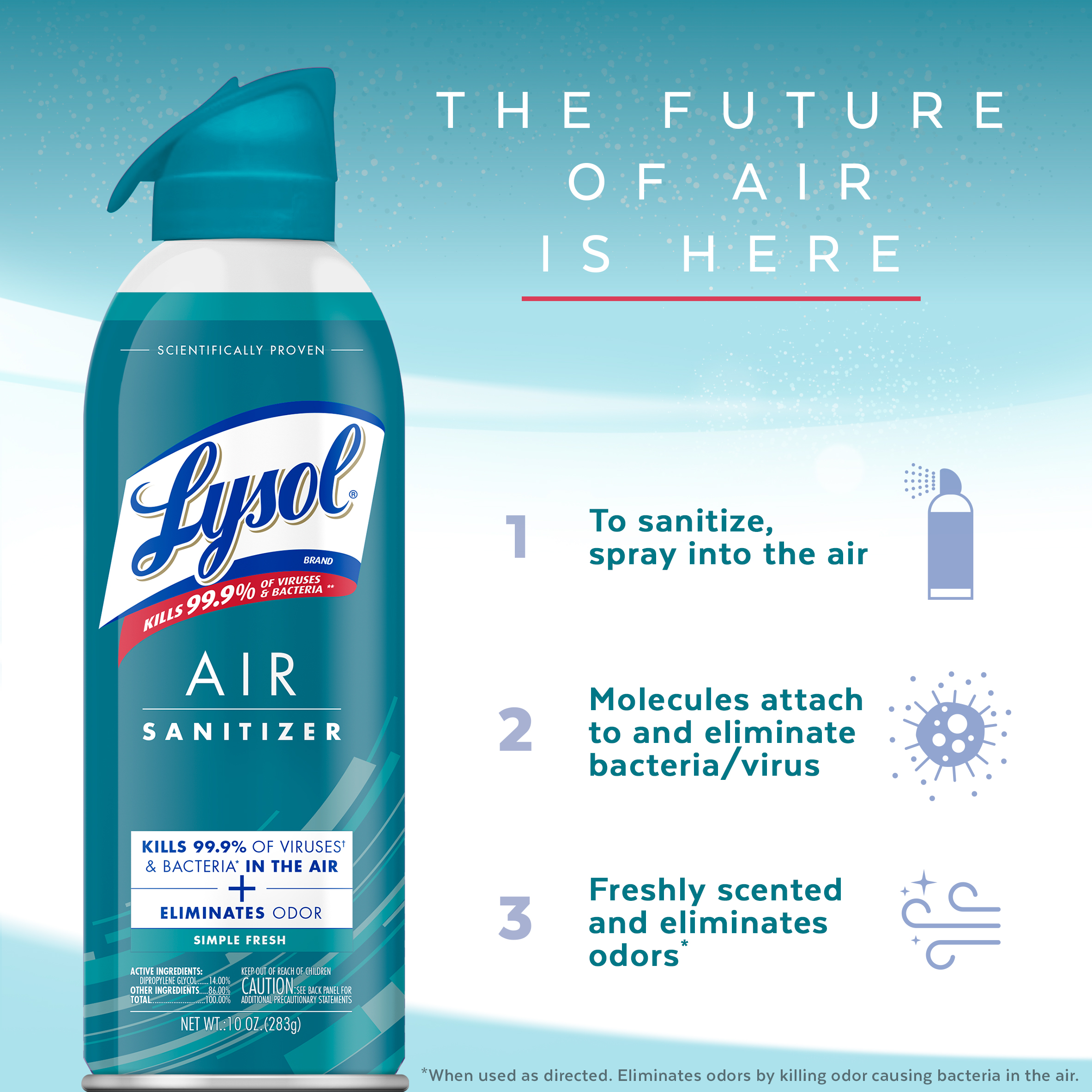 - ODOR ELIMINATOR SPRAY: Unlike most air freshener sprays, Lysol Air Sanitizer doesn’t mask unpleasant smells. It eliminates odors by killing 99.9% of odor-causing bacteria in the air*, and has a fresh Simple Fresh scent