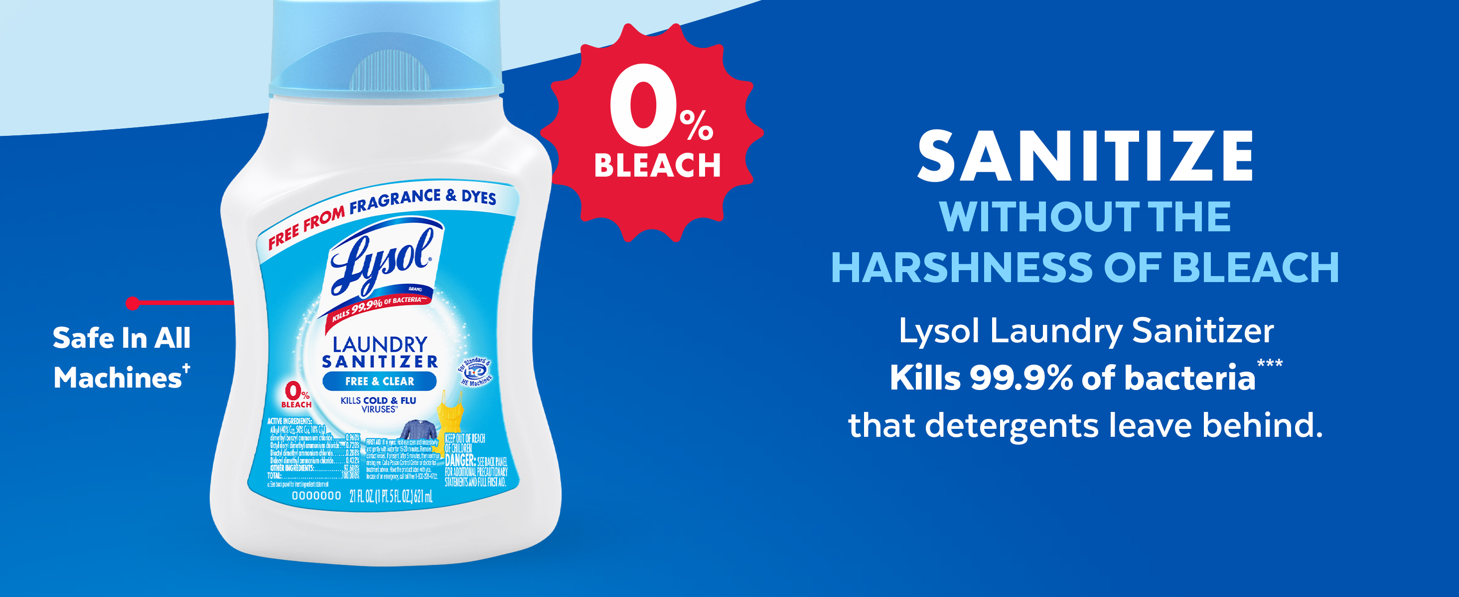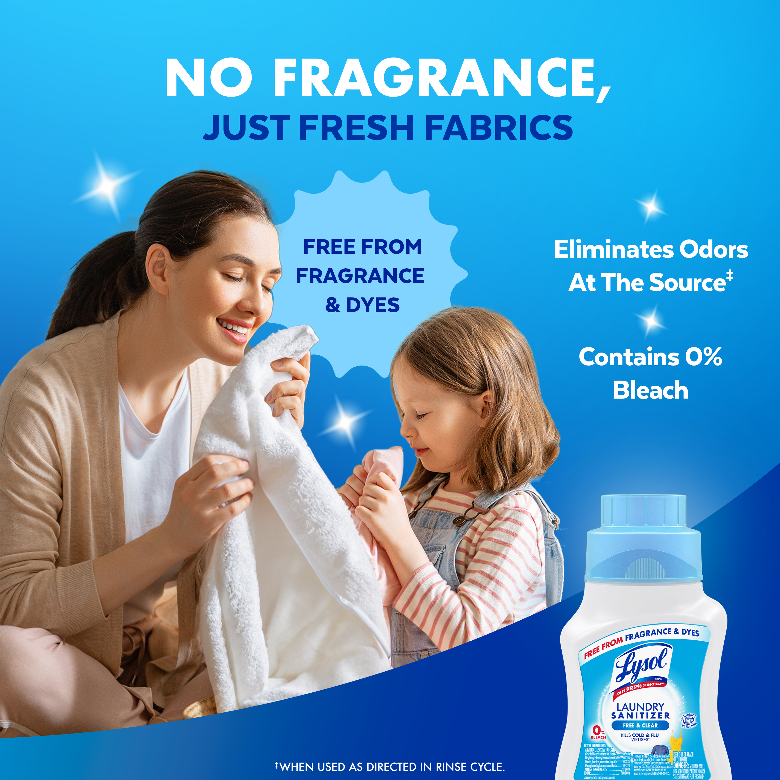 - FREE FROM FRAGRANCES AND DYES: Lysol Laundry Sanitizer Free and Clear is specially formulated without fragrances and dyes, making it ideal for baby clothes, bedding, and towels. Ensure a thorough clean, without scents or dyes.