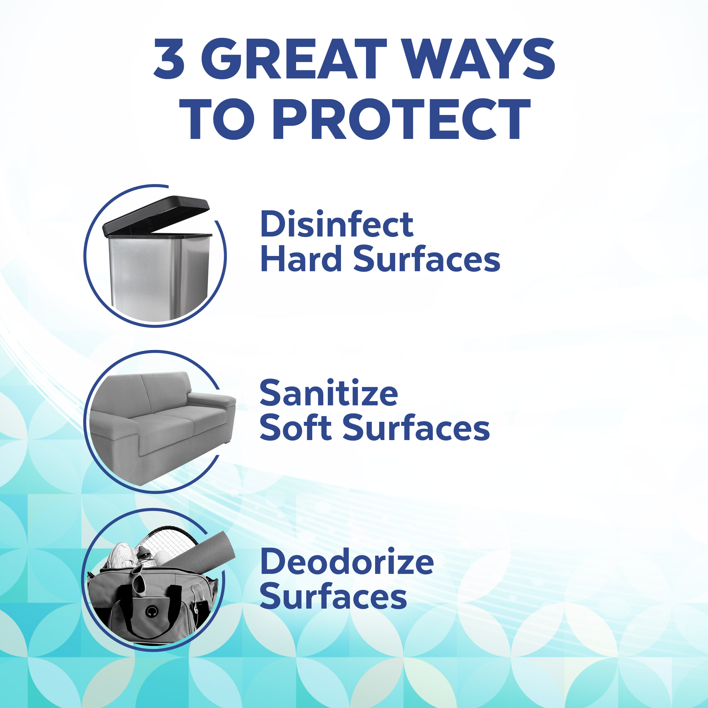 - Kills 99.9% of viruses and bacteria**(**when used as directed). Disinfects hard non-porous surface and soft surfaces.