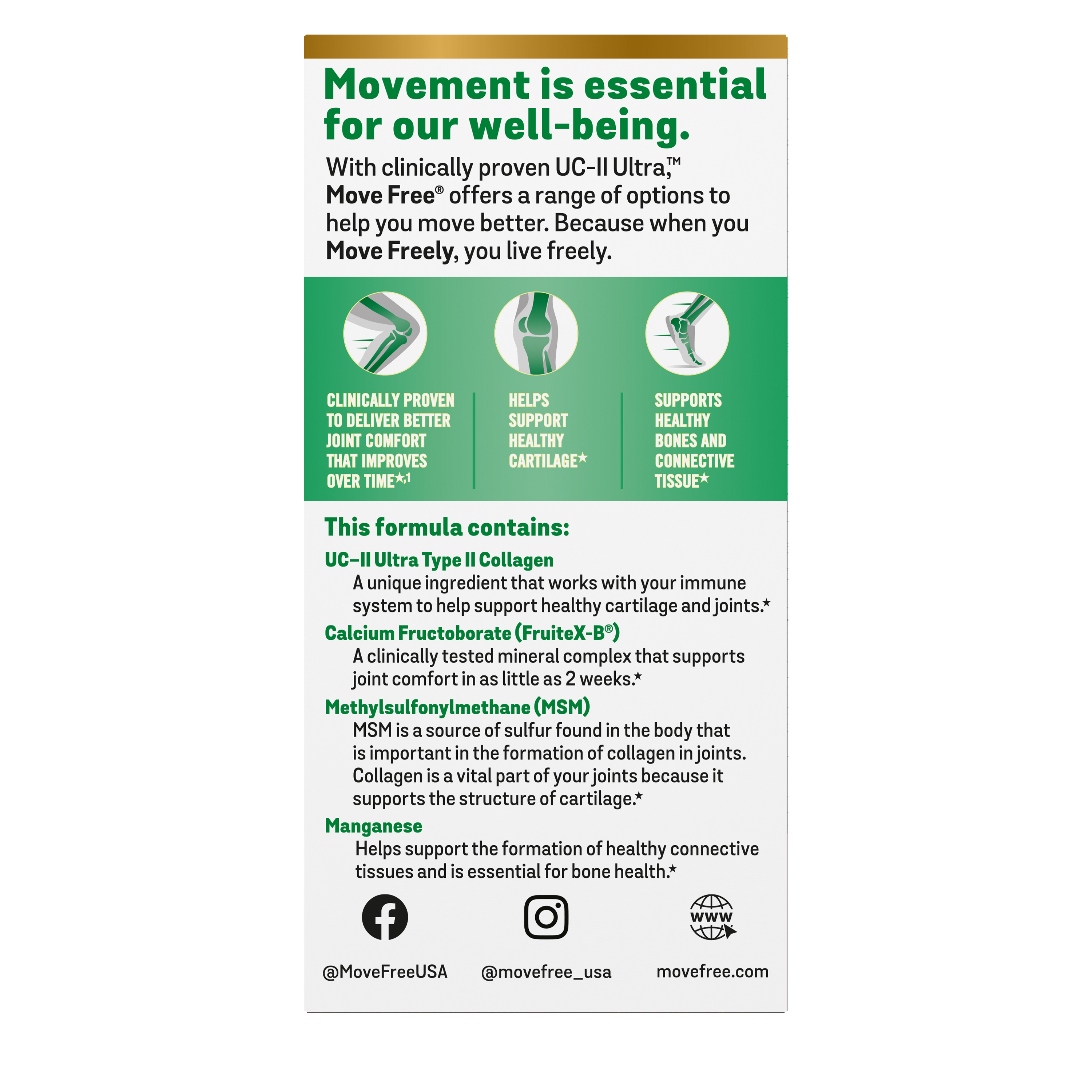 - DEVELOPED BY SCIENTISTS: The MOVE FREE product family with clinically tested ingredients, offers a range of solutions to help you move better. Because when you MOVE FREE-ly, you live freely.