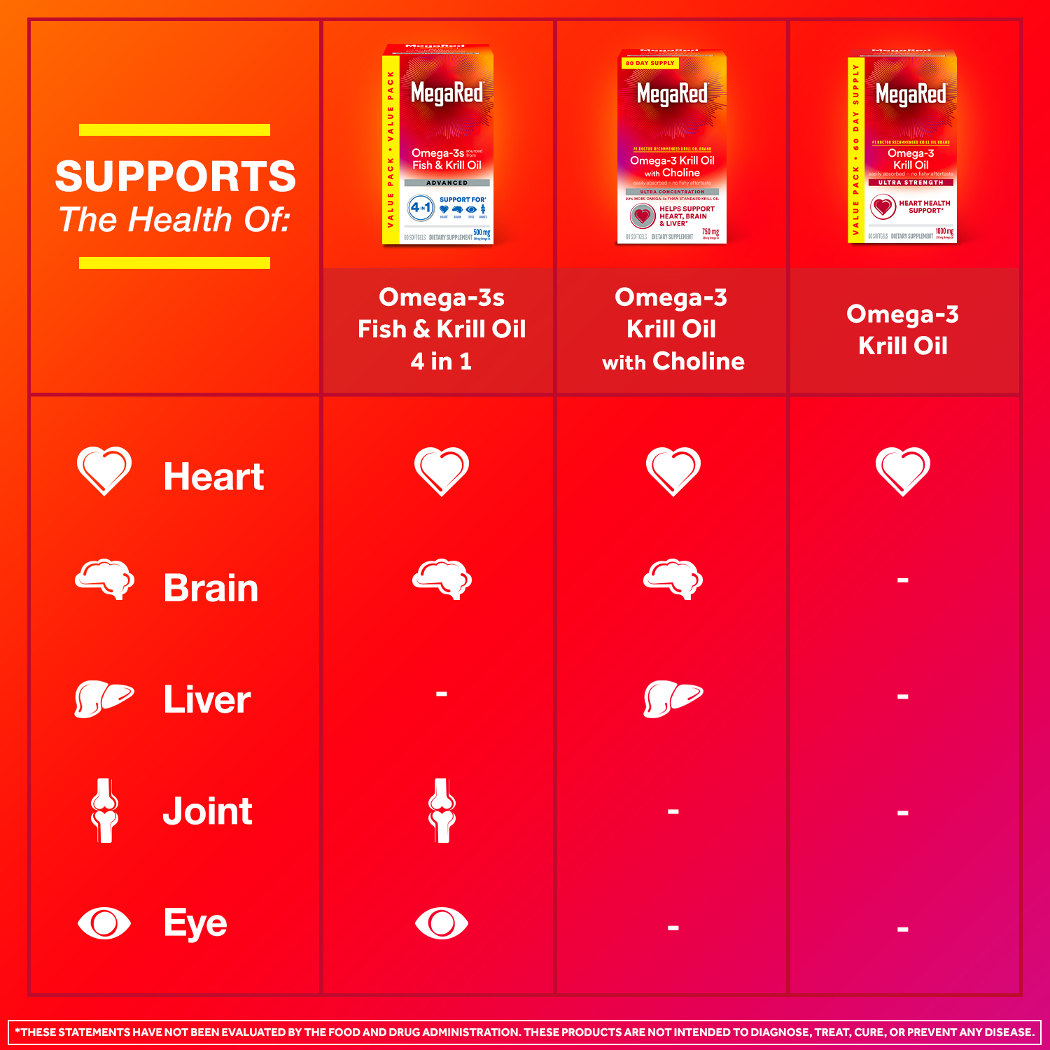 - BRAIN HEALTH SUPPORT: MegaRed Omega-3 Krill Oil with Choline Supplement contains Choline to support brain health in a once daily softgel.*