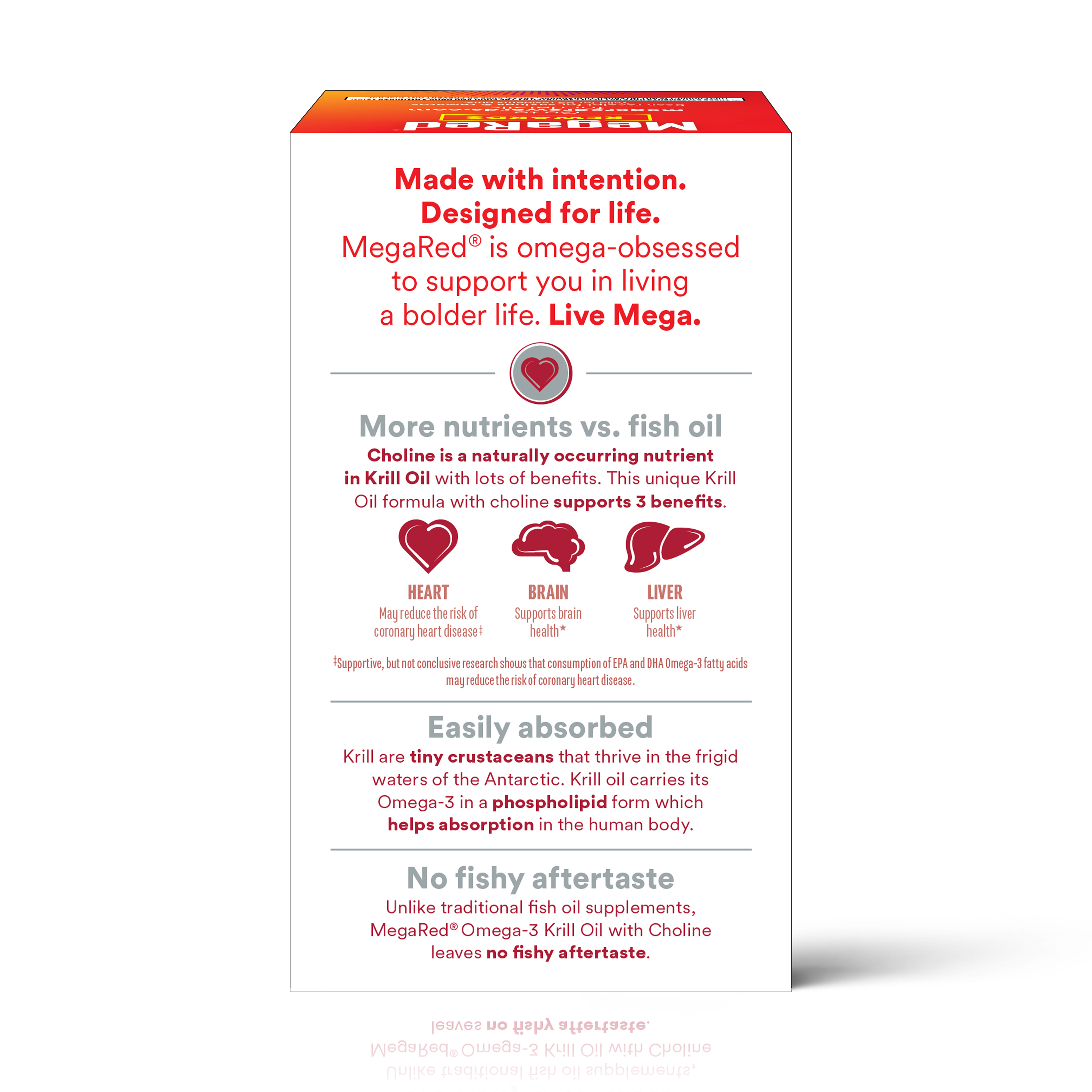 - KRILL OIL + CHOLINE: MegaRed Omega-3 Krill Oil with Choline, Ultra Concentration, uses a special combination of high concentration and easy absorption Antarctic krill oil, with 22% more Omega-3s than standard krill oil, to support Heart, Brain, and Liver health.*