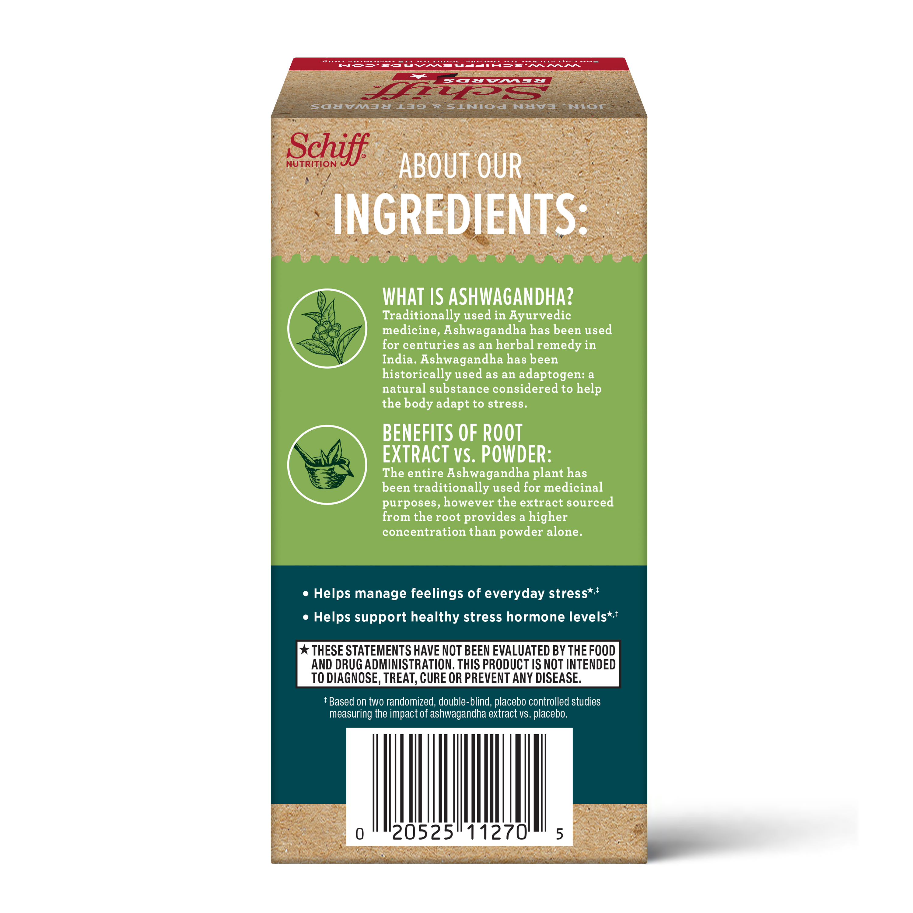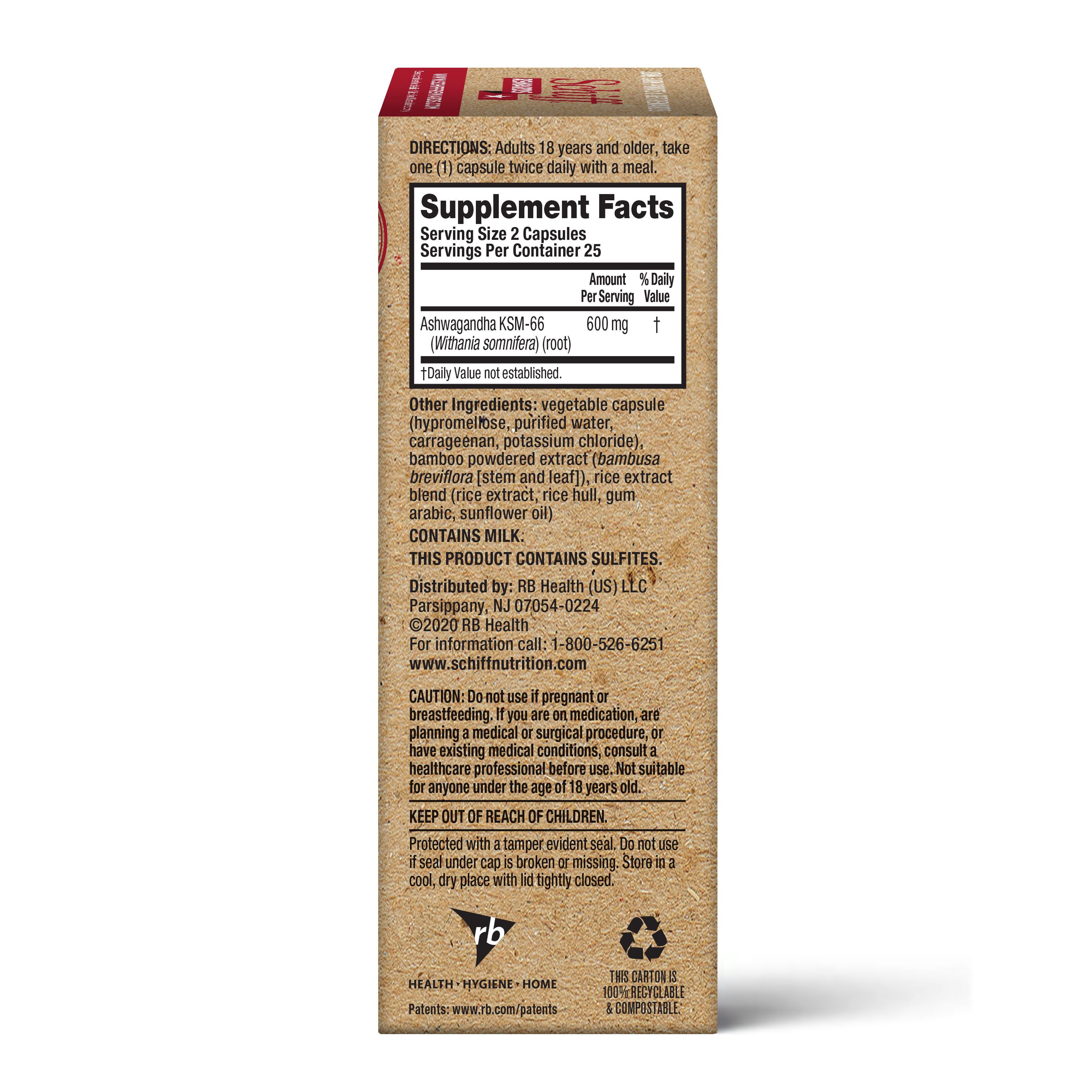 - ENVIRONMENTALLY FRIENDLY AND SUSTAINABLE PACKAGING: The box that holds your Whole Root Ashwagandha Extract is made from post-consumer recycled natural kraft paper, which is also 100% recyclable & compostable. At Schiff we value the environment and know you do as well. It is our commitment to provide sustainable solutions to protect the future for EVERYONE.