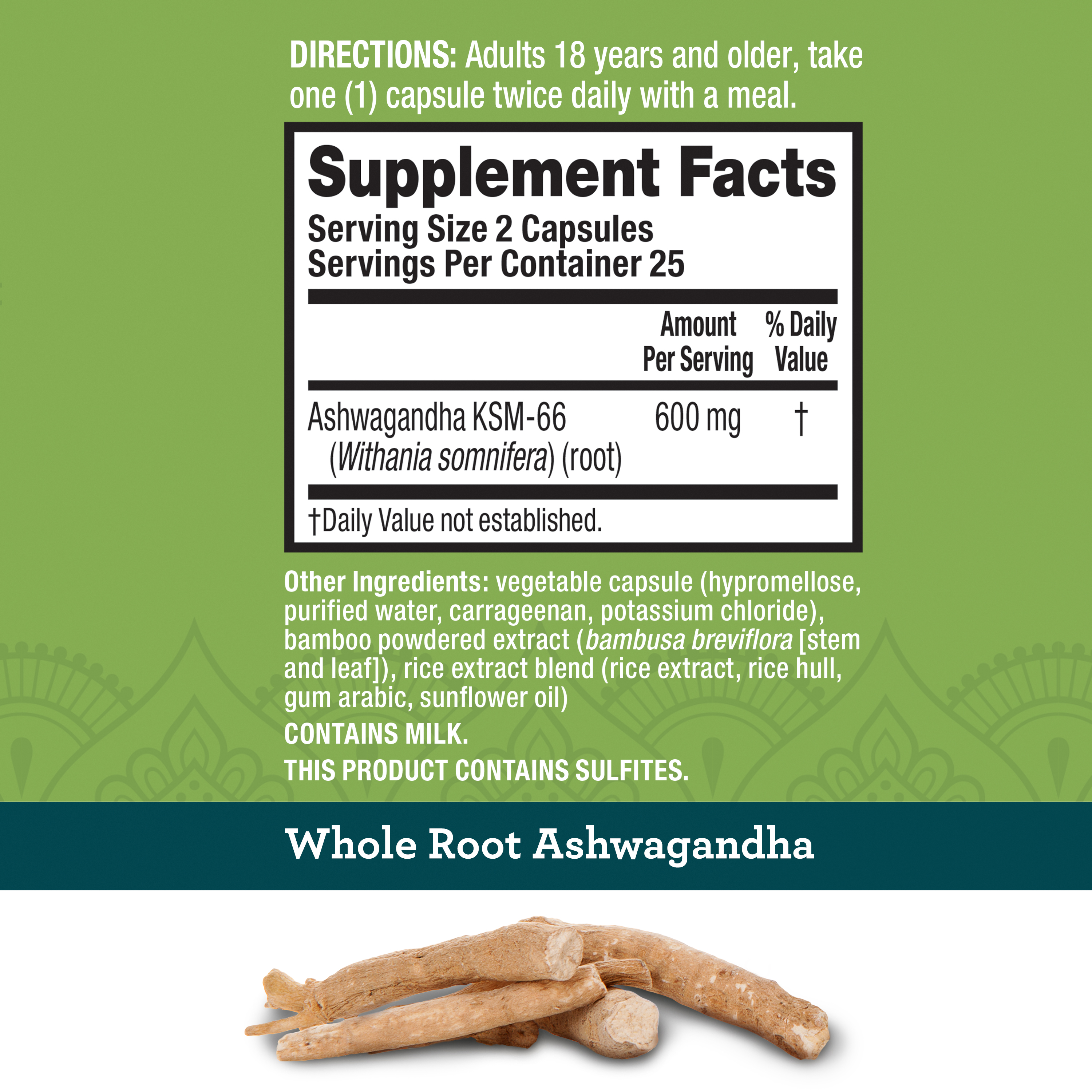 - IMPORTANT CALLOUTS: Schiff Whole Root Ashwagandha Extract is VEGETARIAN, NON-GMO, and GLUTEN-FREE with NO COLORS ADDED. Please note that this product contains milk and sulfites.