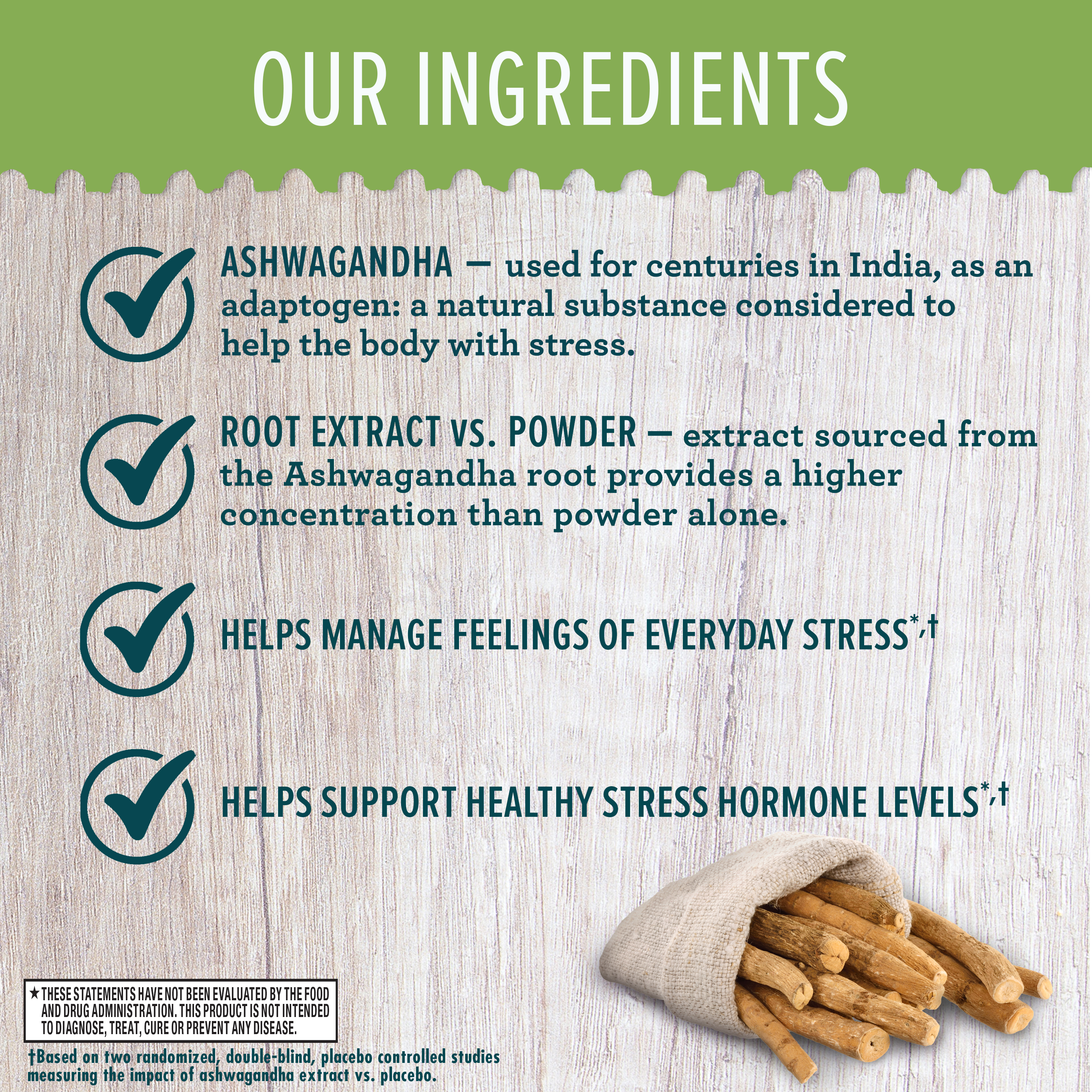 - *These statements have not been evaluated by the food and drug administration. This product is not intended to diagnose, treat, cure or prevent any disease. ǂBased on two randomized, double-blind, placebo controlled studies measuring the impact of ashwagandha extract vs. placebo.
