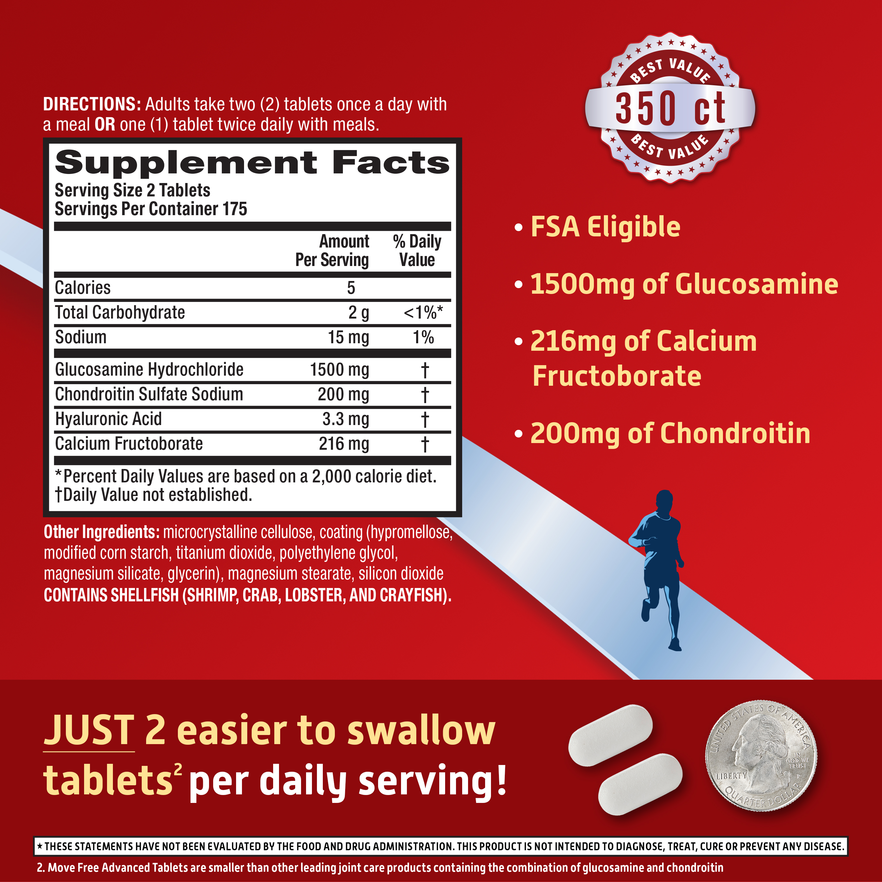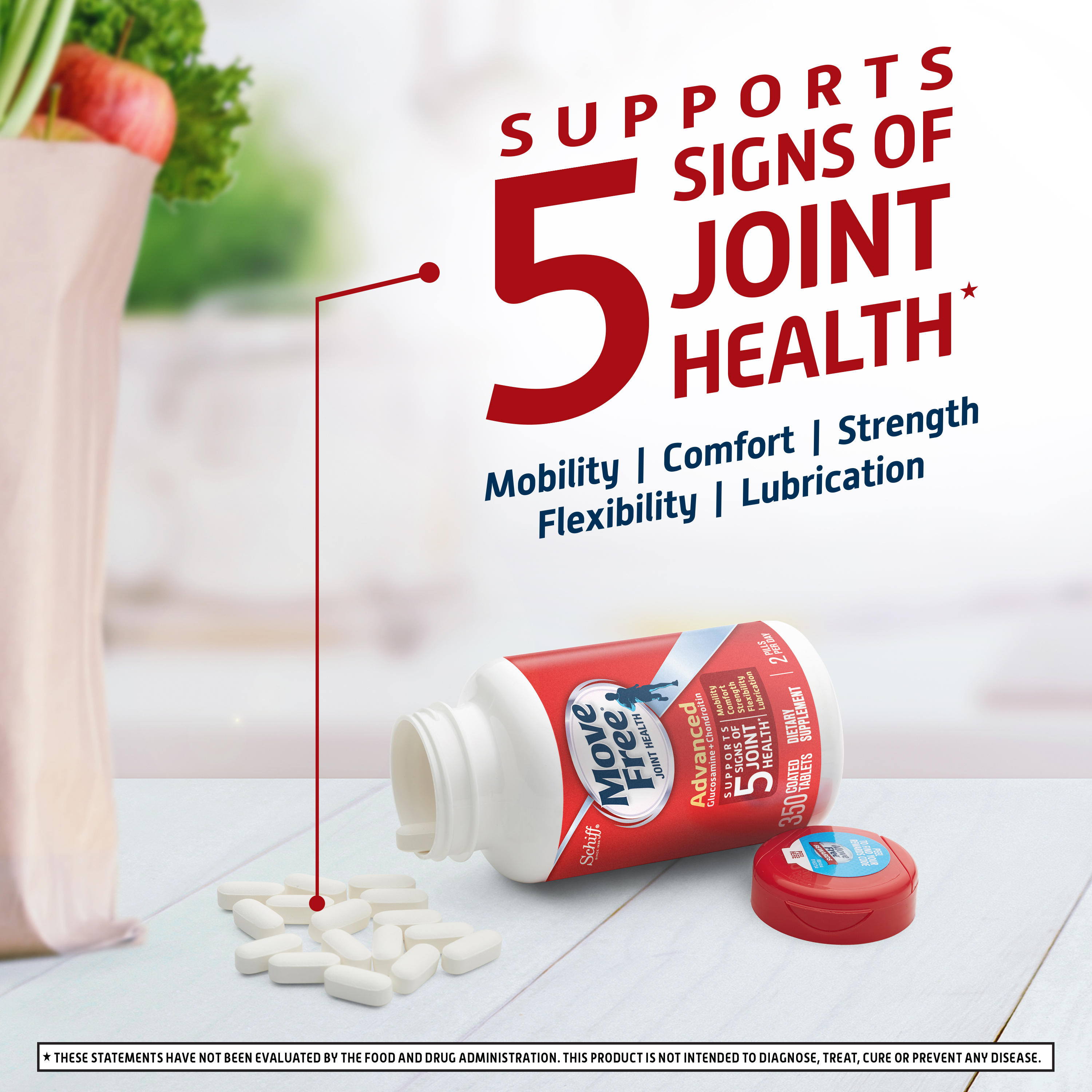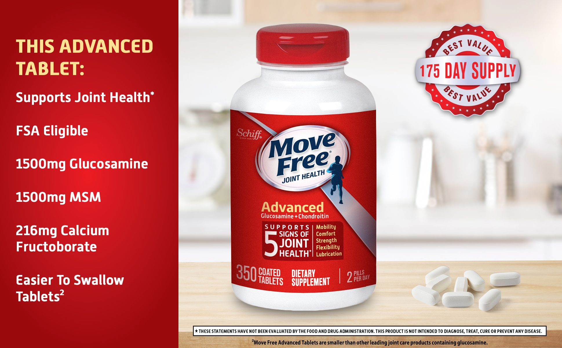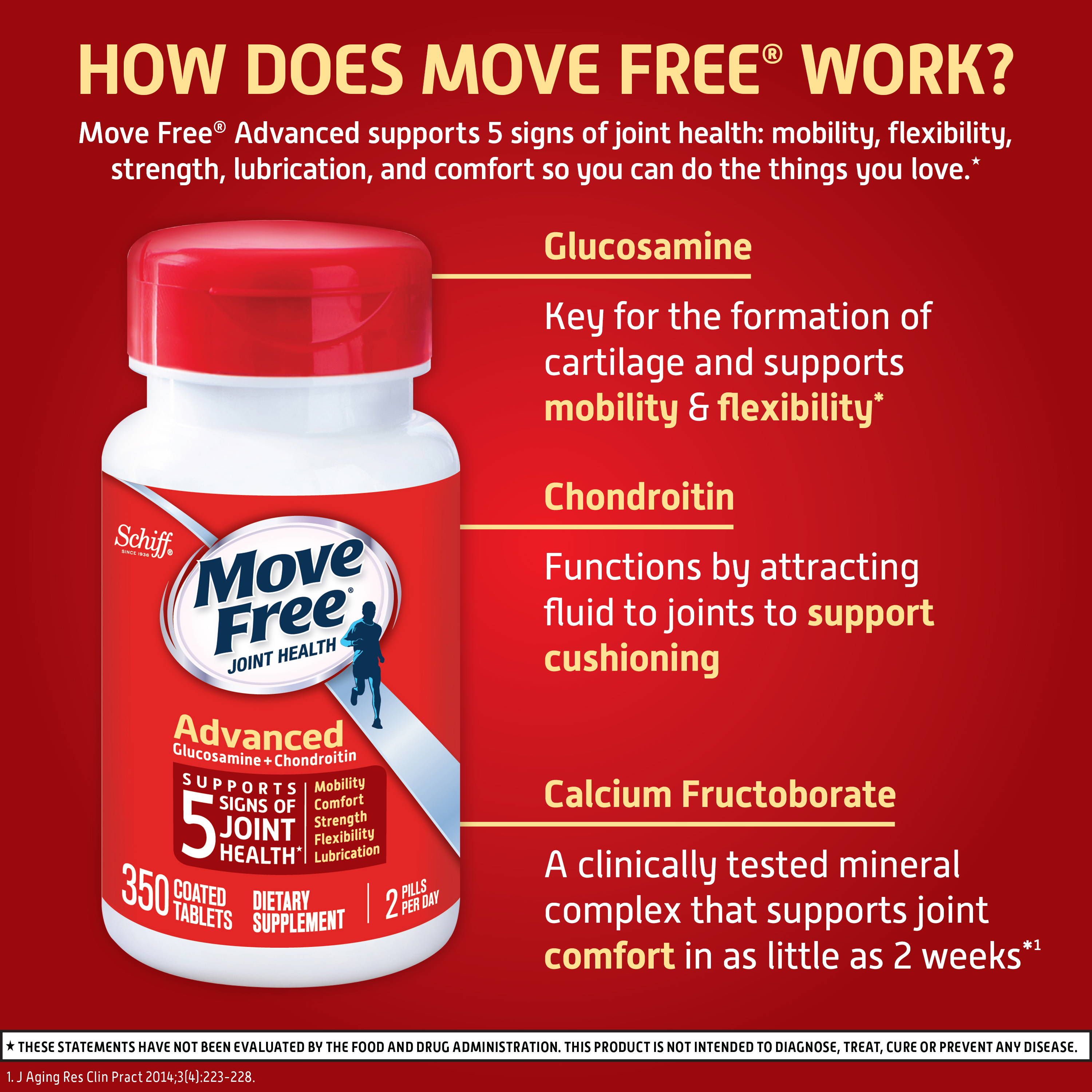 - WHAT IS IT: Move Free Advanced is a Glucosamine & Chondroitin joint supplement that supports 5 signs of joint health (mobility, flexibility, strength, lubrication and comfort)* so you can do the things you love.