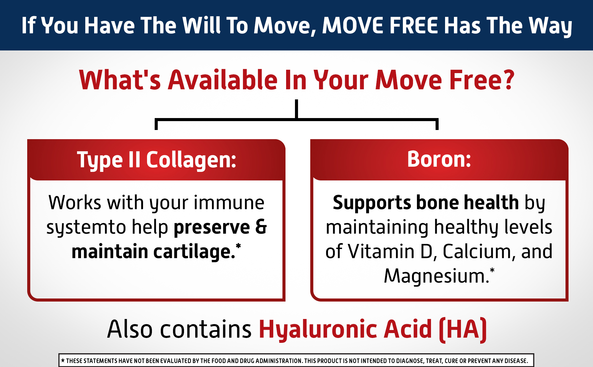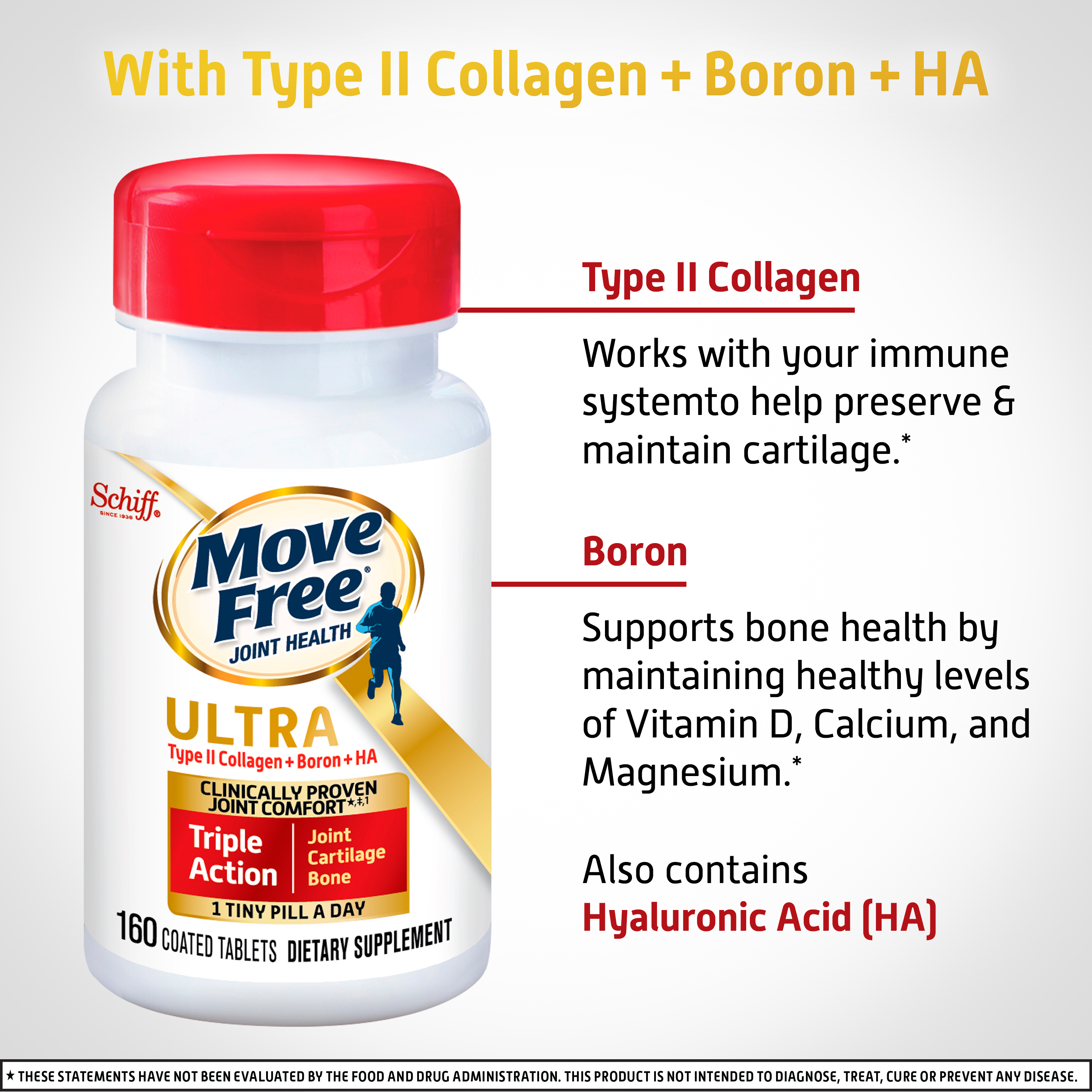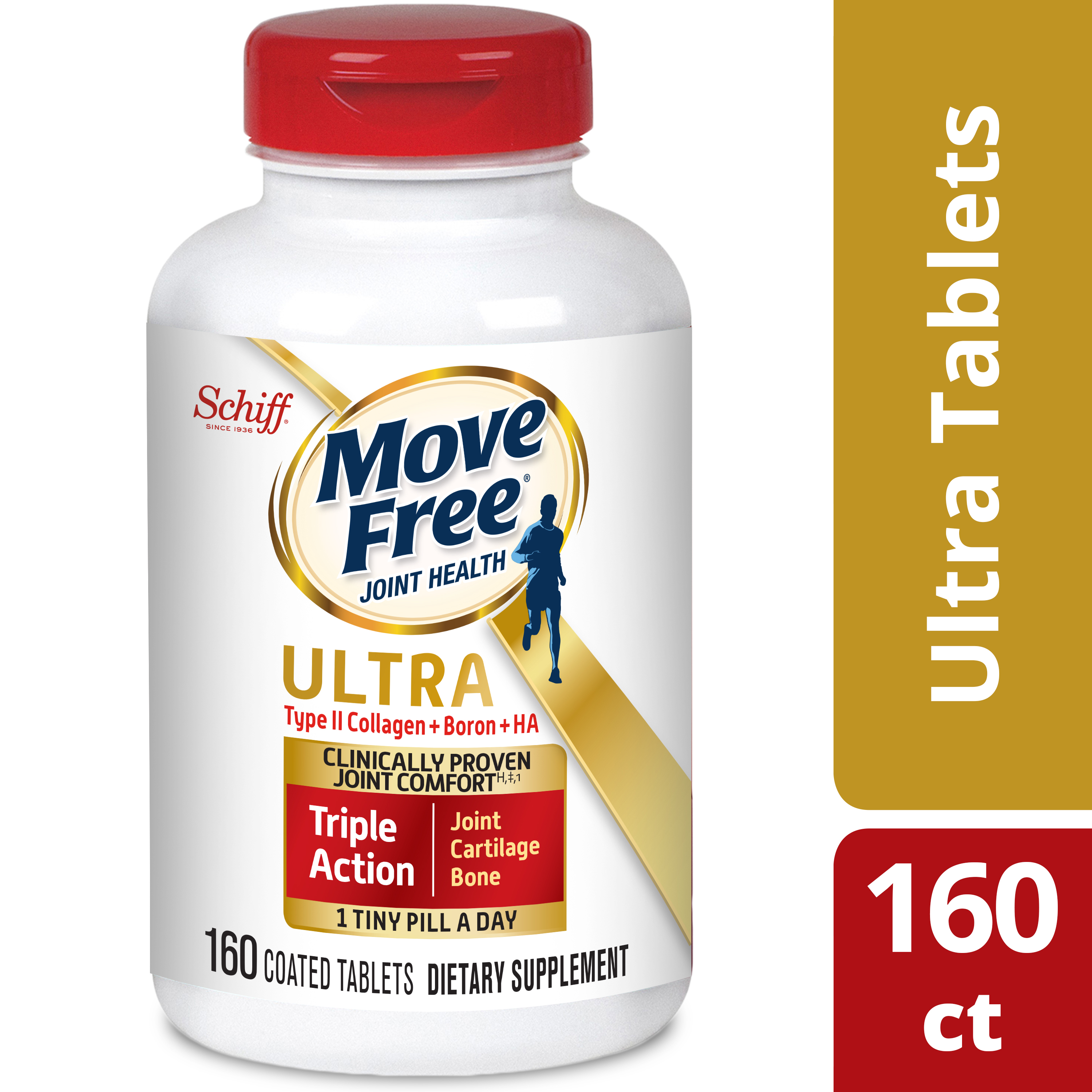 - WHAT IS IT: Move Free Ultra Triple Action uses a unique formulation with Type II Collagen, Boron & HA. It provides clinically proven joint comfort*‡¹, helps preserve & maintain healthy cartilage*, and helps support healthy bones.*