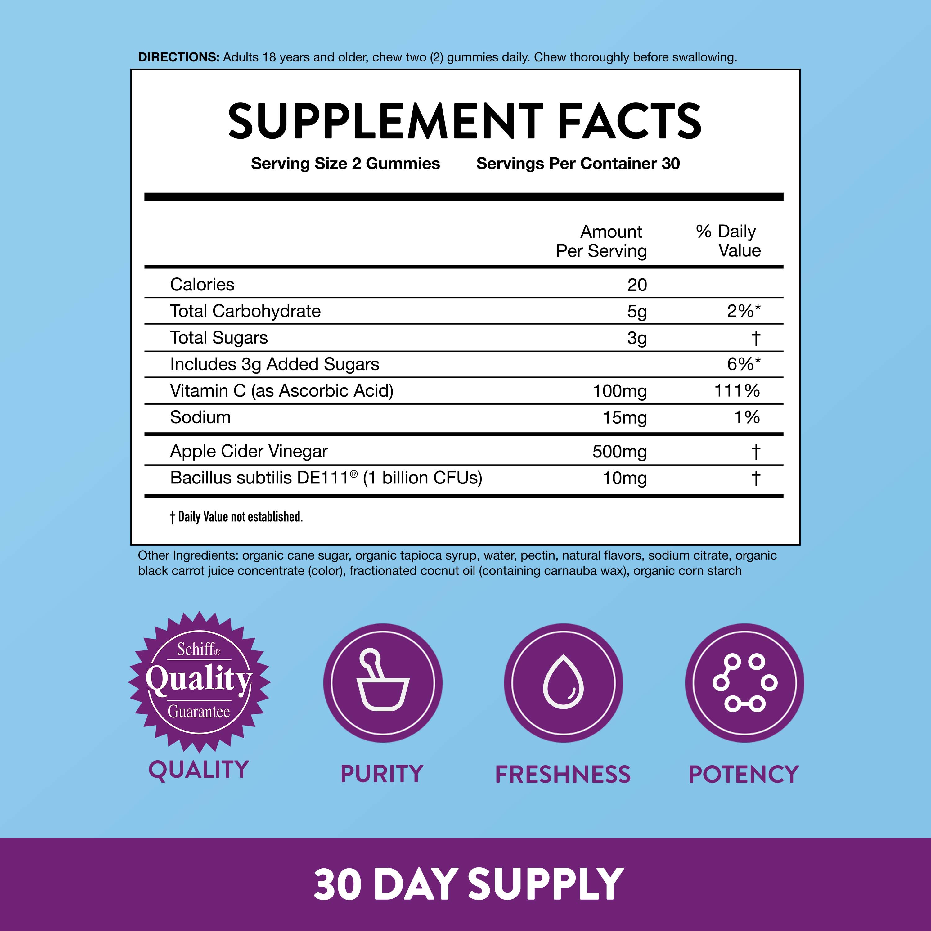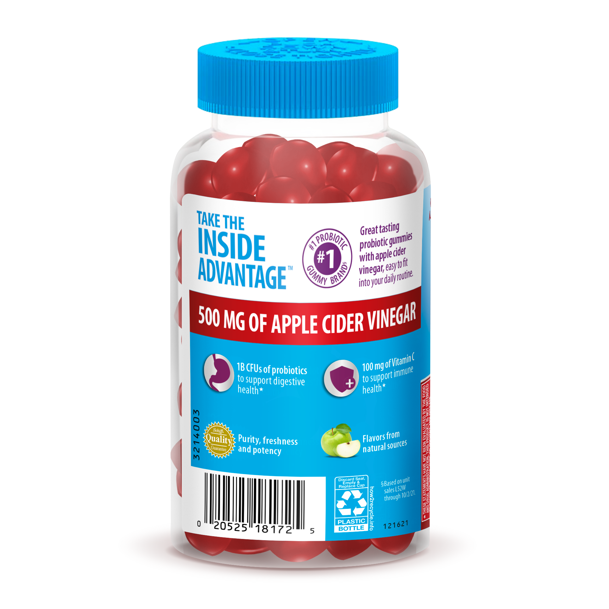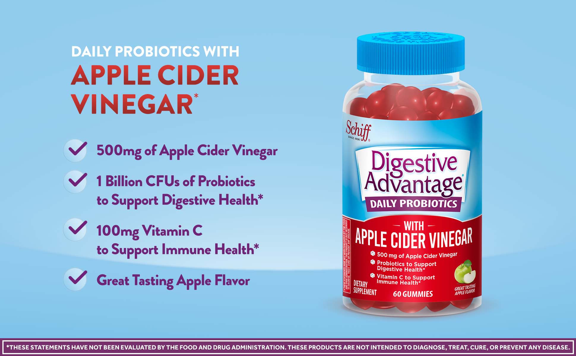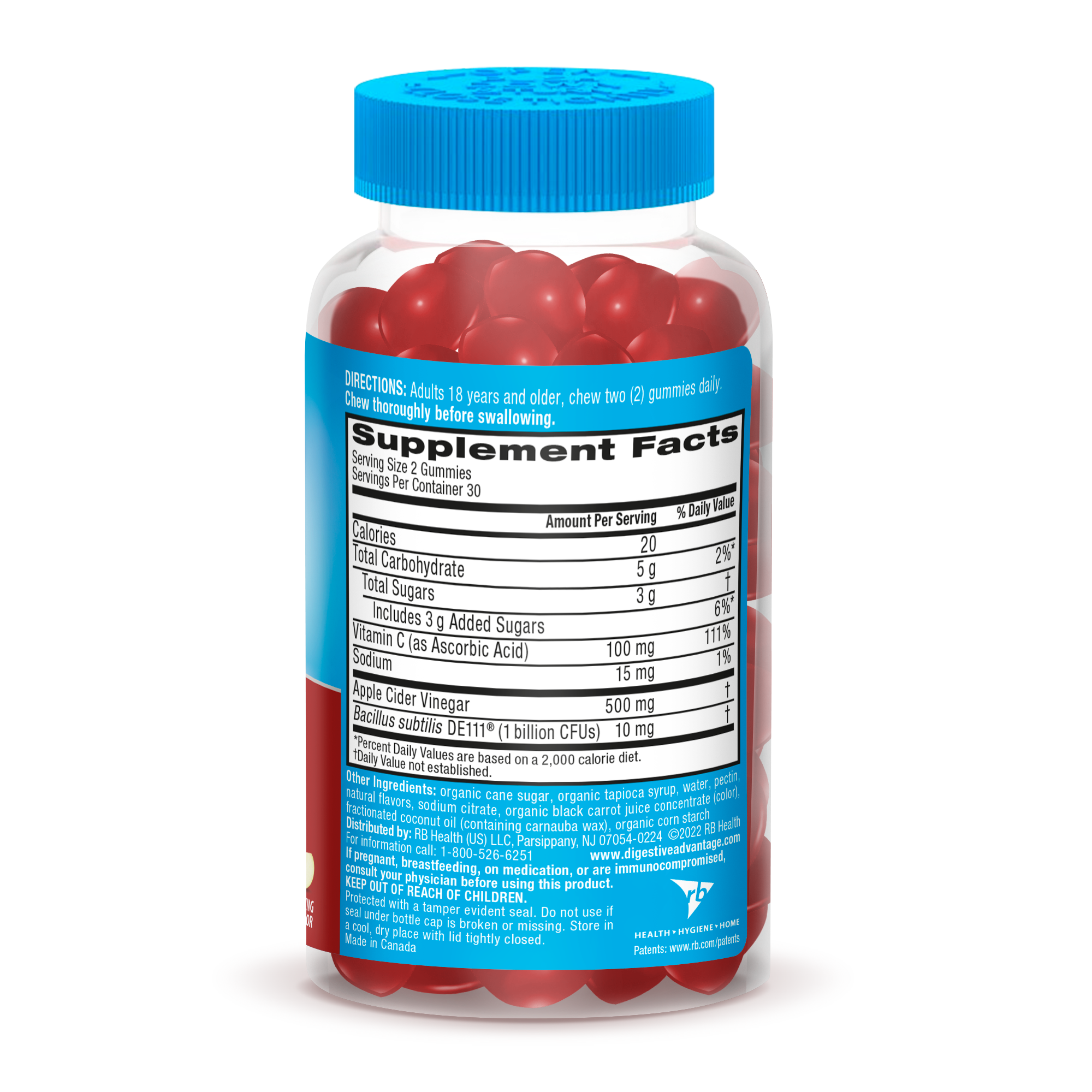 | Product Description | Digestive Advantage Daily Probiotic Gummies with Apple Cider Vinegar are great tasting and has naturally sourced flavors with 500mg of Apple Cider Vinegar. The probiotic gummies also have 1 Billion CFUs of bacillus subtilis DE111® to help support digestive health* Not only that but these probiotic gummies contain over 100% of your daily value of Vitamin C to support your immune health.*