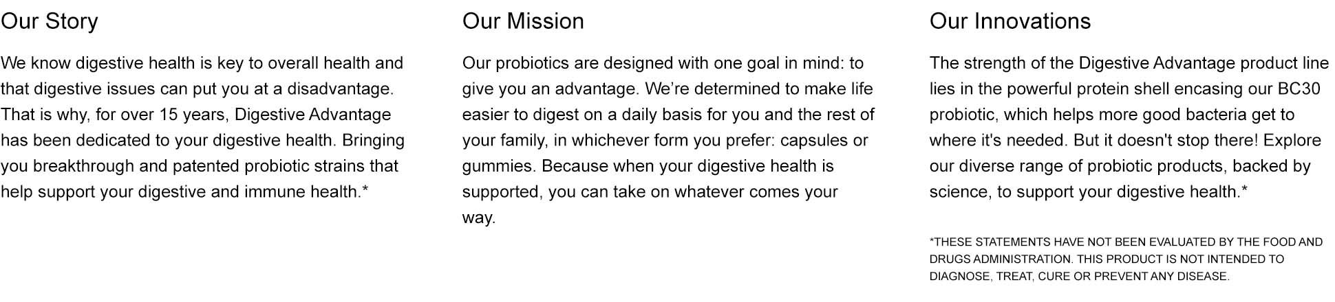 Digestive Advantage is the #1 Probioitic Gummy Brand§. At Digestive Advantage we believe that digestive health is key to overall health and that digestive issues can put you at a disadvantage. For over 15 years, Digestive Advantage has been dedicated to your digestive & immune health by bringing you breakthrough and patented probiotic strains.*