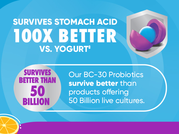 - BC30 probiotic survives 10X better than other probiotics, including yogurt