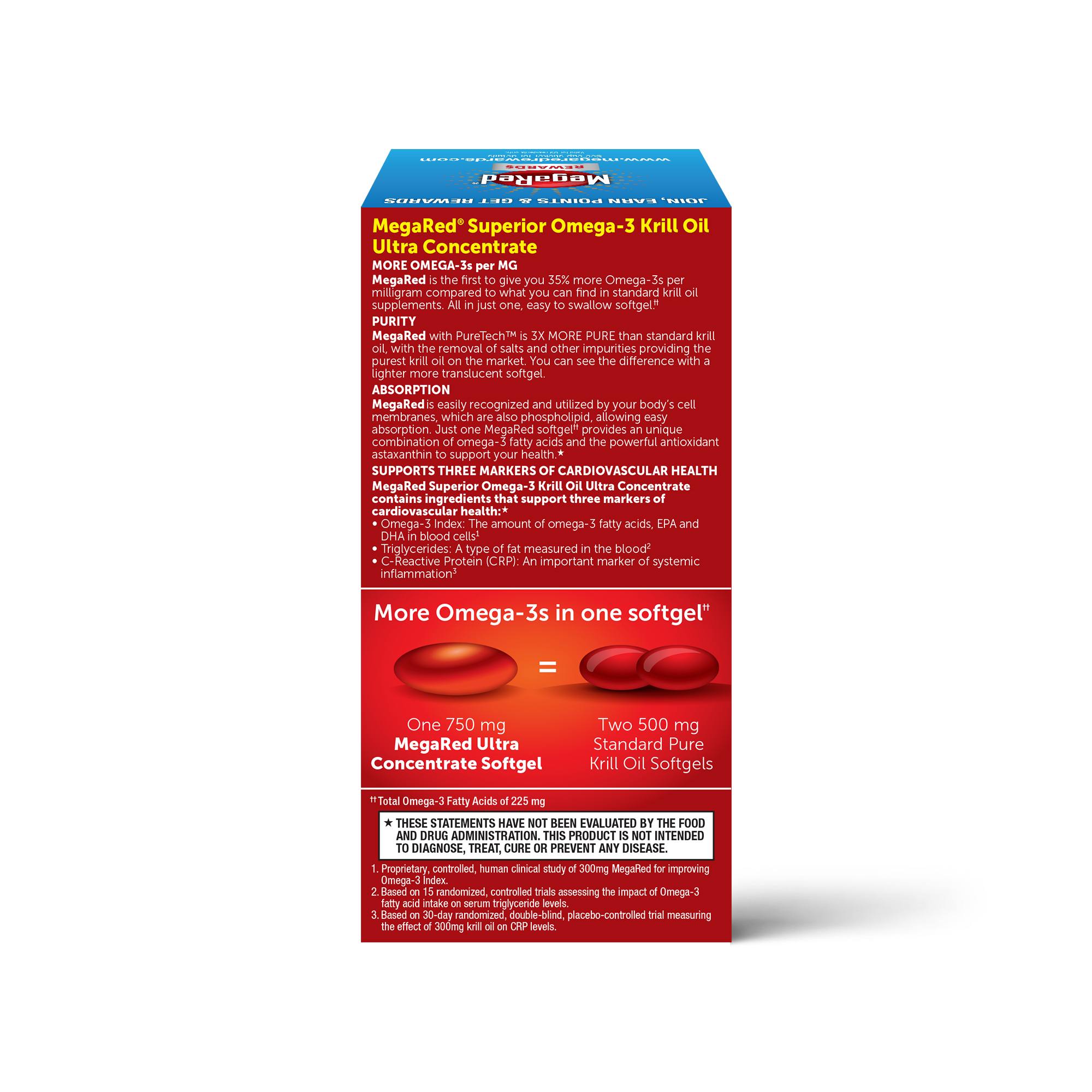 | Product Description | MegaRed 750mg Ultra Concentration Omega-3 Krill Oil supplements provide an optimal combination of Omega-3 fatty acids and the powerful antioxidant astaxanthin to support heart health in a once daily softgel. MegaRed 750mg Ultra Concentration Omega-3 Krill Oil has been shown to significantly increase your Omega-3 index in just 30 days1. To ensure purity, we remove salts and other impurities to provide the purest krill oil on the market.٭