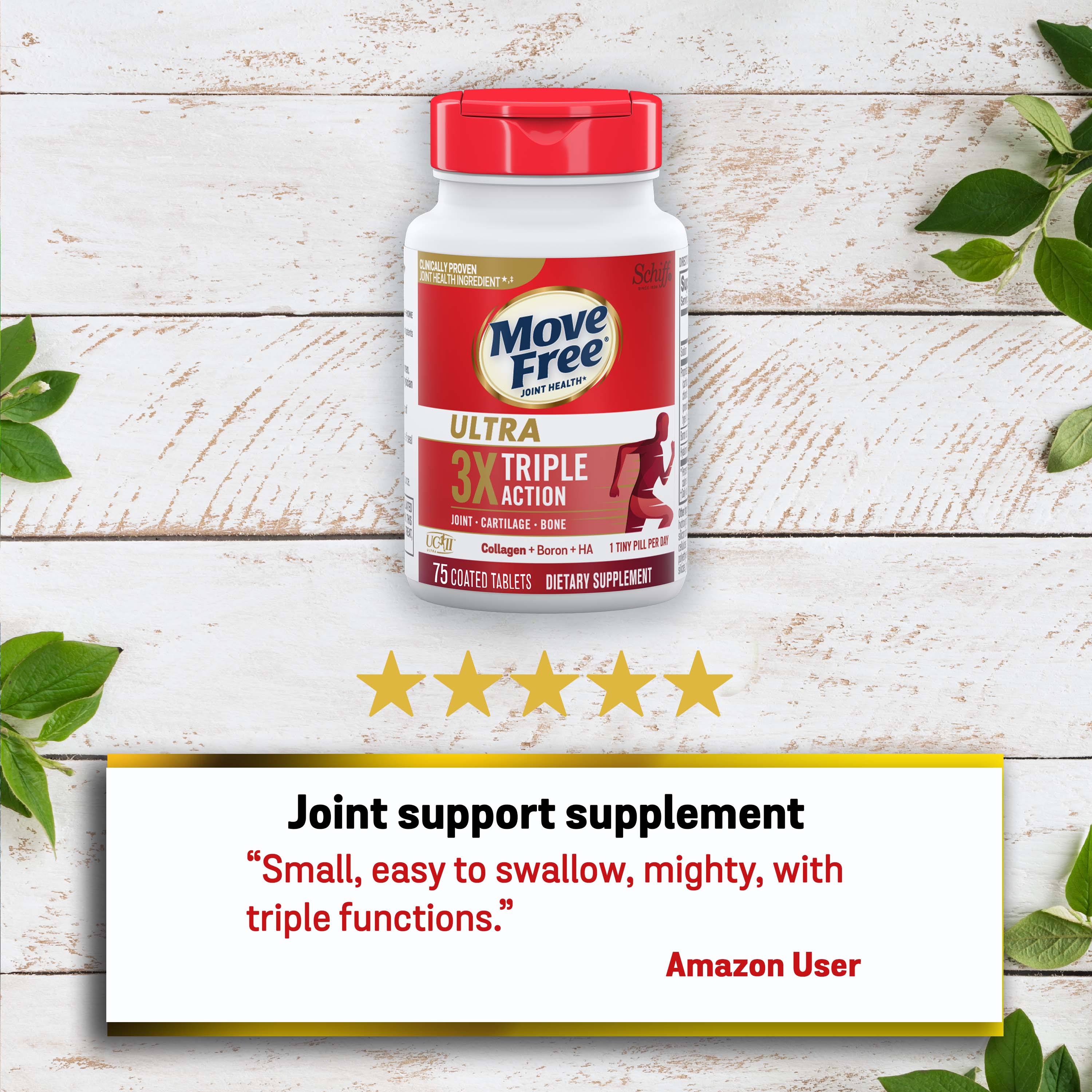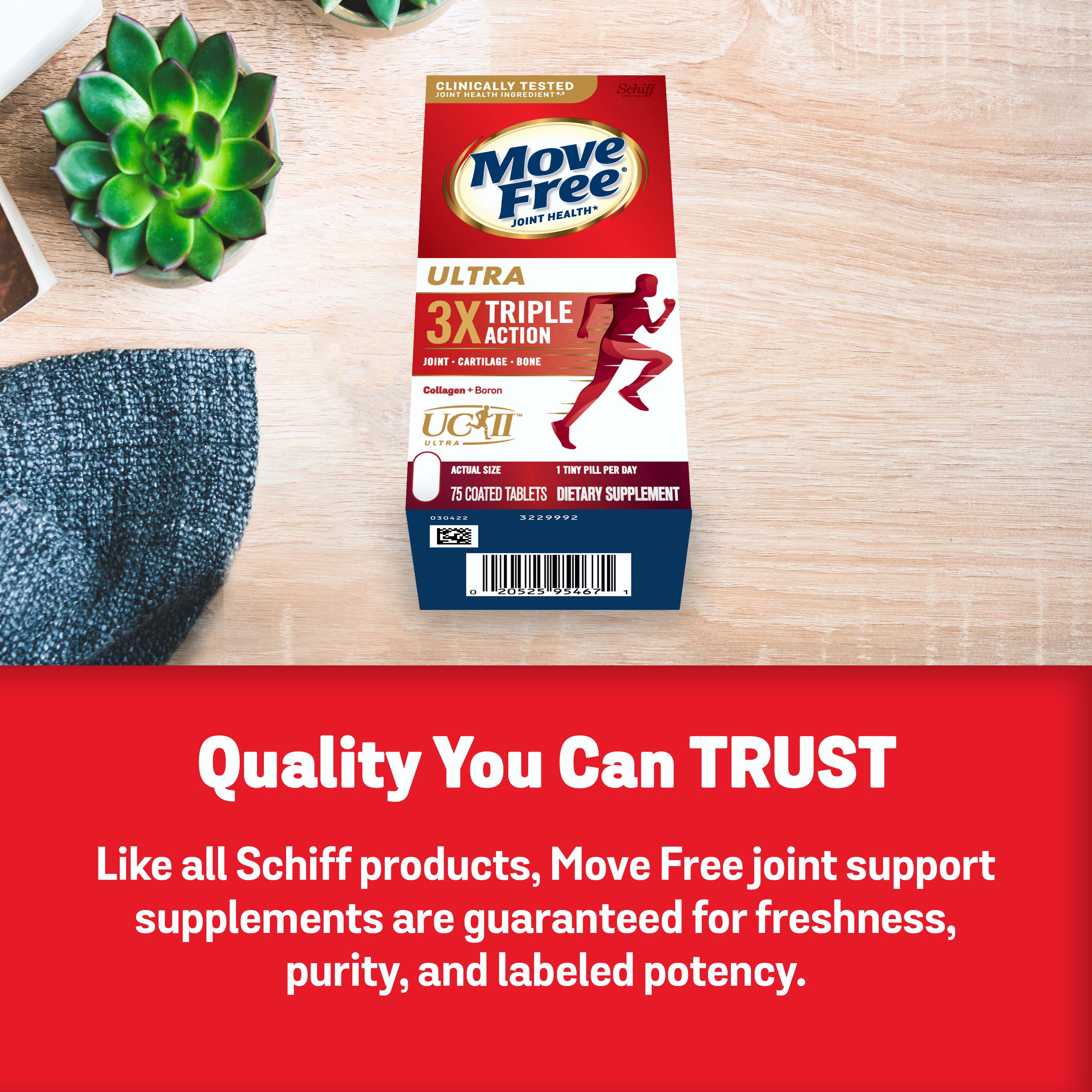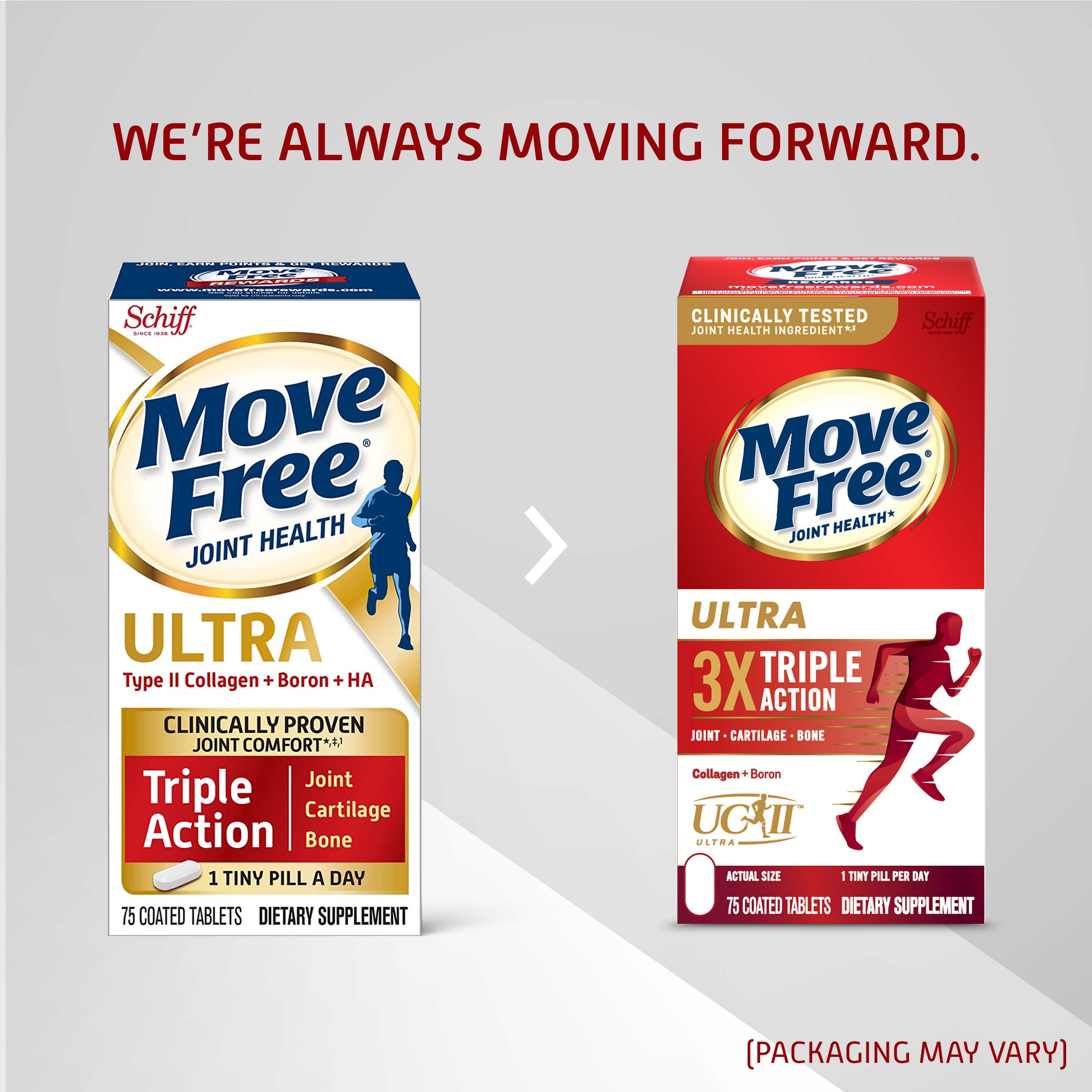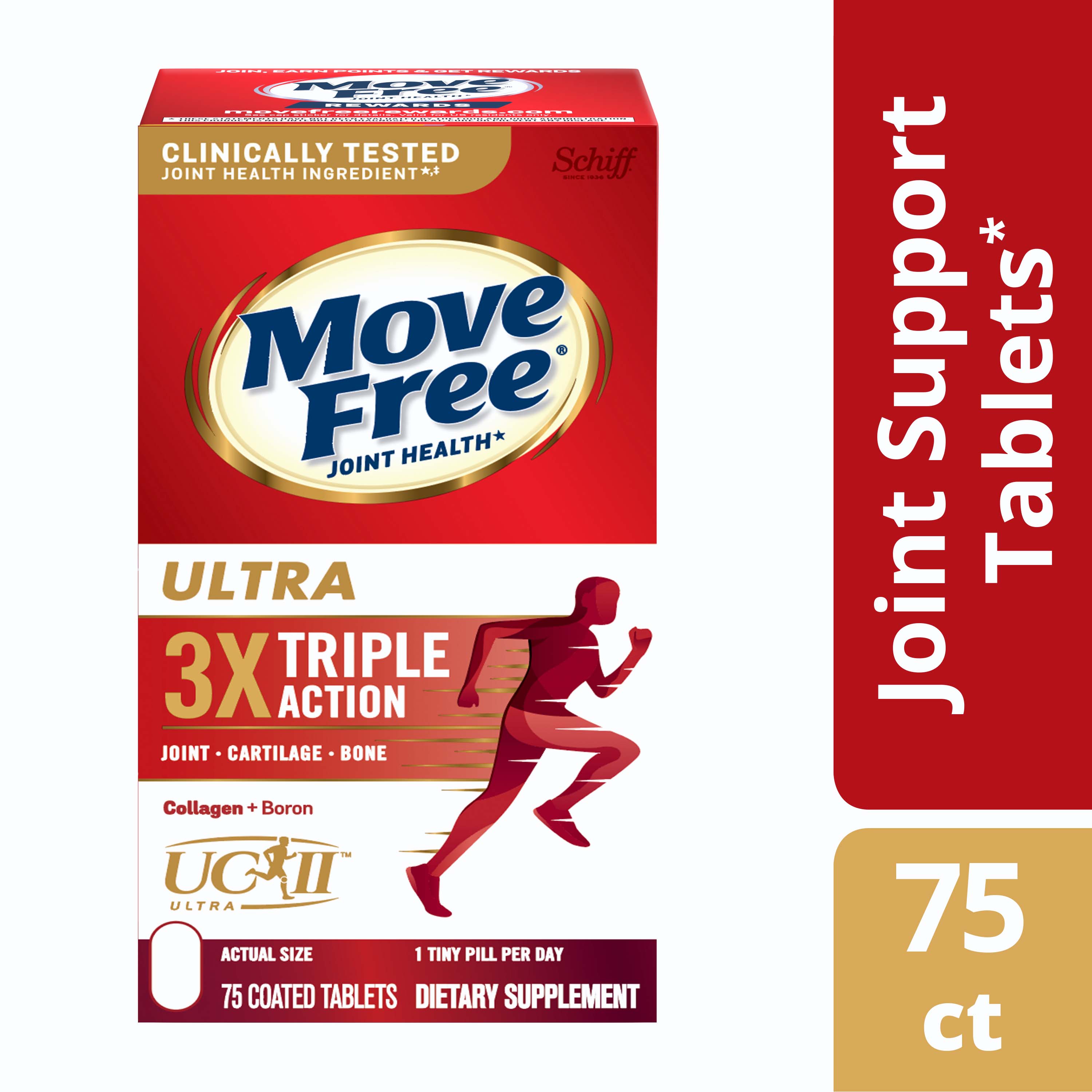 - WHAT IS IT: Move Free Ultra Triple Action uses a unique formulation with Type II Collagen, Boron & HA. It provides clinically proven joint comfort*‡¹, helps preserve & maintain healthy cartilage*, and helps support healthy bones.*