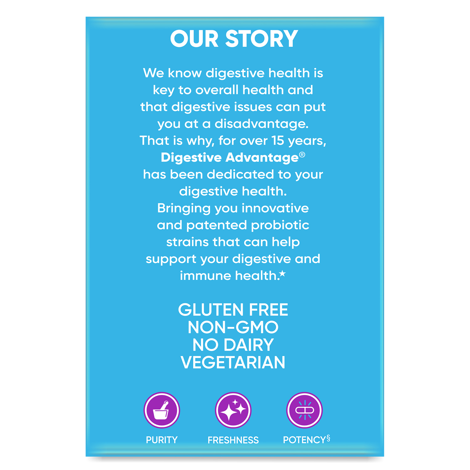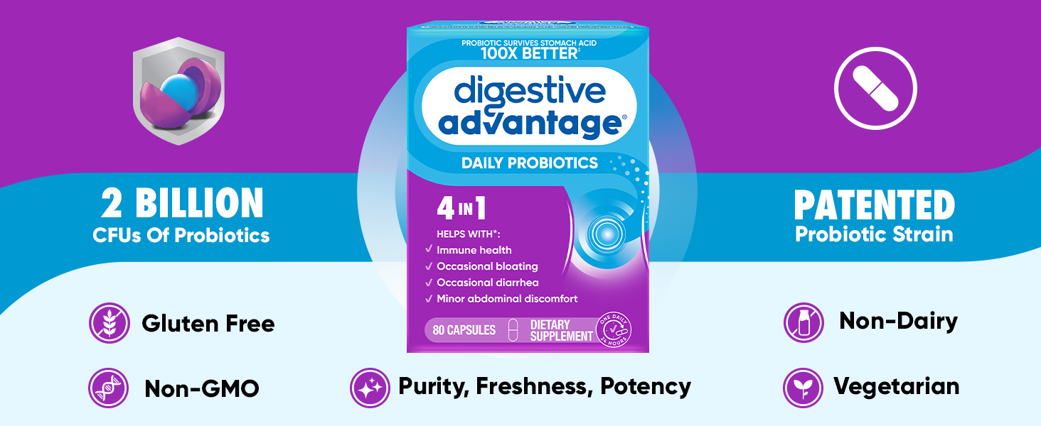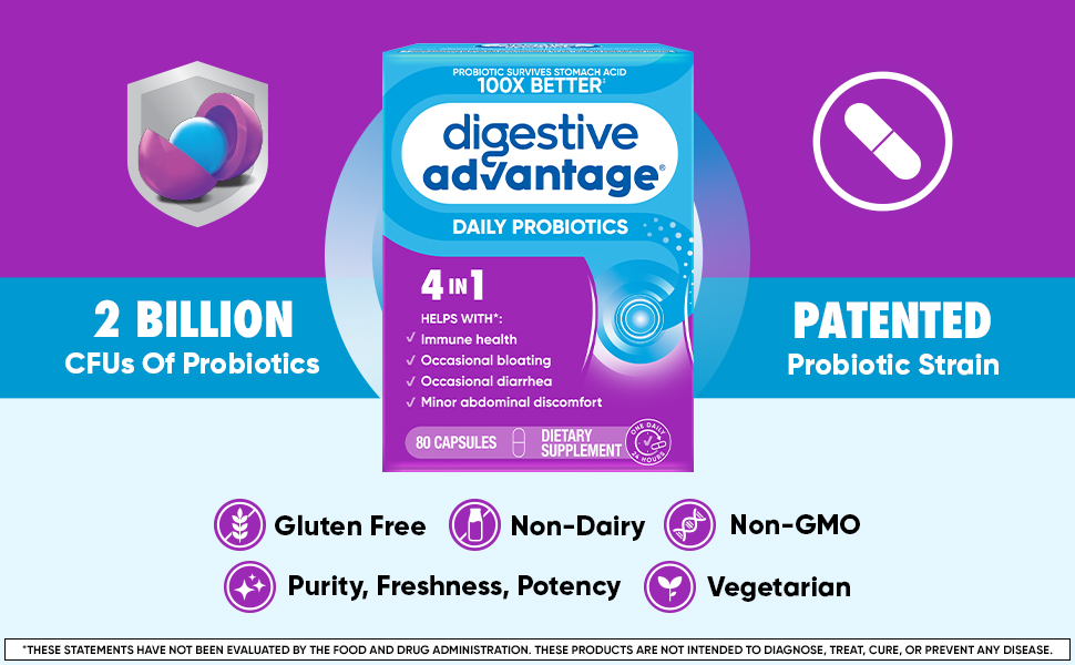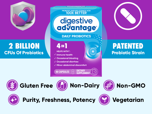 - Digestive Advantage Daily Probiotic capsules are Gluten Free, Non-GMO, No Dairy, Vegetarian, and are guaranteed for Purity, Freshness, Potency.