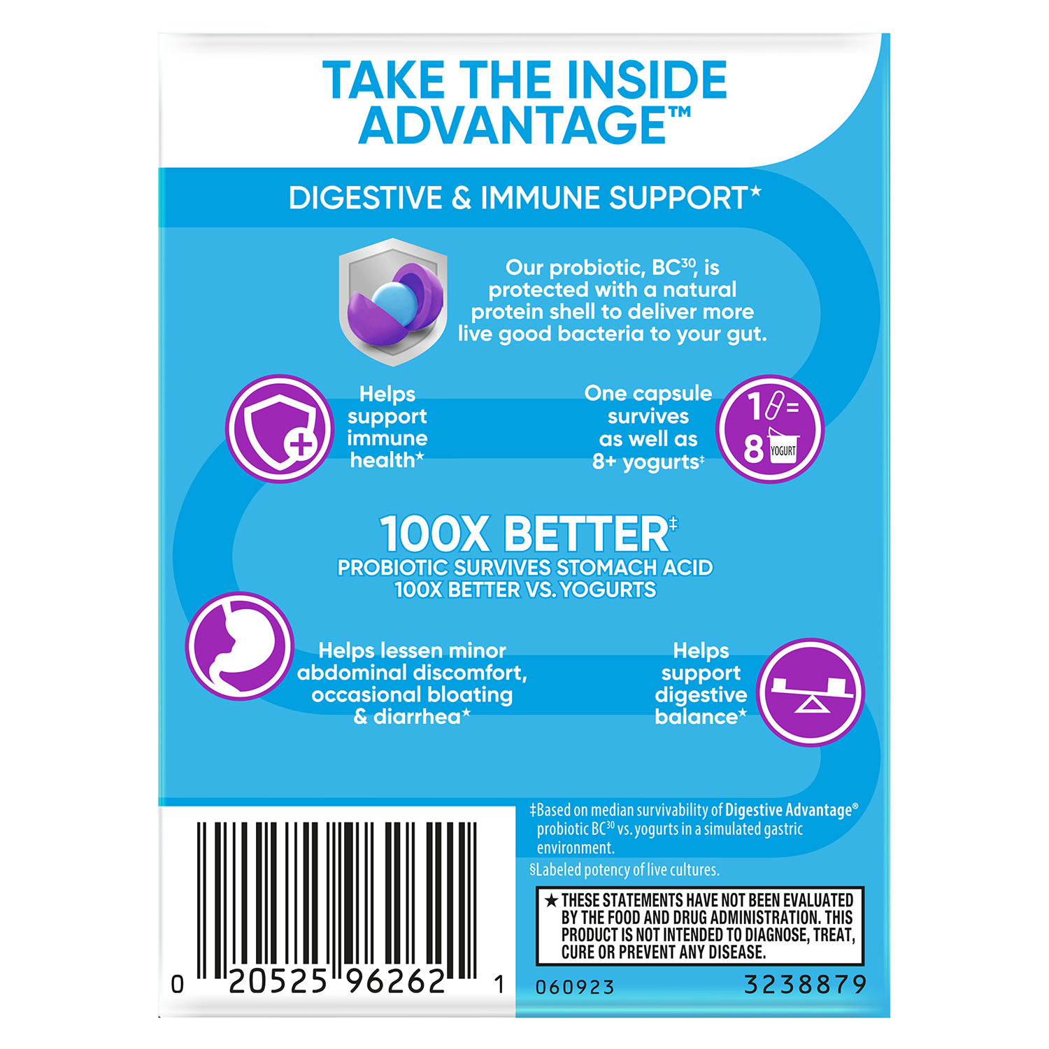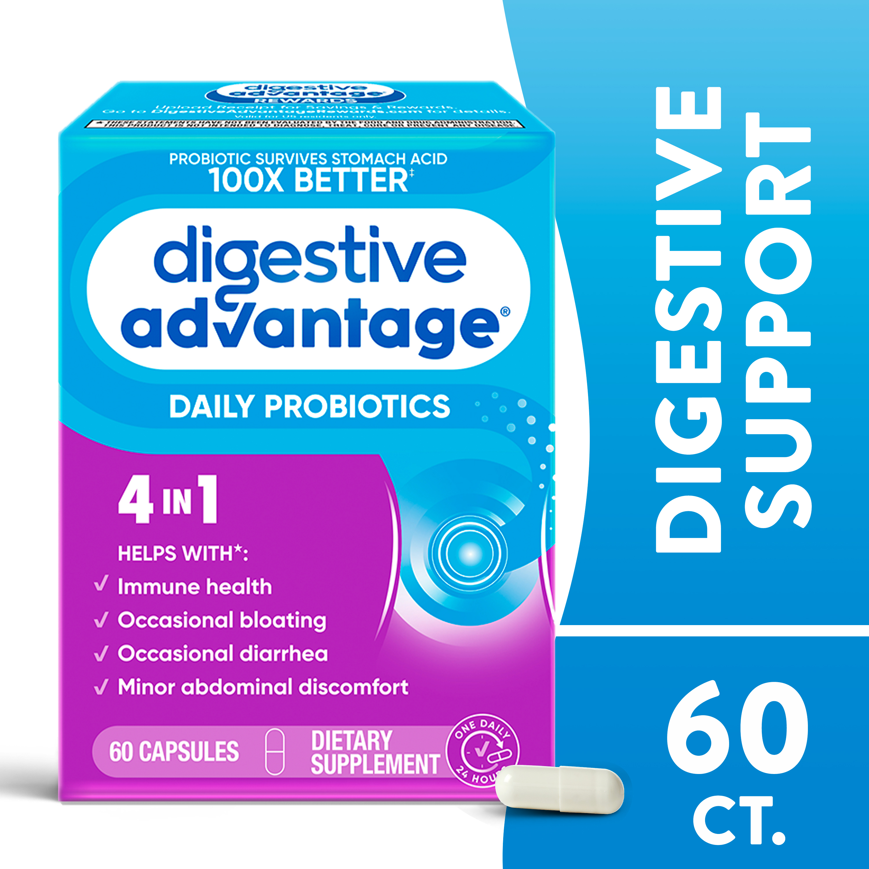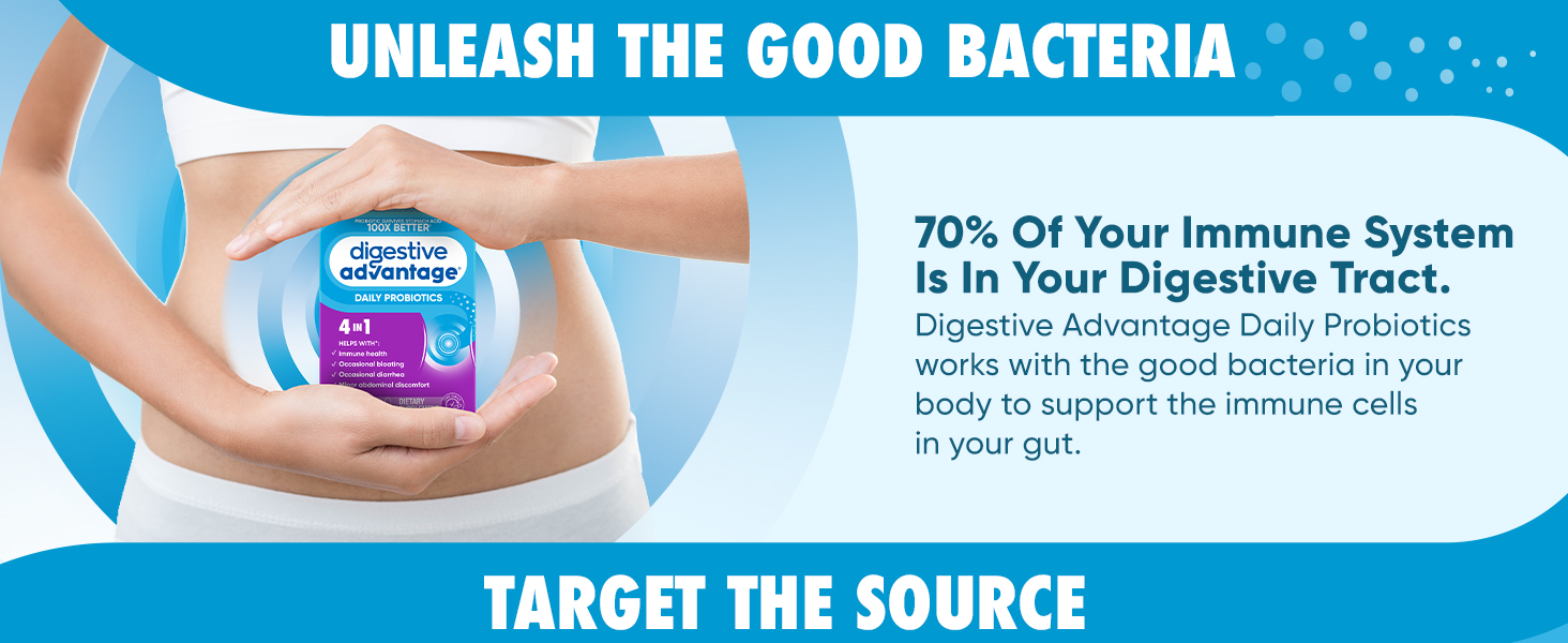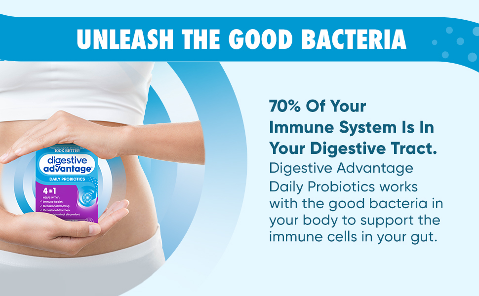 - IMMUNITY: 70% of your immune system is in your digestive tract. The good bacteria in Digestive Advantage Daily Probiotics helps support the immune cells in your gut.