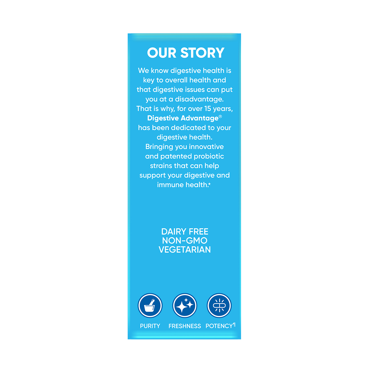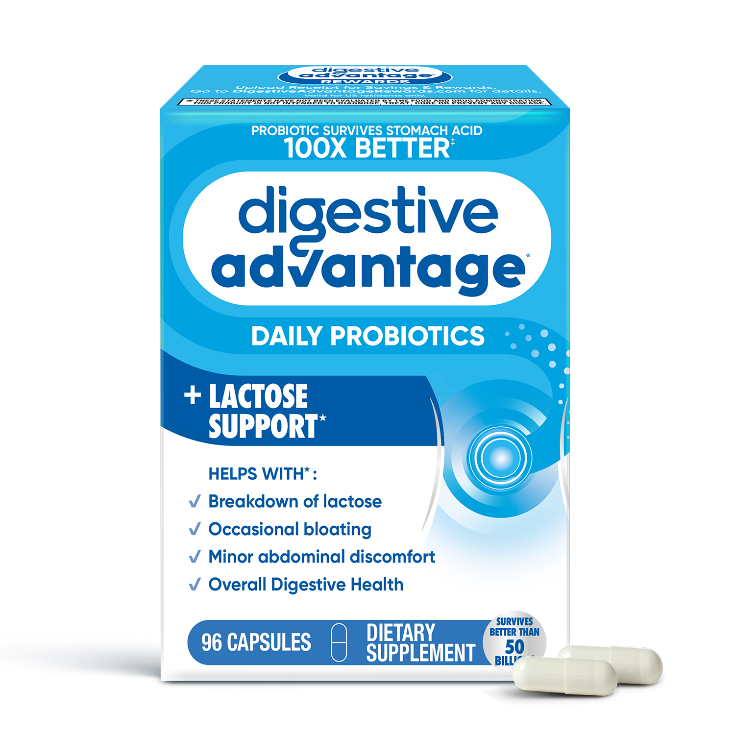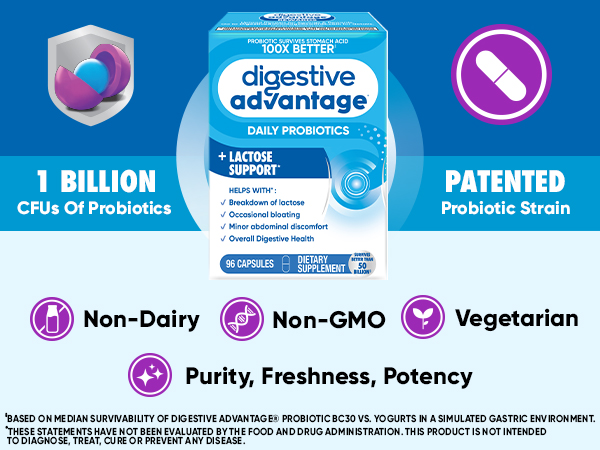 - Digestive Advantage Daily Probiotic + Lactose Support capsules are Non-GMO, Non-Dairy, Vegetarian, and are guaranteed for Purity, Freshness, Potency.