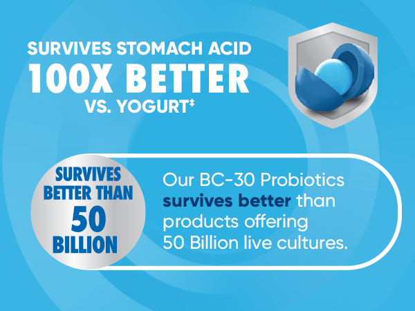 - BETTER THAN 50 BILLION: Our BC-30 Probiotics survive better than products offering 50 Billion live cultures.